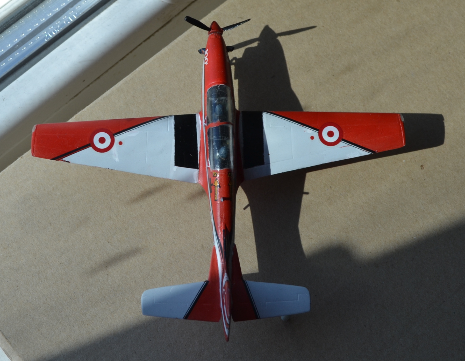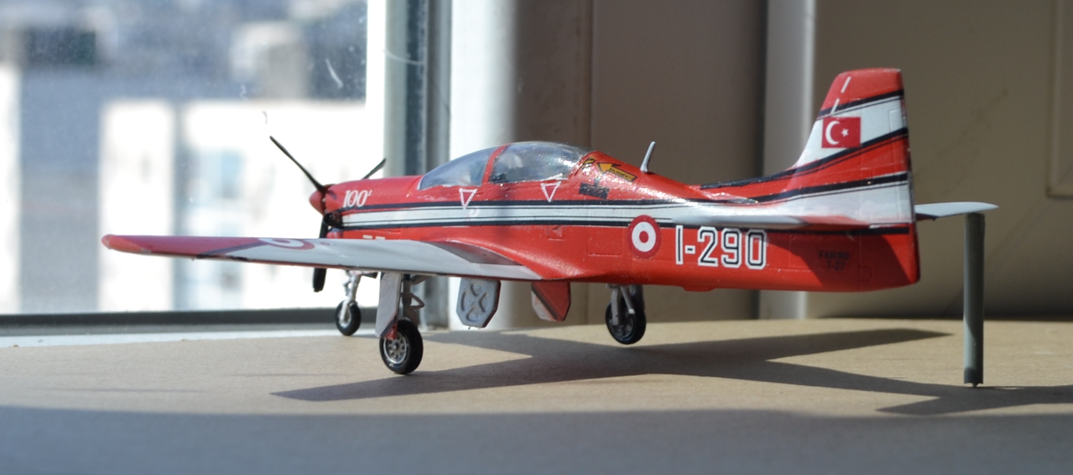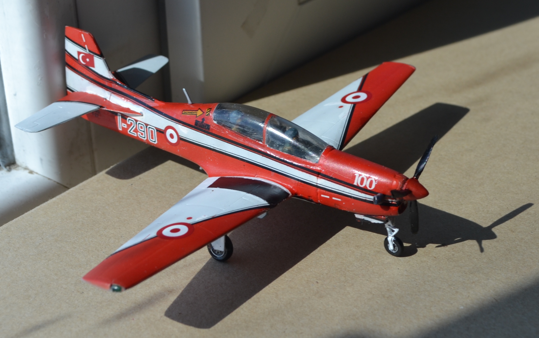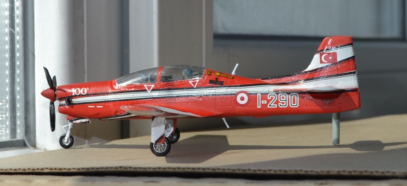 Да, схему окраски модели я выбрал яркую, "пилотажную". Хоть она и предназначалась для Тукана бразильских ВВС, я решил пофантазировать и покопаться в запасах старых декалей, ведь бразильские звёзды украсили другую модель... В результате использовал комплект кокард ВВС Турции, оставшиеся от Фантома. Как мне кажется, красные эмблемы хорошо подошли яркой окраске модели.