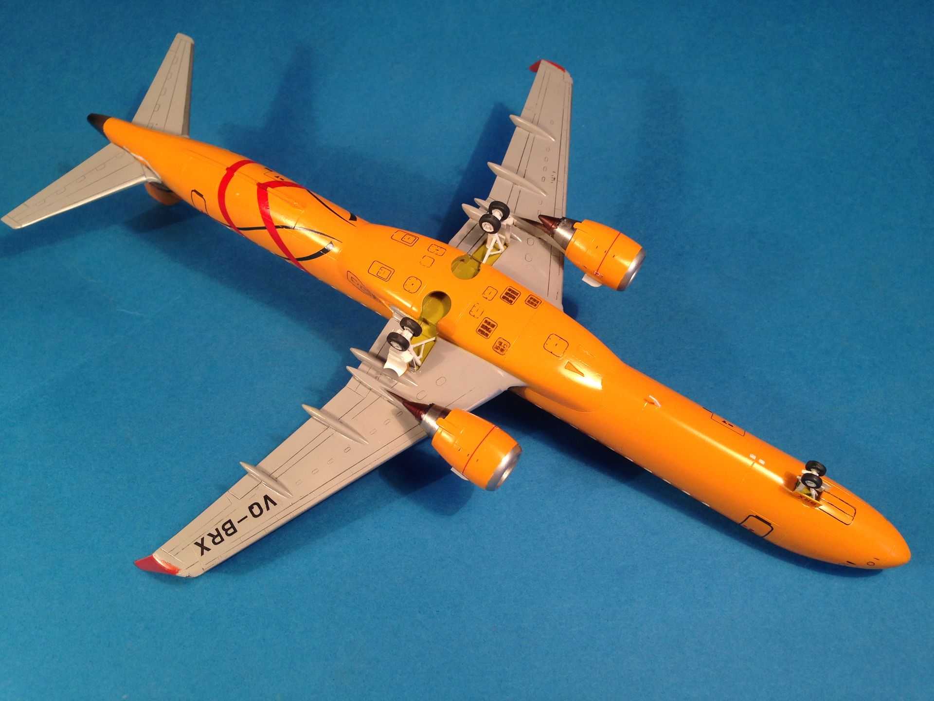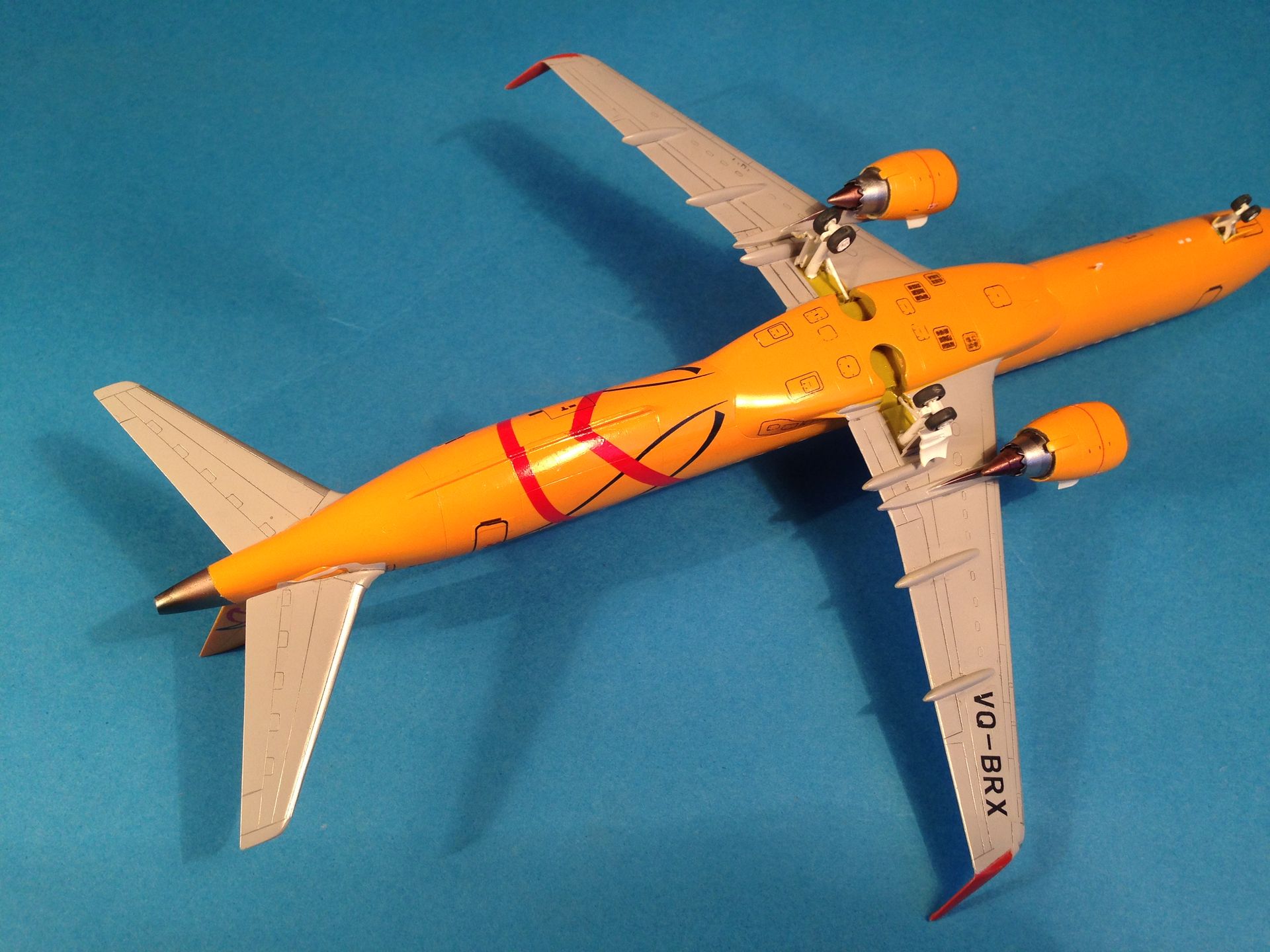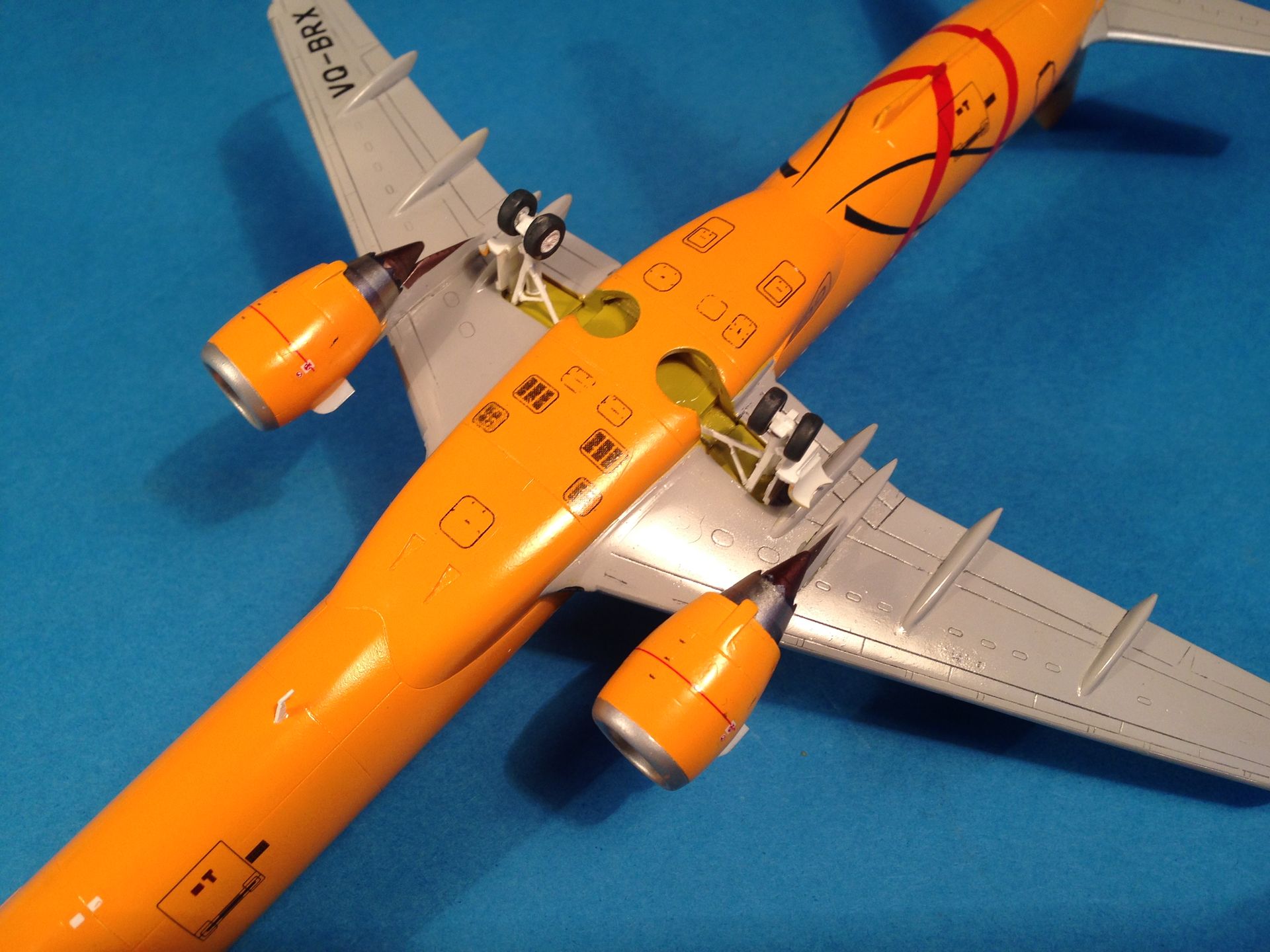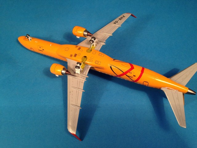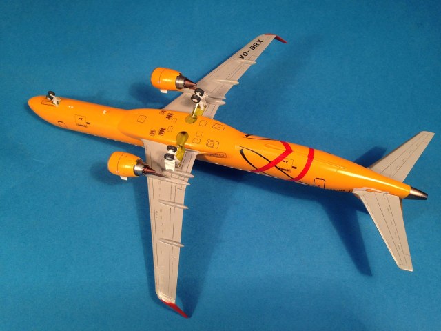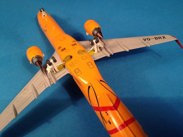 Окраска выполнена эмалями MrColor, фюзеляж - №58 Orange Yellow. Считаю, что в цвет попал идеально. Двигатели и ВСУ - металлики Gunze+тонировка прозрачными лаками Alclad, Смывка легкая, так как самолёты довольно чистые, смывкой Tamya.