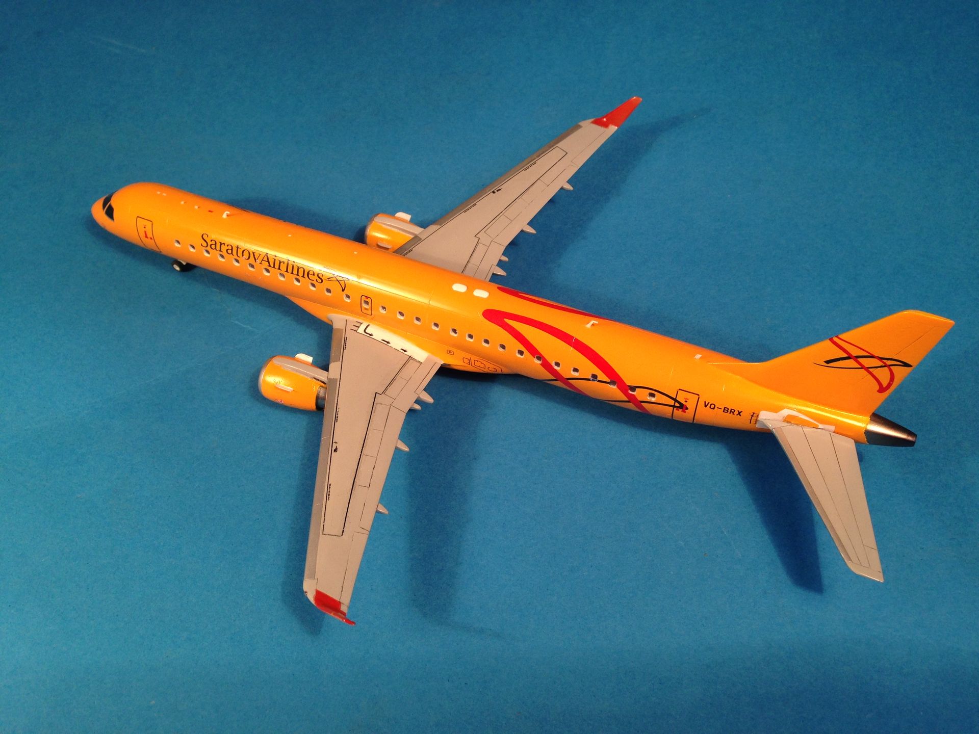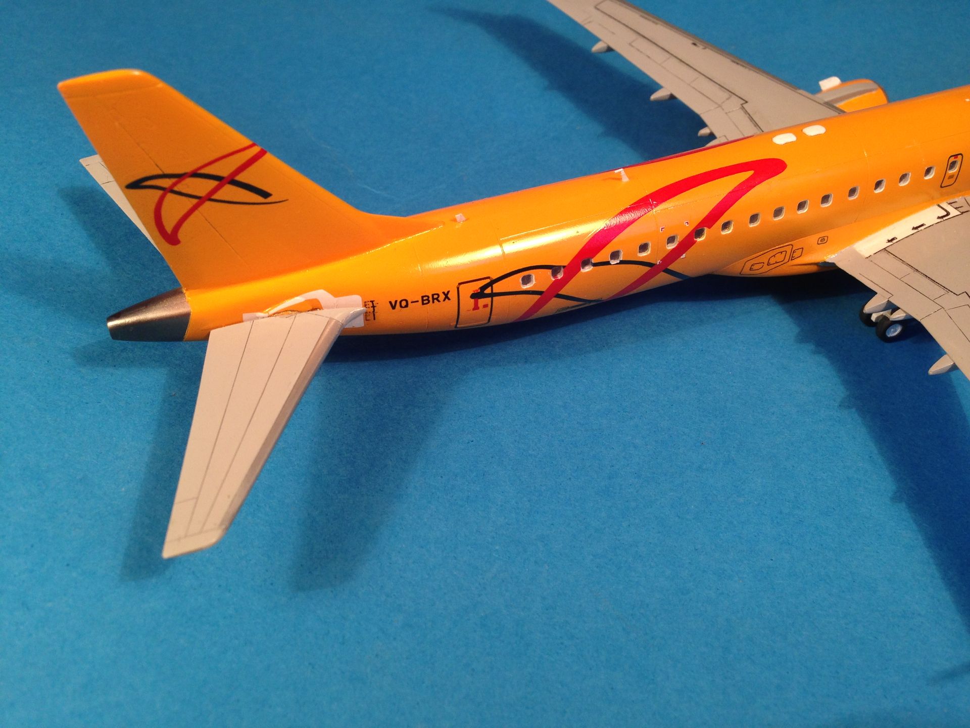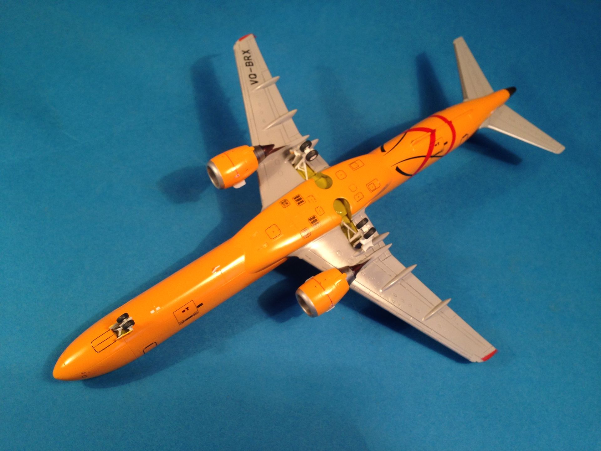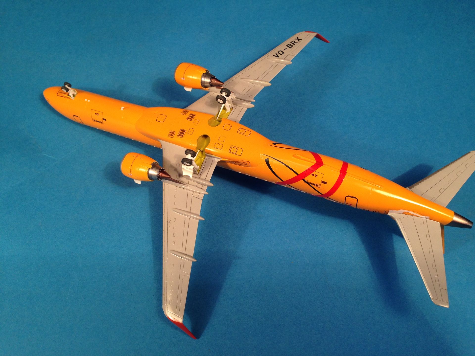 Окраска выполнена эмалями MrColor, фюзеляж - №58 Orange Yellow. Считаю, что в цвет попал идеально. Двигатели и ВСУ - металлики Gunze+тонировка прозрачными лаками Alclad, Смывка легкая, так как самолёты довольно чистые, смывкой Tamya.