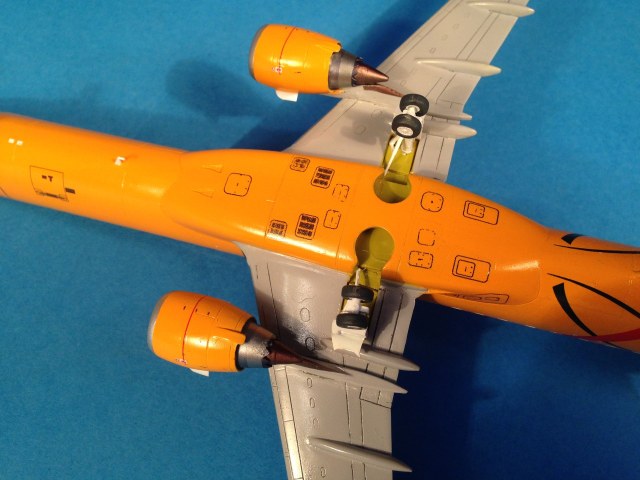 Модель стыкуется идеально. Не понравилась слишком тонкая расшивка на брюхе, которая затерлась при обработке швов и передняя стойка, которую пришлось наращивать. Зато стойки масштабной толщины, и диски колес даны отдельными деталями.