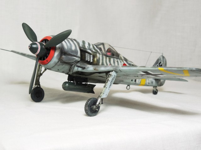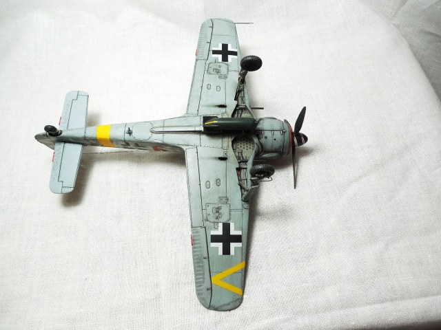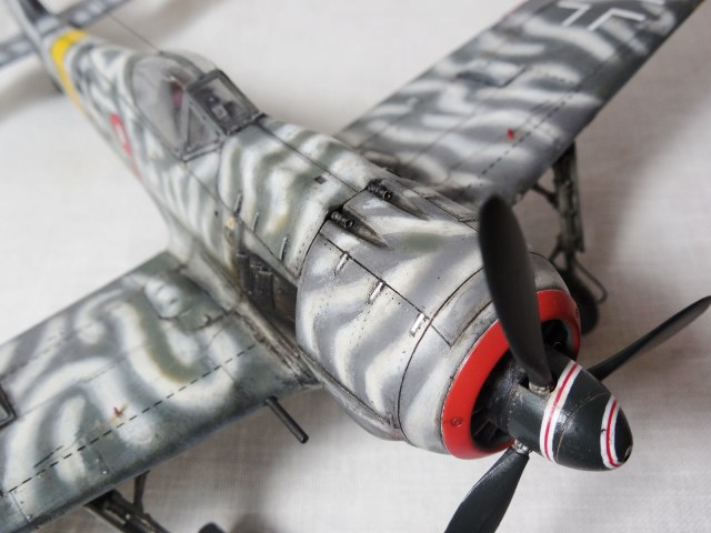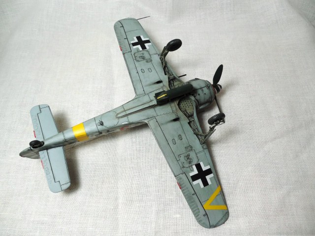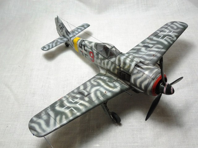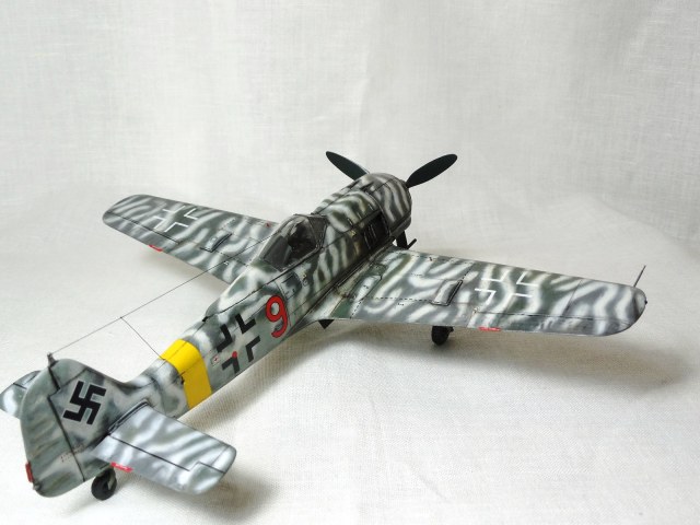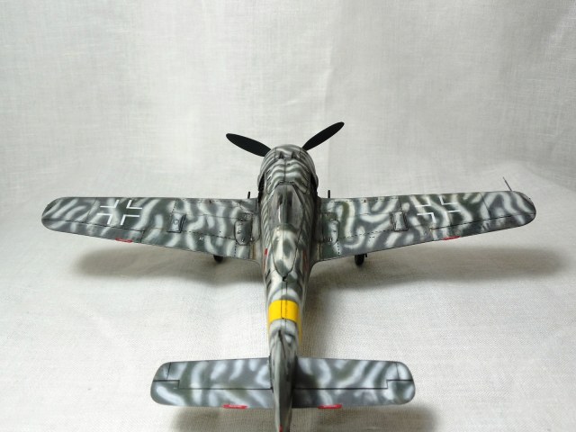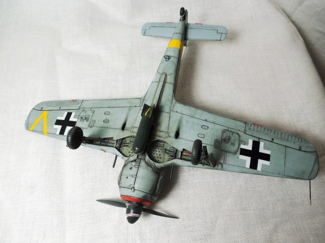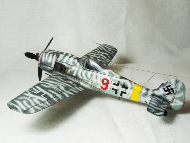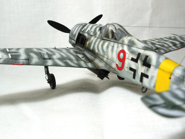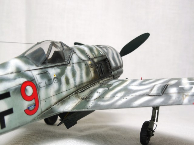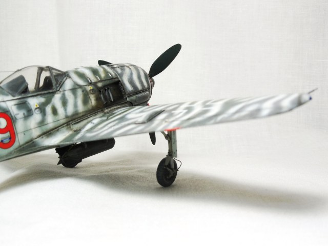 При достаточно высоком уровне покраски резанули глаз идеально чистые декали. Есть много фотографий немецких самолетов в зимнем камуфляже, где ОЗ старательно или не очень обходят стороной. Здесь же явно видно, что 9 клеилась поверх зимнего камуфляжа, чего в целом быть не должно. Кресты на крыльях идеально белые, при имитации загрязнений остальных поверхностей крыла, что тоже вызывает противоречие.