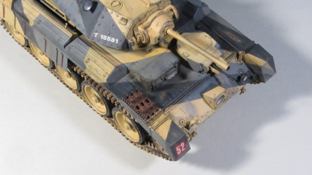 Вопреки инструкции не стал устанавливать забашенный ящик, МКI их не имели. Победить виниловые гусеницы так и не удалось - пришлось закупить металические от Friulmodel. Практически все - изкоробка. Самостоятельно были изготовлены все осветительные приборы на корпусе и прибор наблюдения на башне. Фара на башне от Elf. Восстановлен вид задней стенки башни болтами от Masterclub, слегка доработан механизм поднятия антенны. Сделан раструб выхлопной трубы.