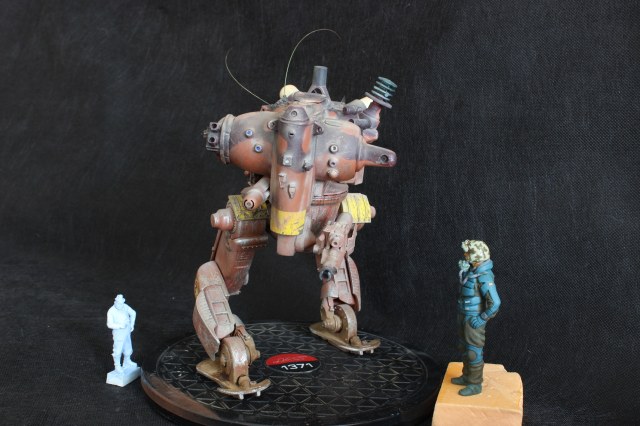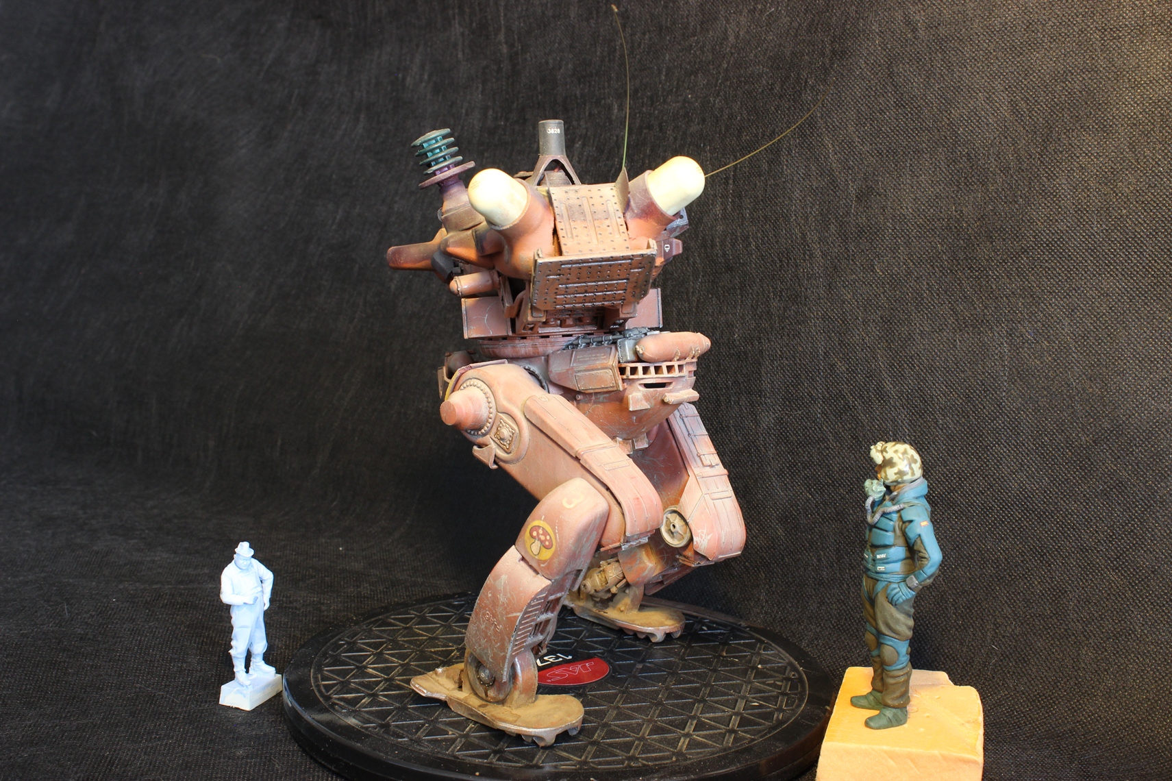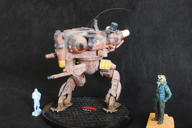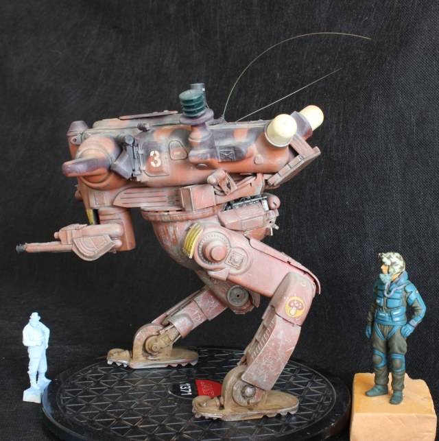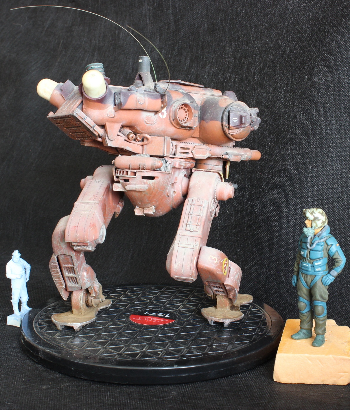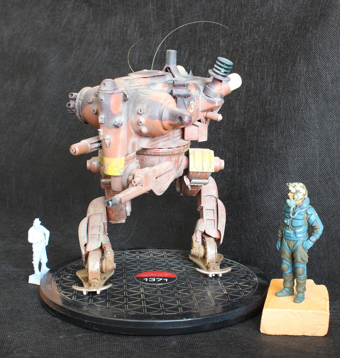 Собиралась вся конструкция на Космофене и саморезах, . Шарниры и "башня" впринципе подвижны. Получился "Цыпленок" немаленький - примерно 17-18 см в высоту. Масштаб классический для этой темы -1 к 20. Живьём-бы эта Цыпа была метра под четыре. Для понимания размера рядом стоят фигурки в 35 - мужик в шляпе и в масштабе 1к 20 - мужик - пилот (оператор) из наборов от Хасегавы. Грунт -тамия нитро, окраска: База -под титан (акрил от пасифика 88), затем химия МИГ для обдирки (чиппинг-эффект чтоли), далее окраска, камуфляж, обдирка в основном нижней части. (по легенде - длительное автономное дежурство на развалинах....ну пусть будет города Сиднея 8) ). затем декали - надписи и эмблемы пордразделения "Мухомор" взял у Хасегавы. Далее небольшая тонировка миговскими эмалями, затем пыль - пигменты и потёки от ГСМ от Мига.