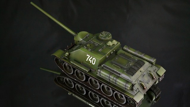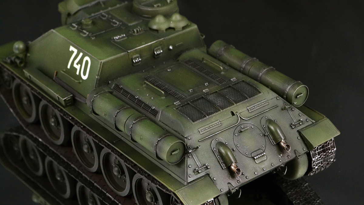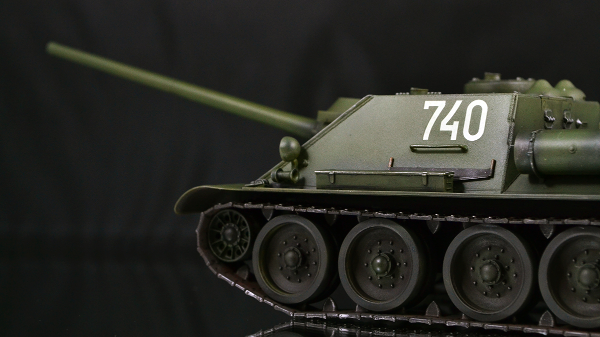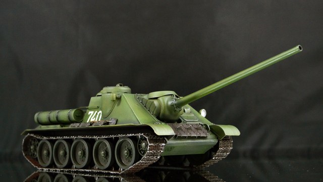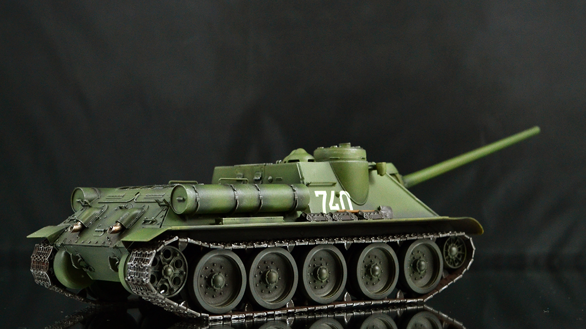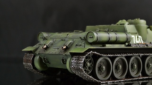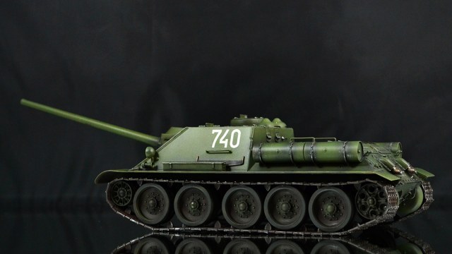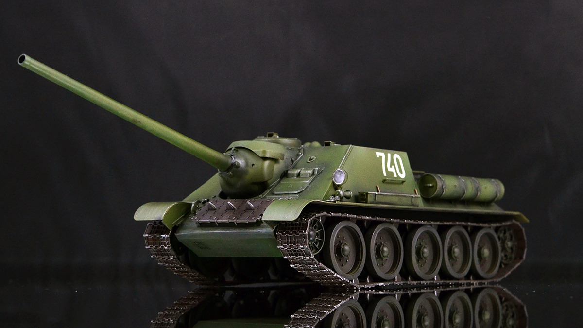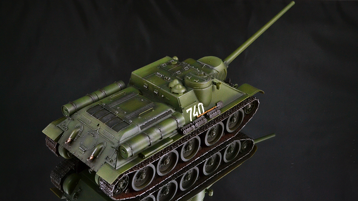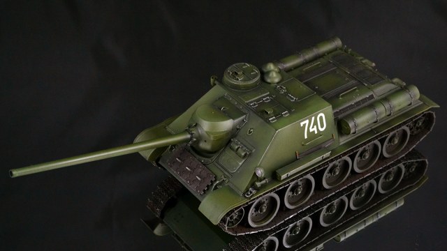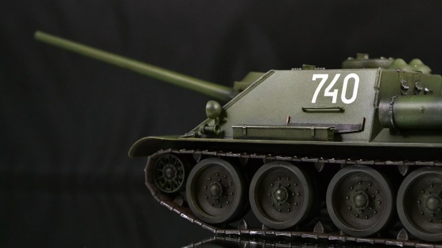 Что хочу сказать в итоге. Опыт крайне интересный. Вроде та же пластиковая модель, но ничего общего с тем, что я делал ранее. В силу того, что бОльшую часть элементов везеринга я делать банально не умею, решил изобразить СУ-100, которая не катается по полям, а стоит в части в ангаре в ожидании проверок всяких разных генералов :)