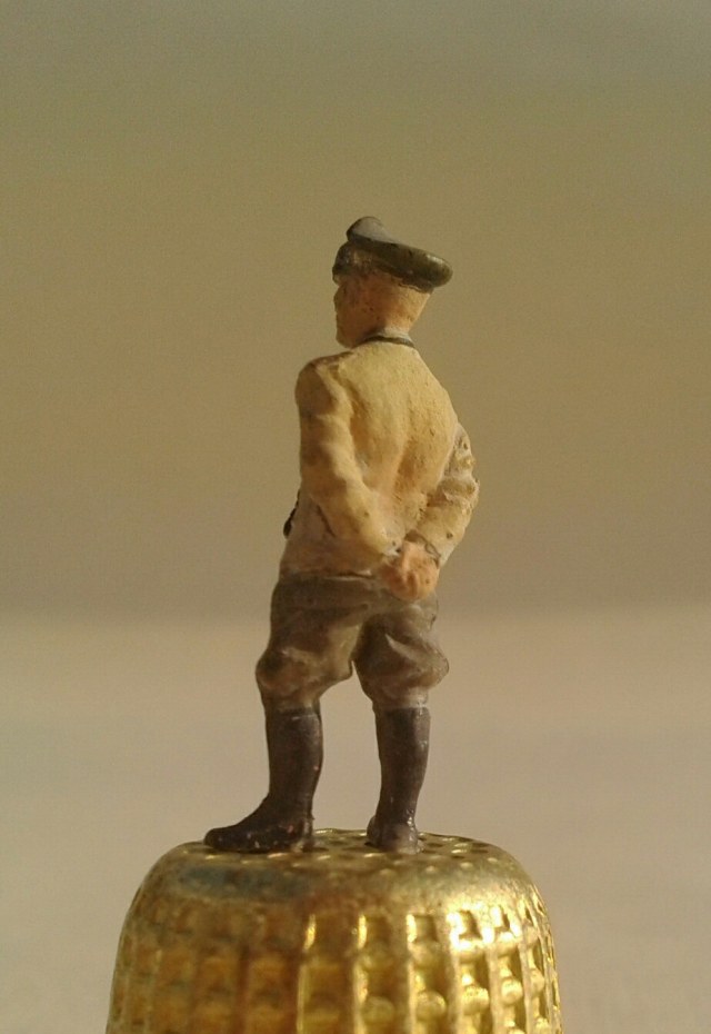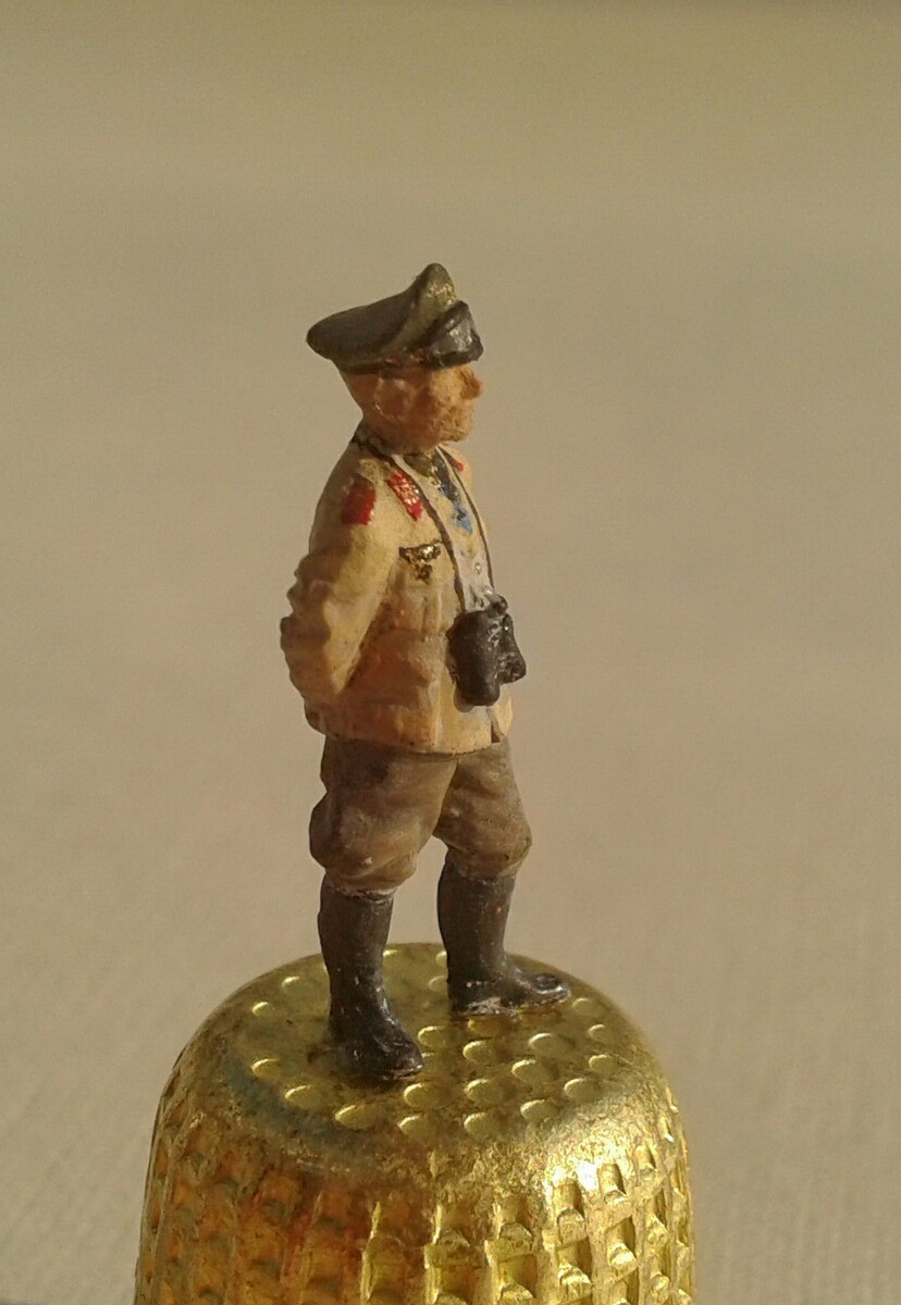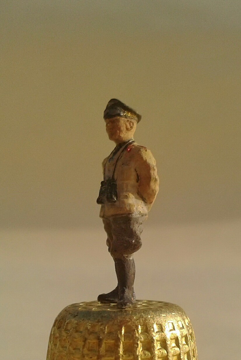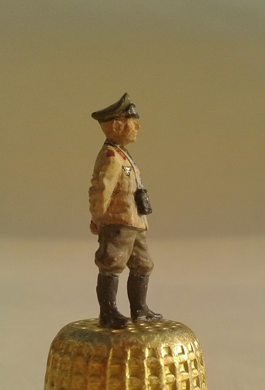 В основе этого образа - смоляная копия пластиковой фигурки из набора Roco Minitanks #271 Heeresfuhrer ll. Weltkrieg. Набор сейчас редкий, московские энтузиасты растиражировали его для нуждающихся. Отливка хорошая, не слишком хрупкая, поддаётся обработке. Но фигура, естественно, унаследовала пропорциональные ошибки оригинала, так что в будущих диарамах некоторых ракурсов придется избегать.