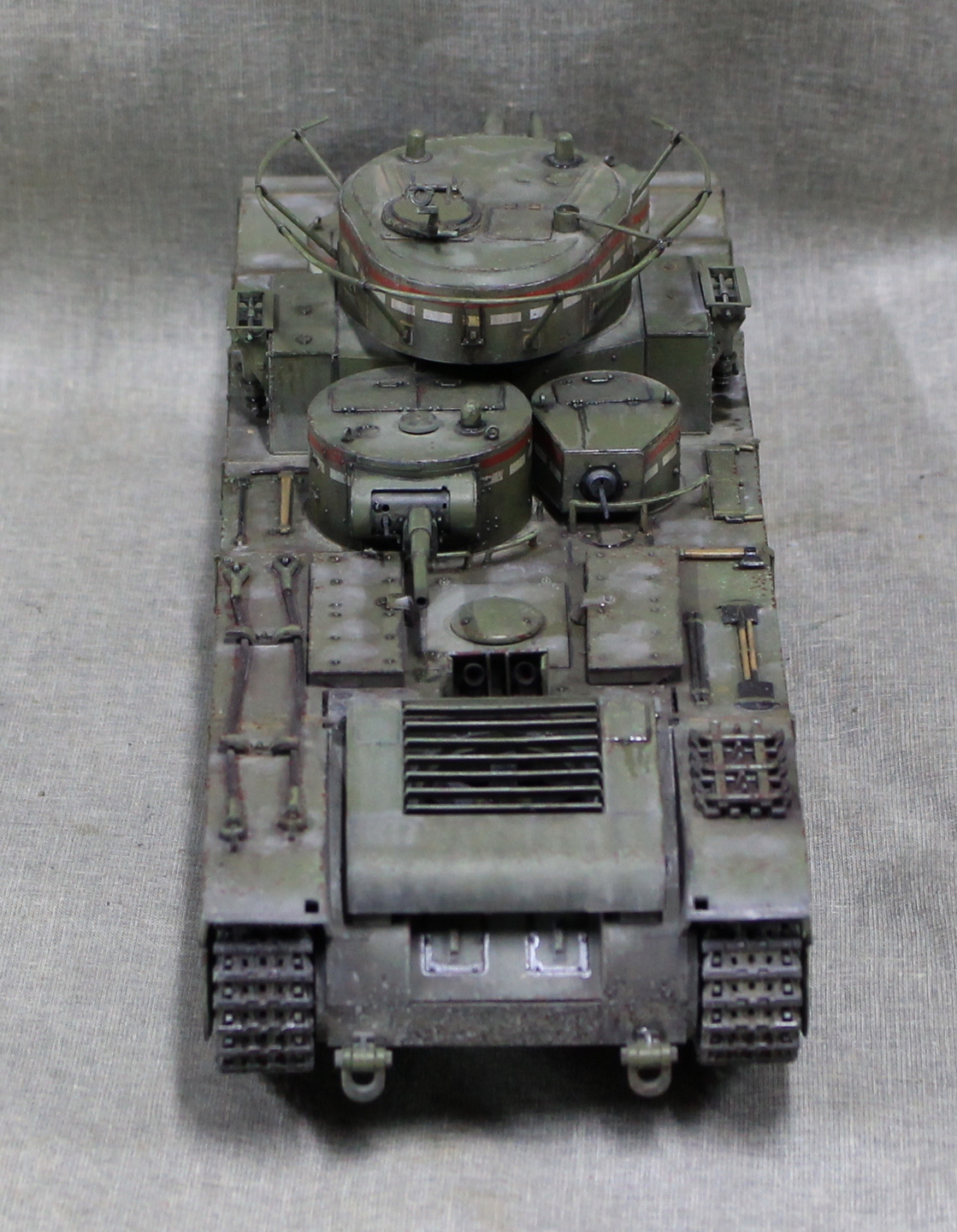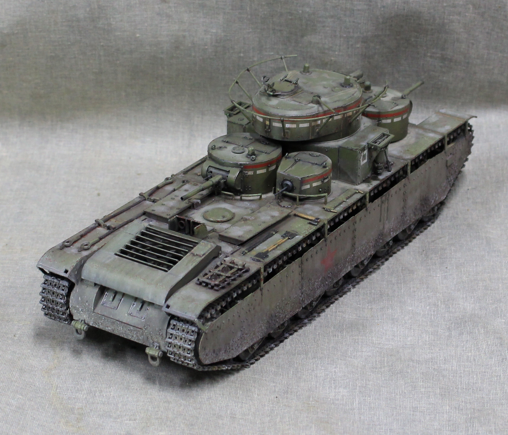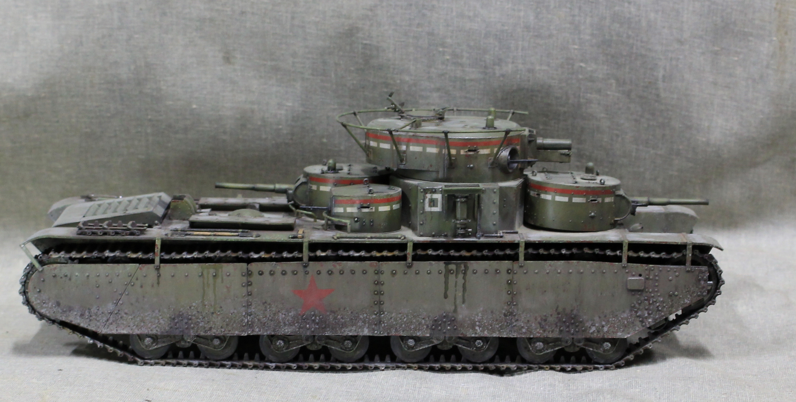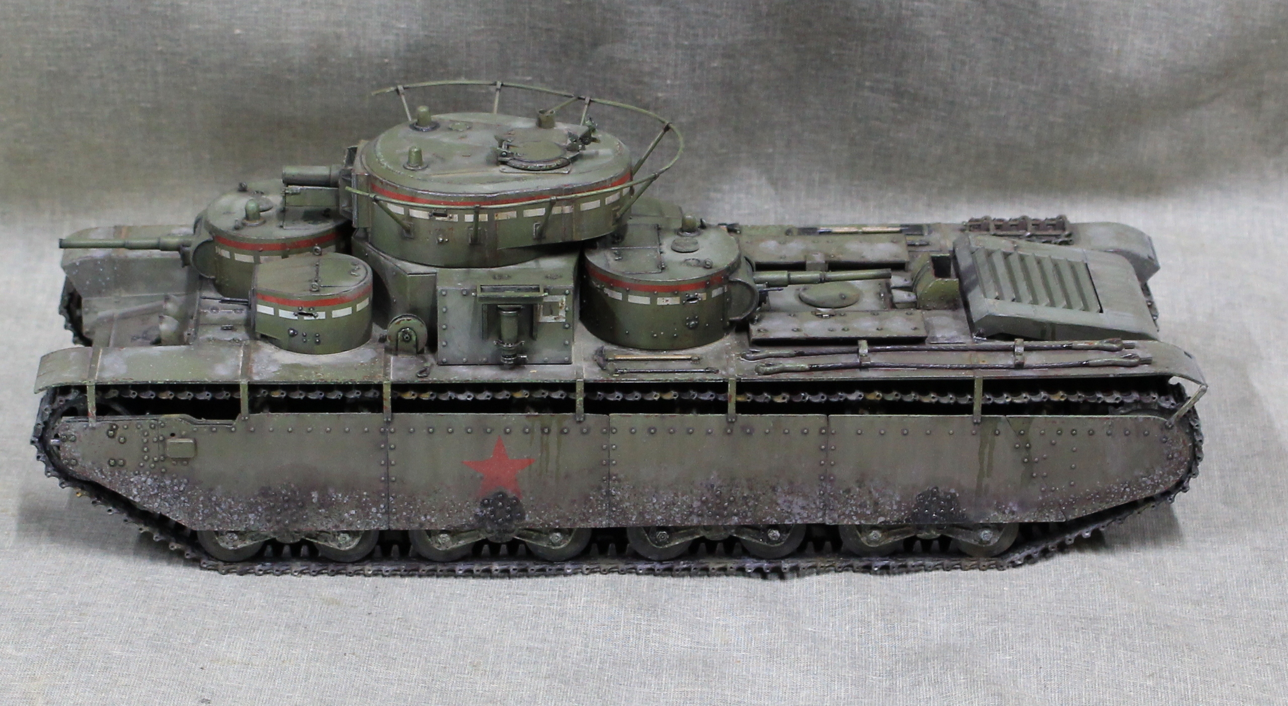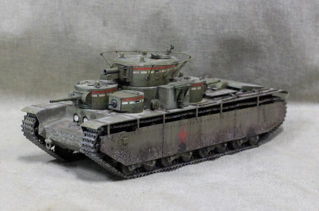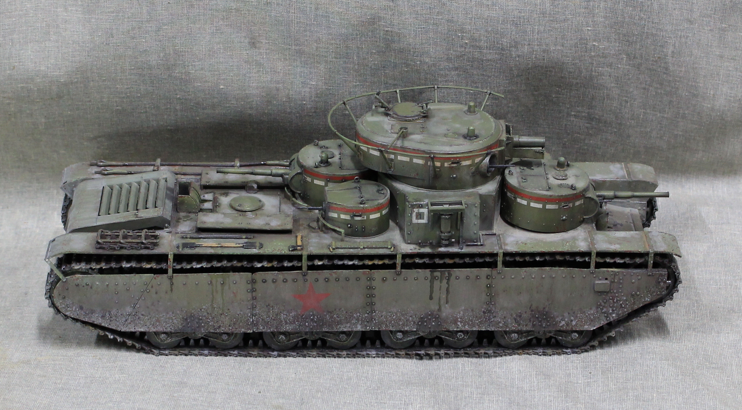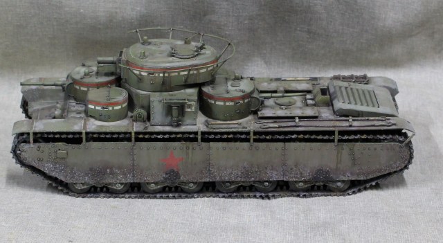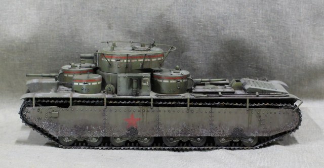 Собиралась модель вобщем нормально, немного не стыковался верх и низ корпуса, думаю, это я накосячил, на 1.5 мм уехало все, верх корпуса был загнут дугой, скорее всего это отразилось на длинне этой детали. Плохо вставала турель пулемета в башню, образовывалась щель, закрыл сварным швом. Вообще модель нормальная, больше всего матерился собирая башни, площадь контакта половинок башен настолько маленькие, что я чуть не разбил танк об стол, в порыве праведного гнева.