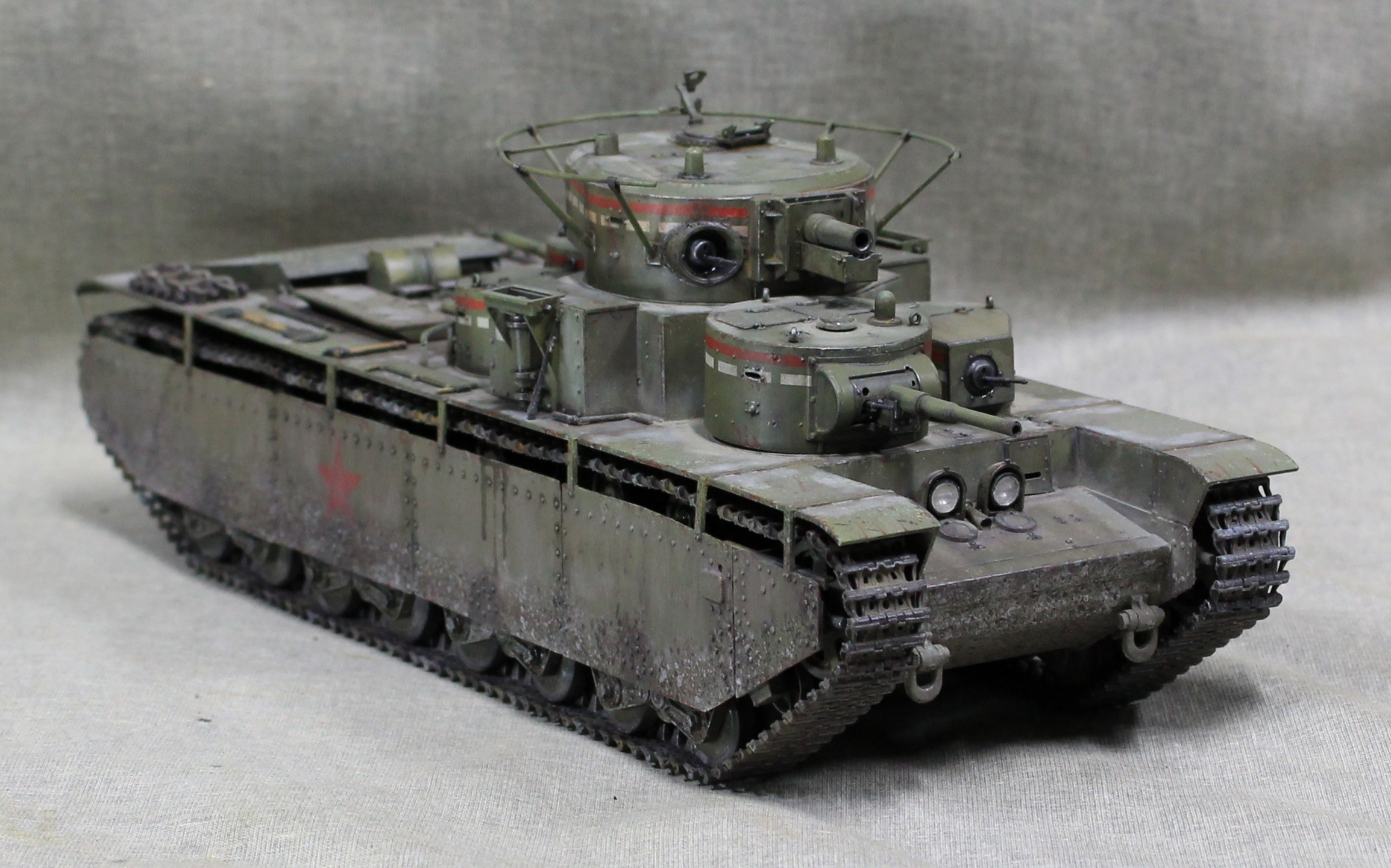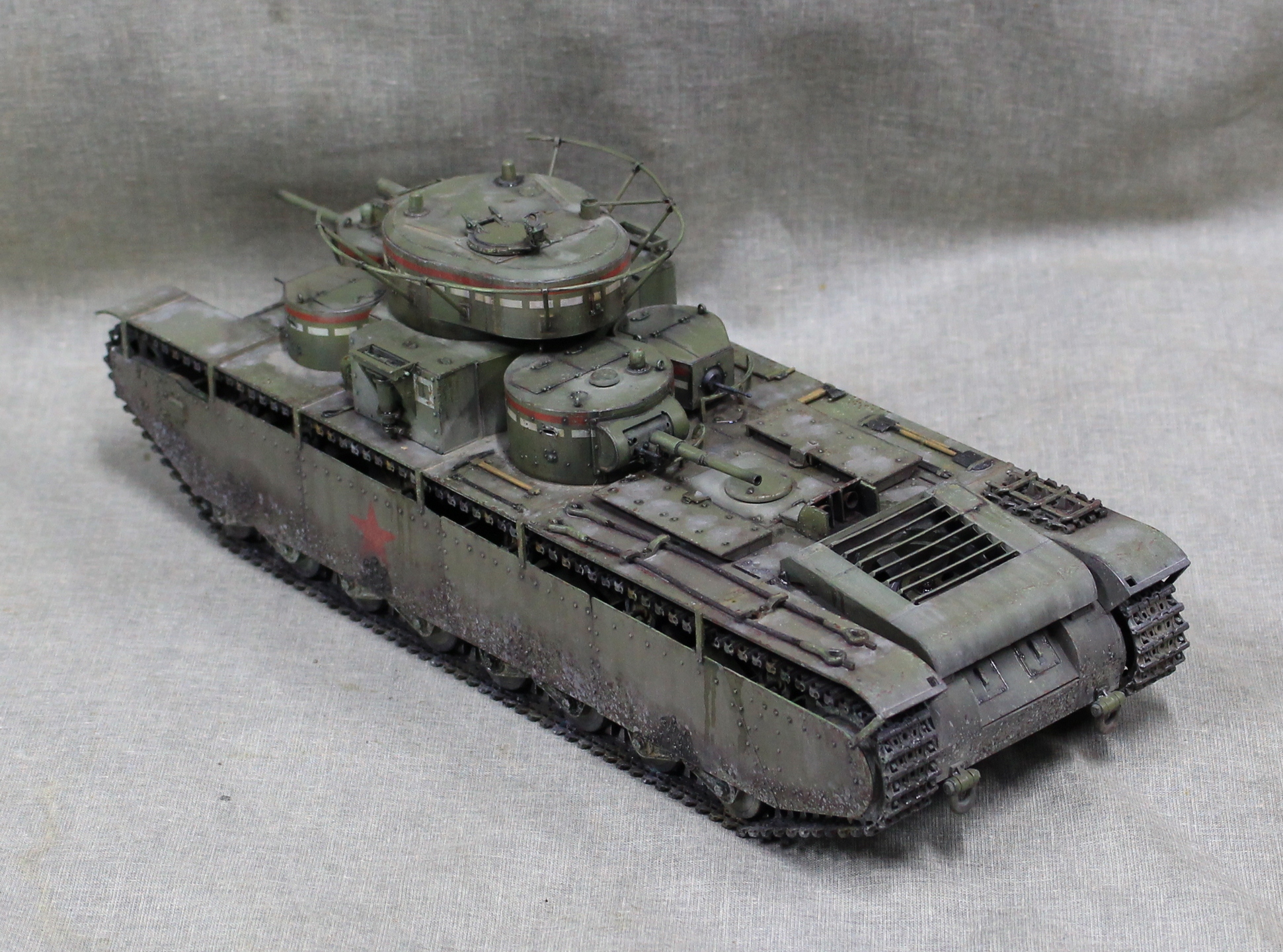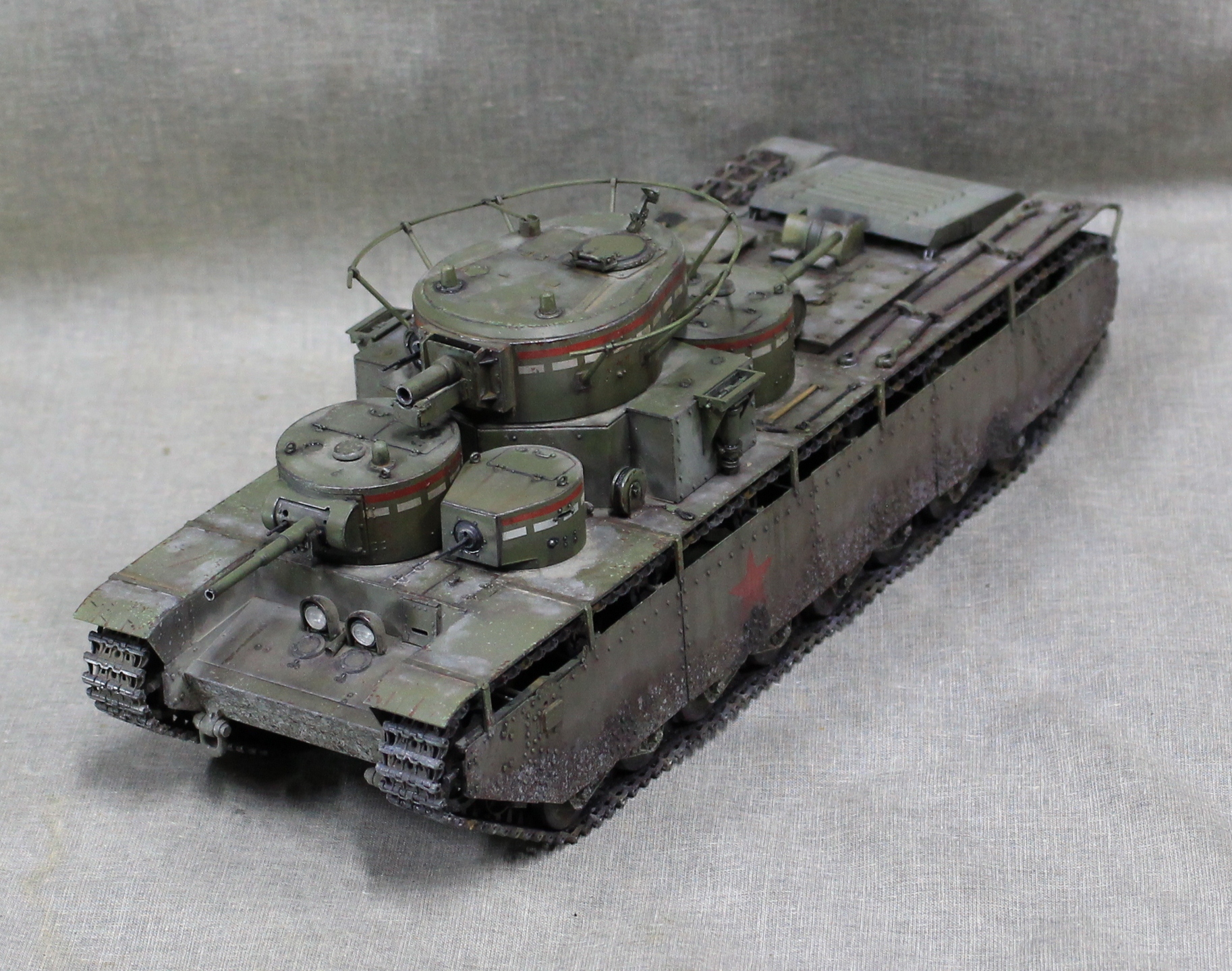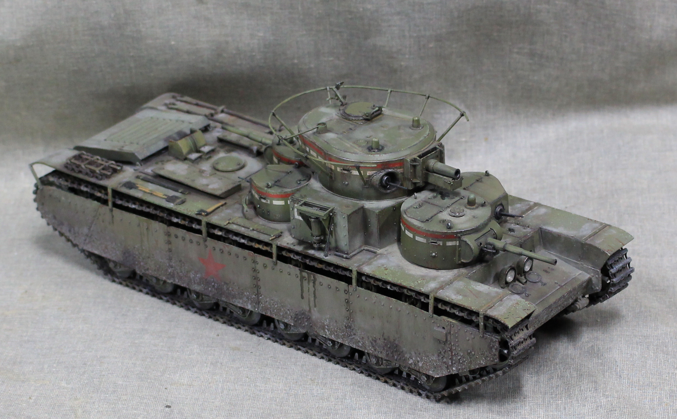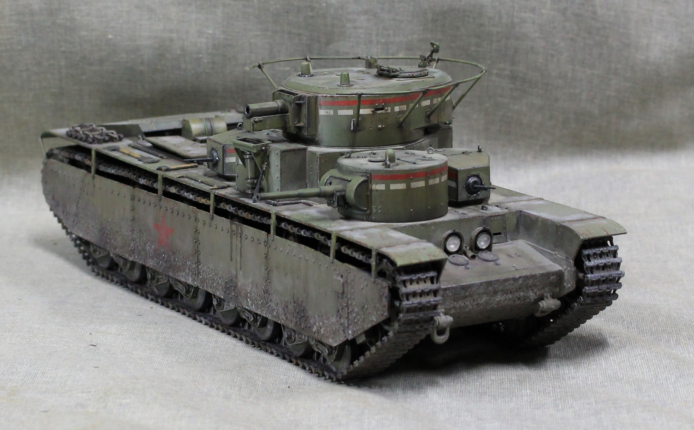 Собиралась модель вобщем нормально, немного не стыковался верх и низ корпуса, думаю, это я накосячил, на 1.5 мм уехало все, верх корпуса был загнут дугой, скорее всего это отразилось на длинне этой детали. Плохо вставала турель пулемета в башню, образовывалась щель, закрыл сварным швом. Вообще модель нормальная, больше всего матерился собирая башни, площадь контакта половинок башен настолько маленькие, что я чуть не разбил танк об стол, в порыве праведного гнева.