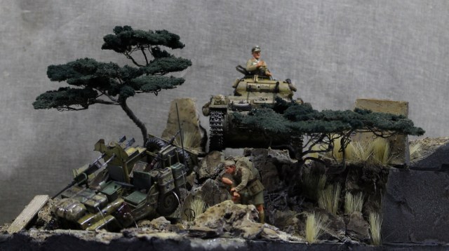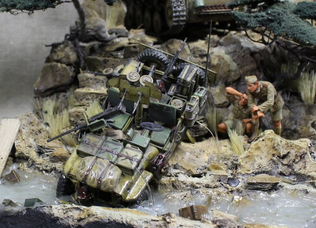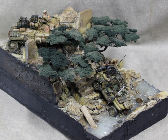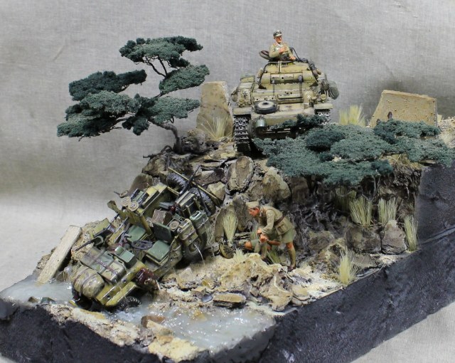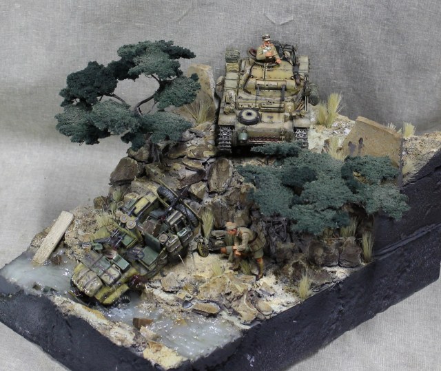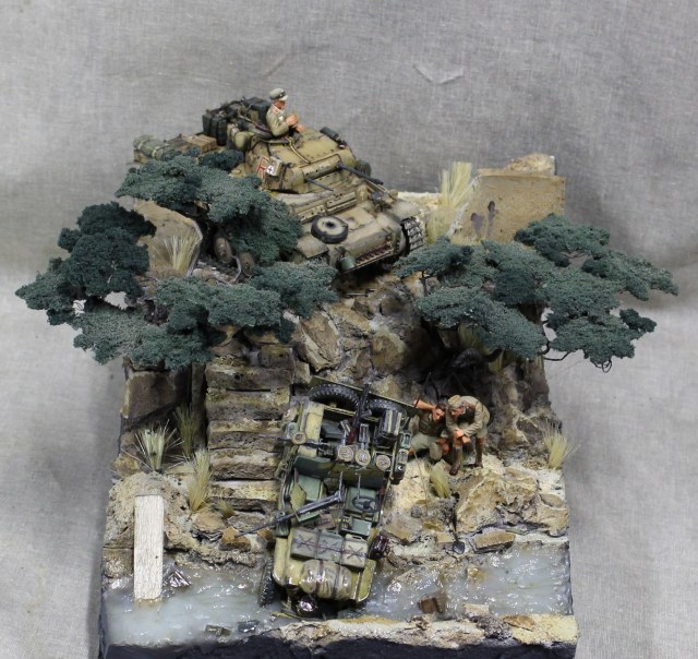 Легенда: немецкой колонной была замечена разведмашина британцев. Машина была обстреляна из пулемета, при попытке скрыться, водитель не справился с управлением протаранил ограждение и угодил в ручей, экипаж убежал. Один танк из сопровождения выдвинулся на место, что бы немного помародерить, глядя в спины сверкающих пятками разведчиков.