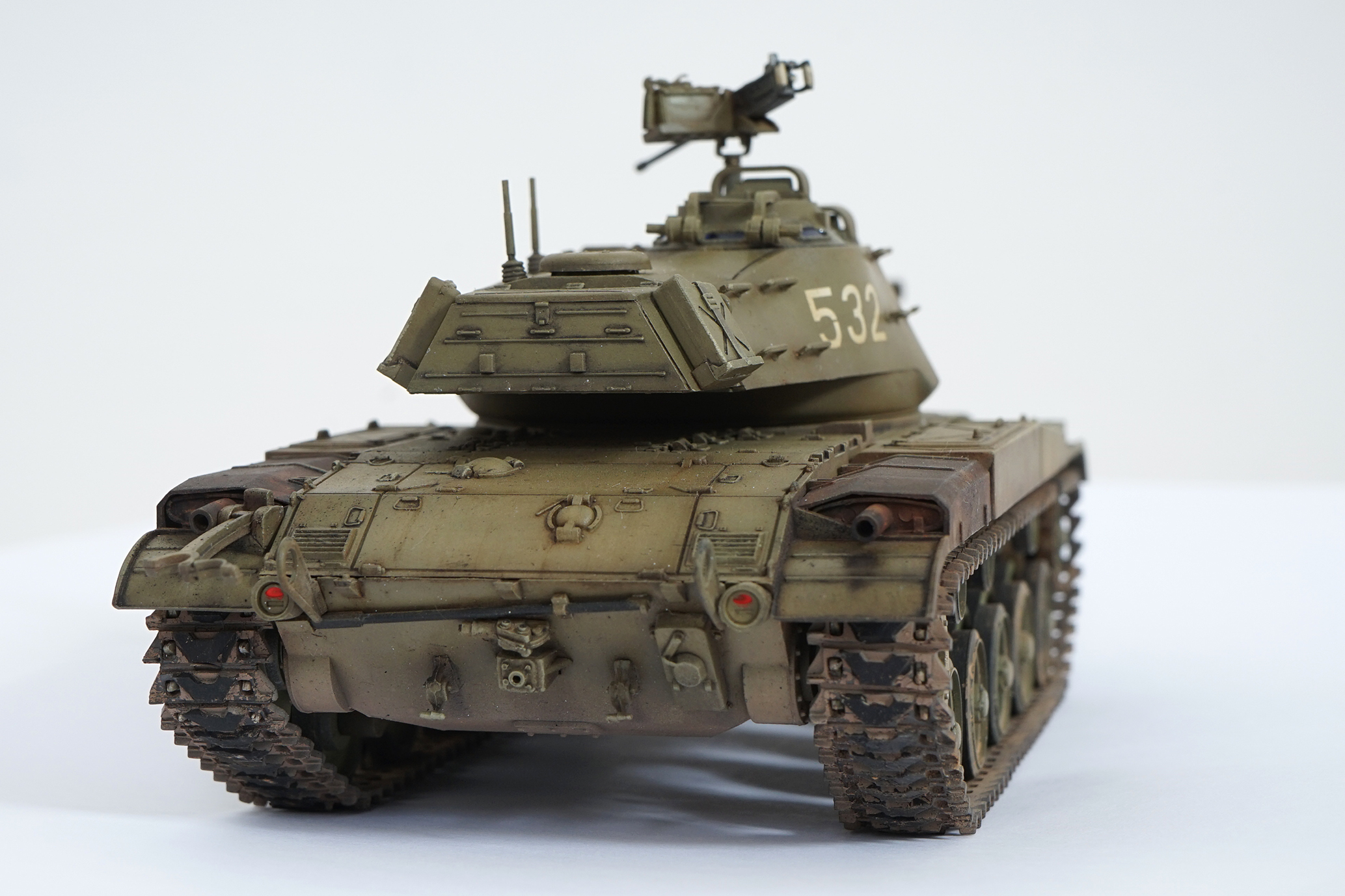 Эта древняя дубовая модель требует множества доработок. А так её даже собрать аккуратно не получилось: щели на башне и корпусе, незачищенные литьевые швы на мелких деталях, дыры вместо триплексов мехвода. Покрашенные краской стека фар - ну это вообще из разряда начинающих. Единственно, что понравилось и привлекло внимание, это оттенок ржавчины на глушителях. Тут же смотрим дальше - так поржаветь защитные кожухи над глушителями не могли, видна их немасштабная толщина, выхлопные трубы опять же немасштабно толстые, неубранные следы толкателей. Тут же рядом неаккуратно покрашенный стоп-сигнал. И это всё в одном месте. Так что, извините, до Галереи тут очень далеко.