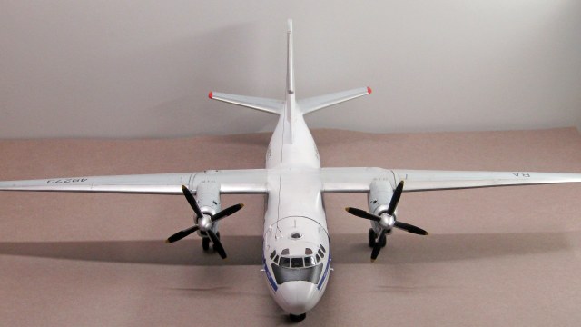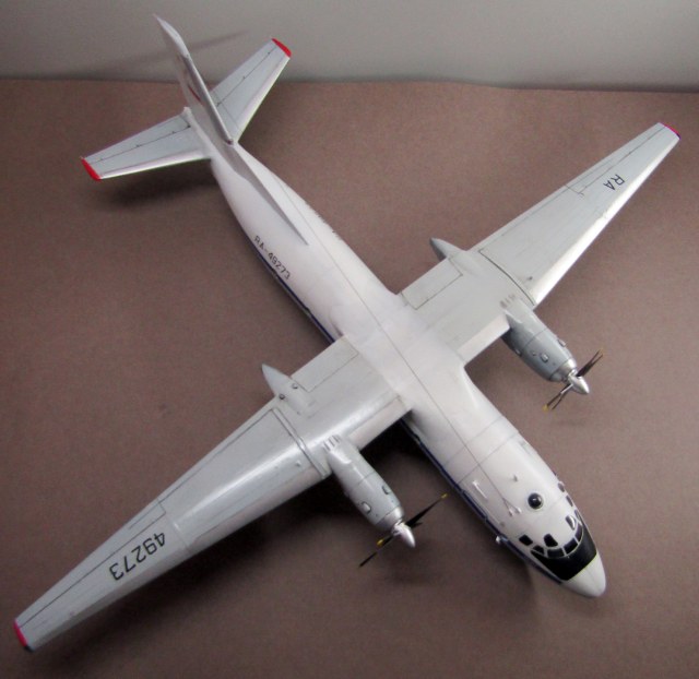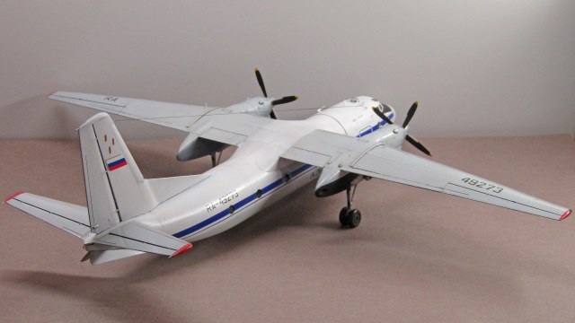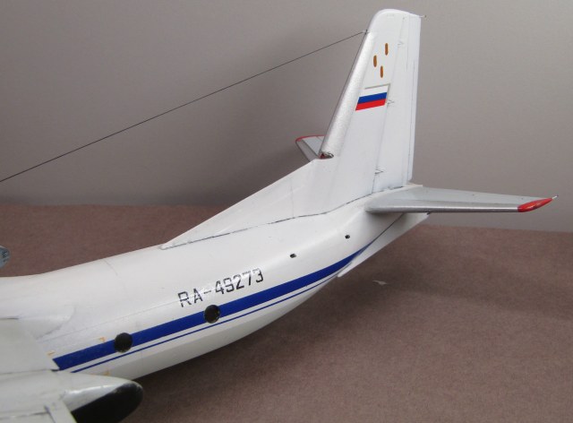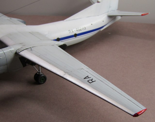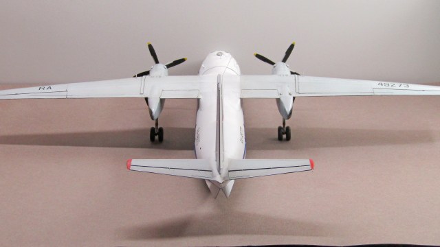 Ан-24Т и РТ имеют удлинённый форкиль, который доходит до середины хорды центроплана. Обшивка над центральными закрылками не гладкая, а имеет ребра жесткости. Это всё-таки не рядовой Ан-24, а перевоплощение в Ан-26...
