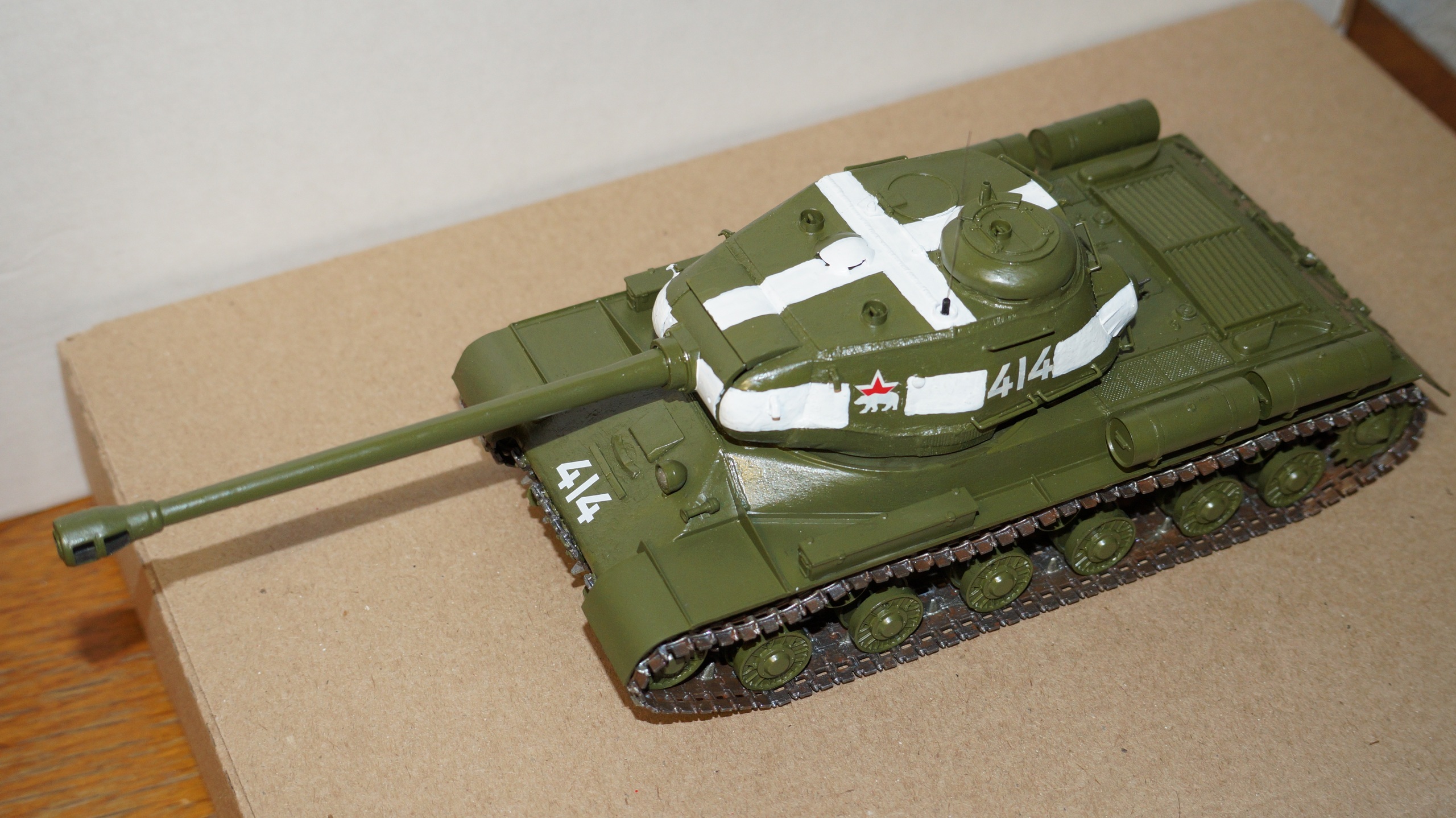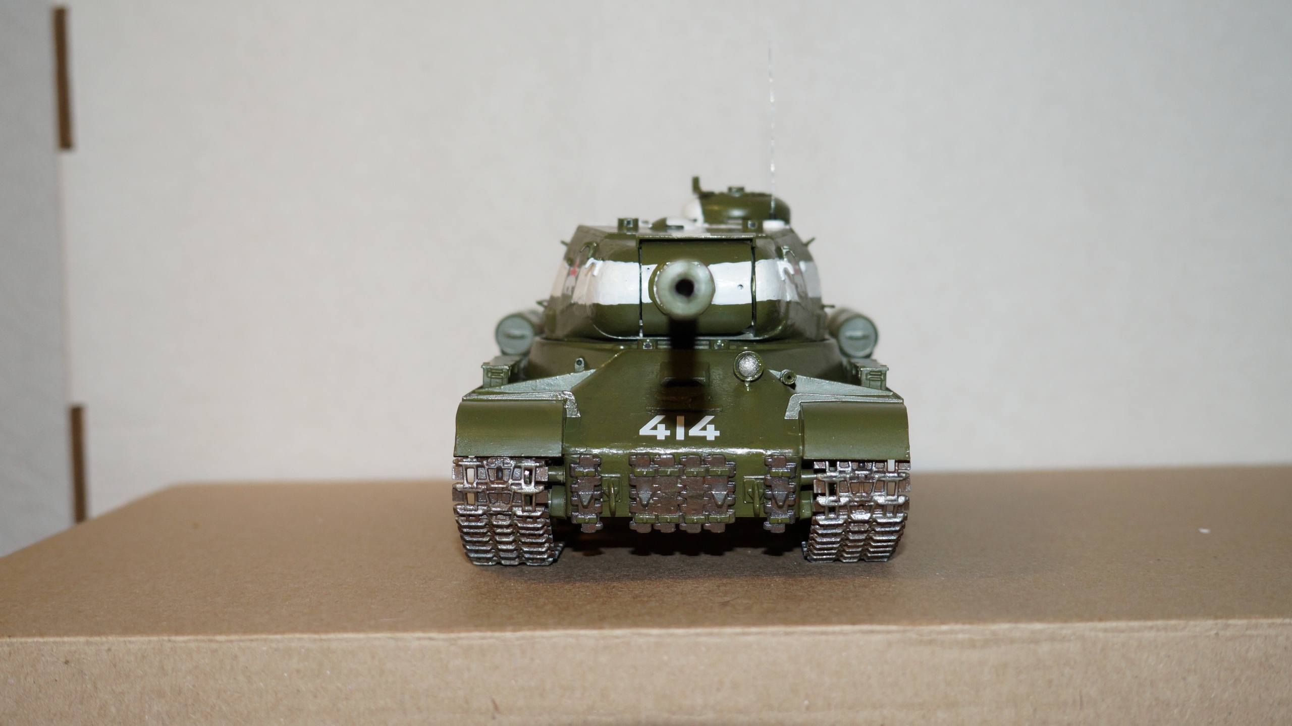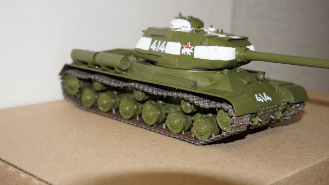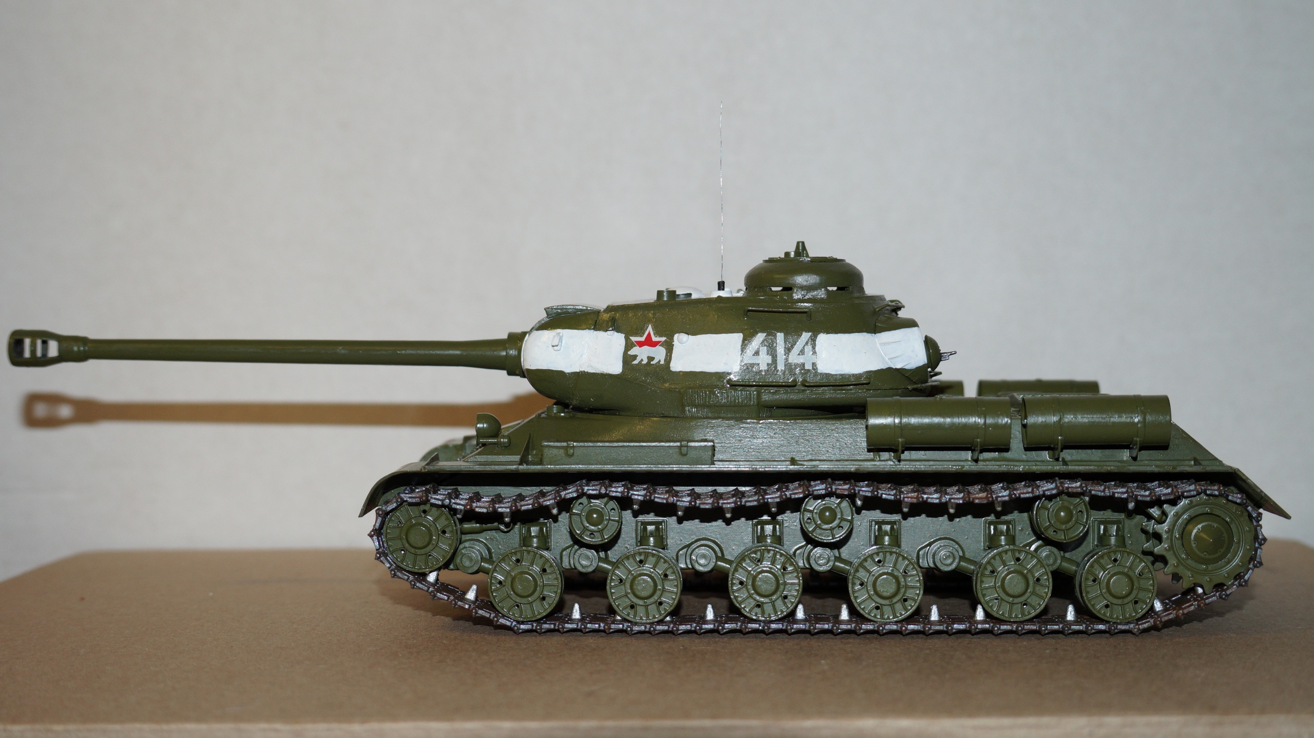 Доброго времени суток!Размещаю модель танка ИС-2 от "Звезды". За основу взял танк 7-й гвардейской тяжелой танковой бригады из Берлина 1945 года. При сборке не ставил своей целью делать модель похожей на настоящий танк, до этого я еще не дозрел. Моей целью было сделать, так сказать, красивую игрушку. Насколько у меня это получилось - судить вам, посетителям сайта.Вообще эта модель была собрана мною еще году так в 2006 и в настоящий момент приведена в божеский вид. Какой она была до улучшения показано на четырех последних фотографиях. Корпус и башня не покрашены, пулемет без кончика ствола и покрашен убого, гусеницы виниловые, да и сама модель не вполне соответствует танку ИС-2. В те далекие времена такой вид меня вполне устраивал, сейчас - нет. В процессе улучшения сделал следующие изменения: покрасил корпус и башню модели краской MR Hobby, виниловые гусеницы заменил на сборные траки от MSD (кстати стыкуемость траков просто замечательная, пилить, подгоняя их один к другому, не надо), гудок и место в корпусе для курсового пулемета рассверлил, поставил отломавшуюся фару, сделал антенну, а также переделал командирскую башенку (из многогранной сделал круглую) и переделал передок корпуса (смотровую щель с ее защитными элементами перенес выше где они и должны находиться, добавил длинную планку). Новые гусеницы окрашивал акриловыми красками от "Звезды" вороненая сталь, ржавчина, сталь. Модель окрашивал кистью. Пулемет убрал, а новый ставить не стал - уж больно пулемет из коробки убого выглядит.