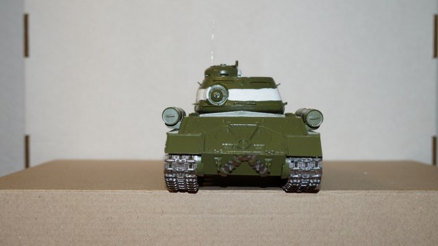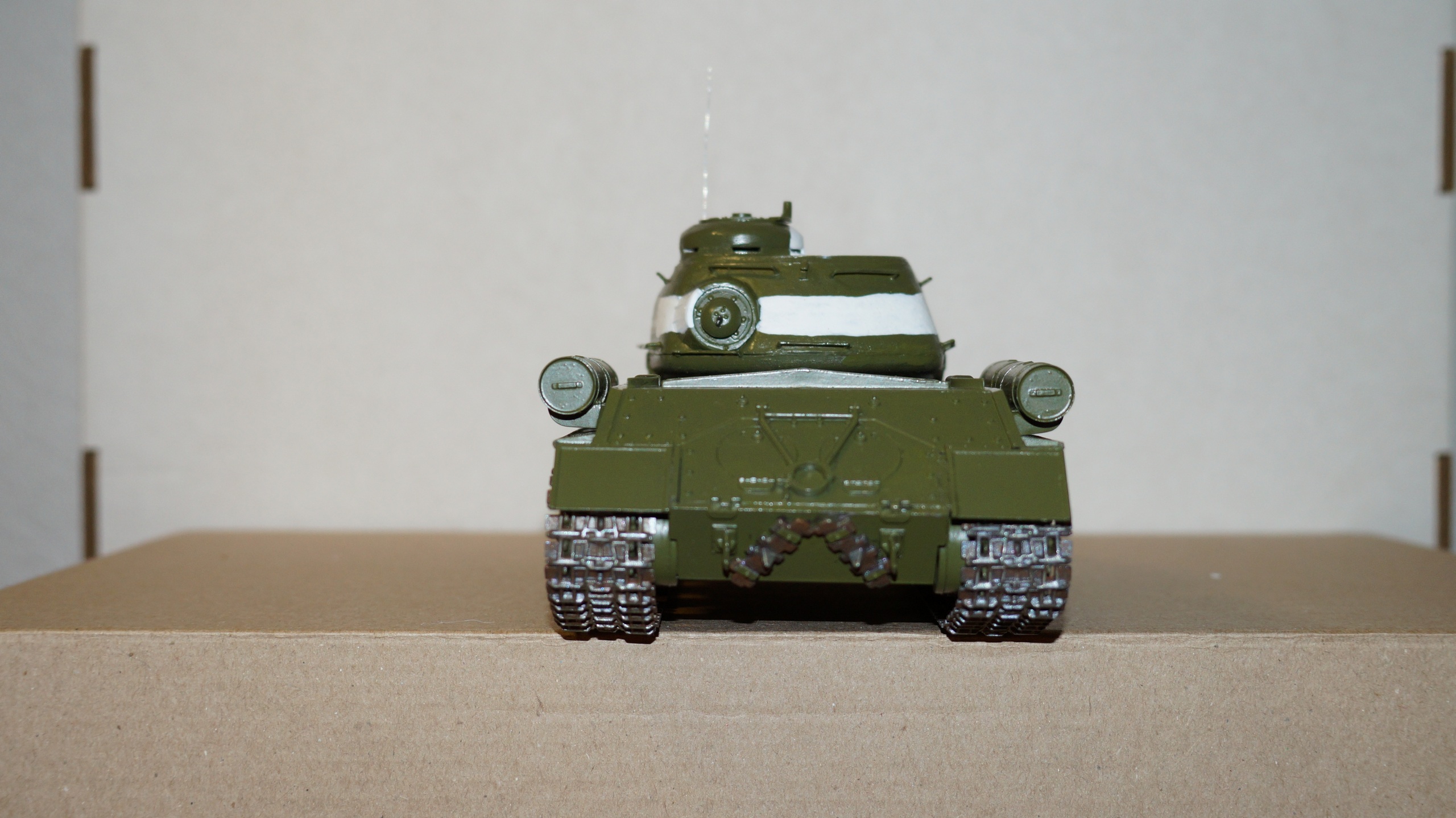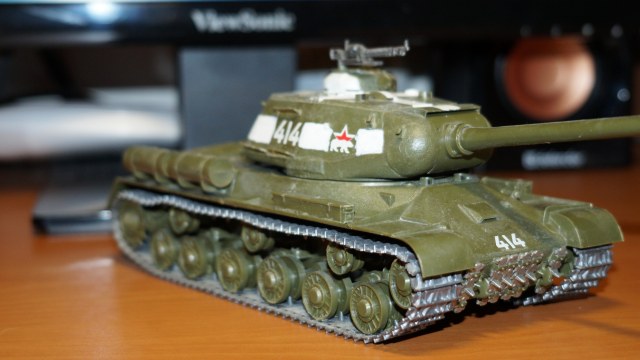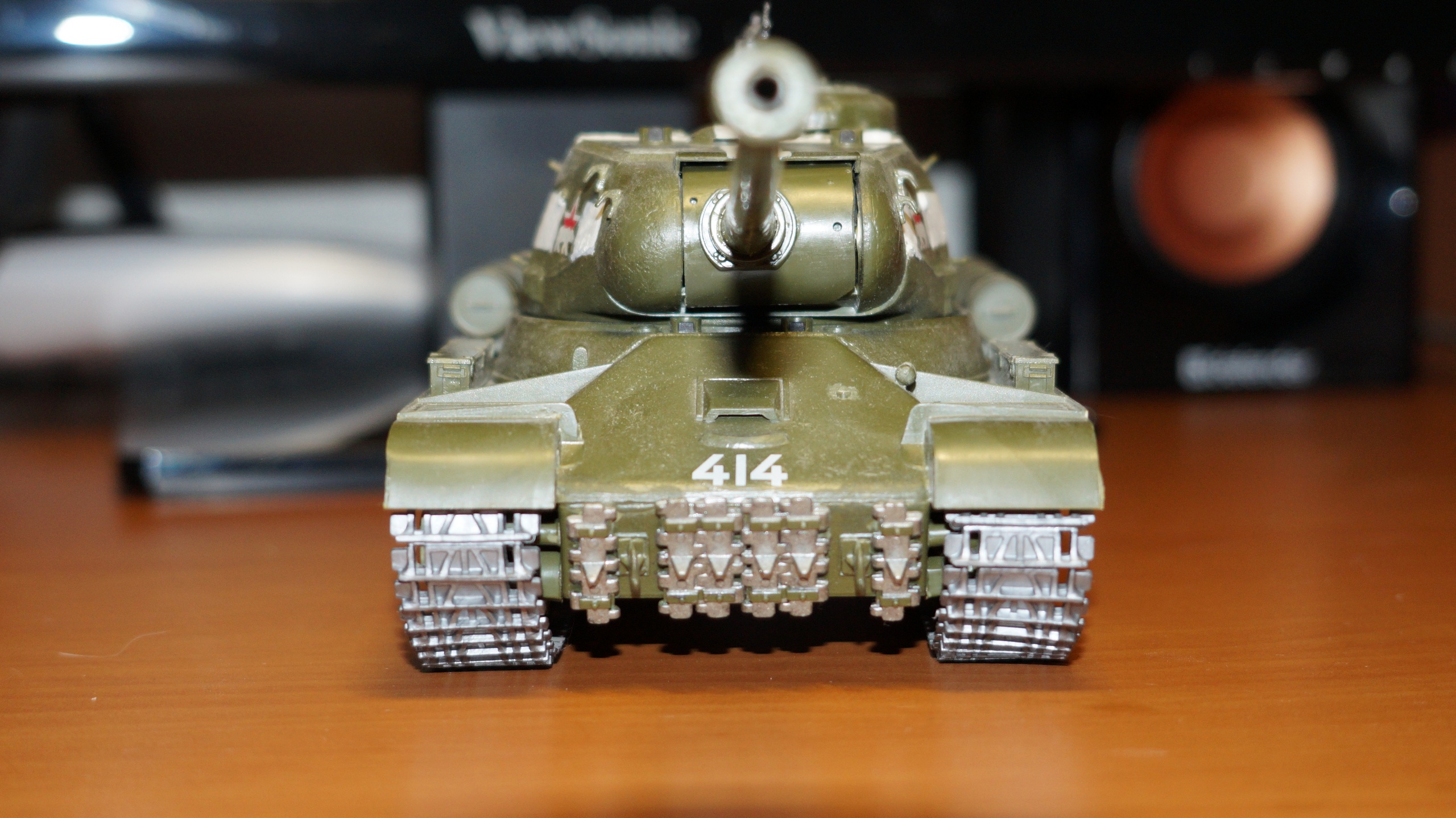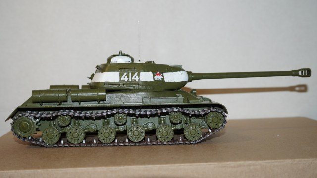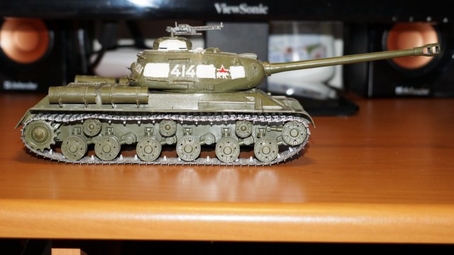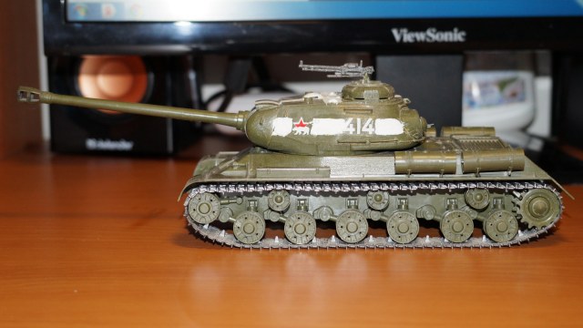 Доброго времени суток!Размещаю модель танка ИС-2 от "Звезды". За основу взял танк 7-й гвардейской тяжелой танковой бригады из Берлина 1945 года. При сборке не ставил своей целью делать модель похожей на настоящий танк, до этого я еще не дозрел. Моей целью было сделать, так сказать, красивую игрушку. Насколько у меня это получилось - судить вам, посетителям сайта.Вообще эта модель была собрана мною еще году так в 2006 и в настоящий момент приведена в божеский вид. Какой она была до улучшения показано на четырех последних фотографиях. Корпус и башня не покрашены, пулемет без кончика ствола и покрашен убого, гусеницы виниловые, да и сама модель не вполне соответствует танку ИС-2. В те далекие времена такой вид меня вполне устраивал, сейчас - нет. В процессе улучшения сделал следующие изменения: покрасил корпус и башню модели краской MR Hobby, виниловые гусеницы заменил на сборные траки от MSD (кстати стыкуемость траков просто замечательная, пилить, подгоняя их один к другому, не надо), гудок и место в корпусе для курсового пулемета рассверлил, поставил отломавшуюся фару, сделал антенну, а также переделал командирскую башенку (из многогранной сделал круглую) и переделал передок корпуса (смотровую щель с ее защитными элементами перенес выше где они и должны находиться, добавил длинную планку). Новые гусеницы окрашивал акриловыми красками от "Звезды" вороненая сталь, ржавчина, сталь. Модель окрашивал кистью. Пулемет убрал, а новый ставить не стал - уж больно пулемет из коробки убого выглядит.