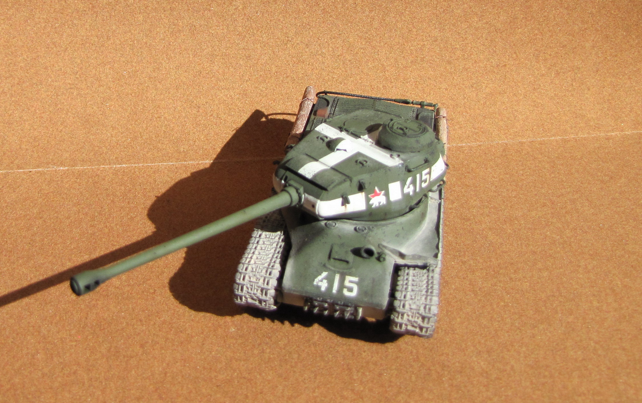 Хотелось воссоздать потрёпанную боями машину. Изначально планировал и отталкивался в работе от фото машины с бортовым номером 414. Планы пришлось подкорректировать ввиду недостачи нужном количестве четвёрок на листе деколи , которая была в наборе. Образ получился собирательный. Что сделал - срезал подкрылки и сделал их из алюминиевой жести, сделал кронштейны дополнительных баков (брёвна планировал изначально). Прорезал щель мех вода и выхлопные окна. Сделал провис гусениц. Делал впервые для понимания, как оно будет выглядит в этом исполнении. Провис сделан добавлением одного трака от КВ на гусеницу . Высверлил фару. Изначально планировал изобразить разбитую или с отсутствующим отражателем(только корпус). Красил красками TAMIYA. Пигменты Wilder.