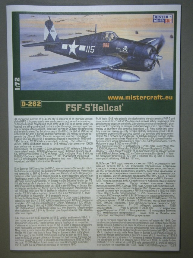 Предлагаю вам обзор модели HellcatF6F-5 от Mistercraft в м 1/72. Красочный боксарт, чем-то напоминающий иллюстрации от Hasegawaне может оставить равнодушным любителей американских палубников времён II м. в. Но, зная что такое Mistercraft, можно не обольщаться насчёт содержимого красочной коробки. Открыв её, убеждаешься, что так оно и есть, потому, как внутри нас ожидает старенький пластик от Heller, не менее 40-летней давности разработки.