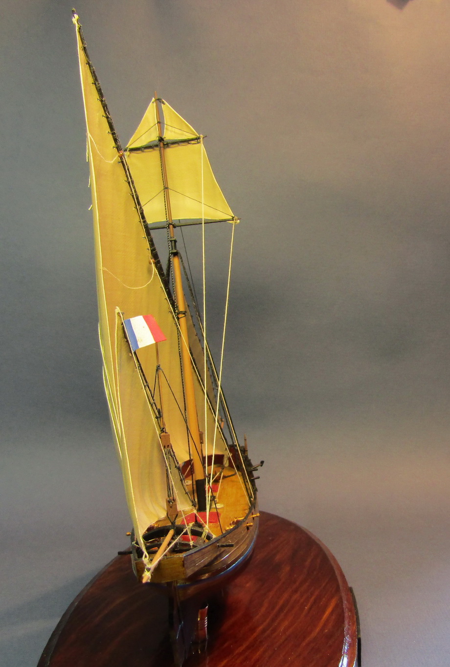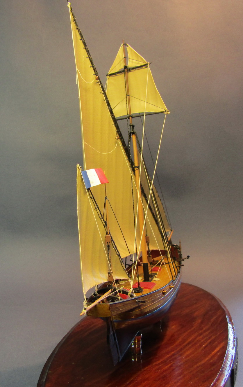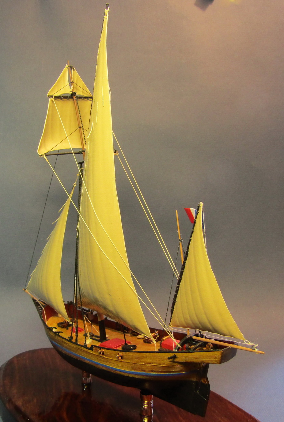Исполнение мне понравилось. Сборка аккуратная. Окраска корпуса отличная. Паруса оставили двойственное ощущение: с одной стороны цвет (учитывая стороннее фото) удачно подобран, а с другой стороны стоило по ним пройтись матовым лаком. На счёт такелажа, по-моему, сделано допустимое упрощение - основные снасти сделаны, а для более подробной проработки на таком мелком масштабе нужно затратить гораздо больше времени на изготовление.