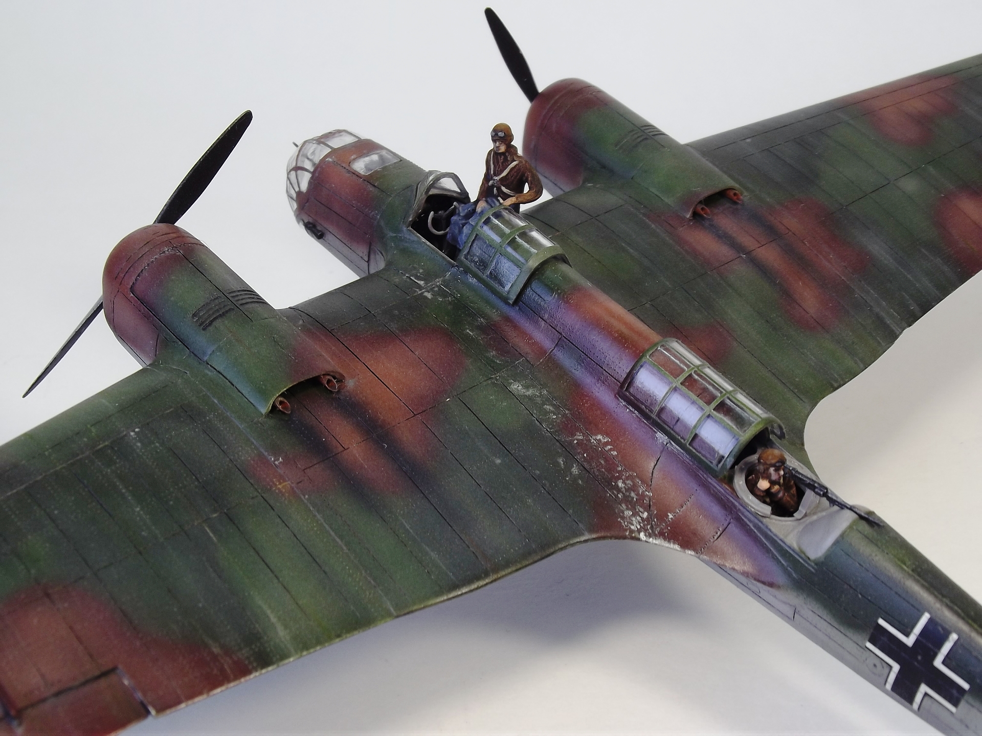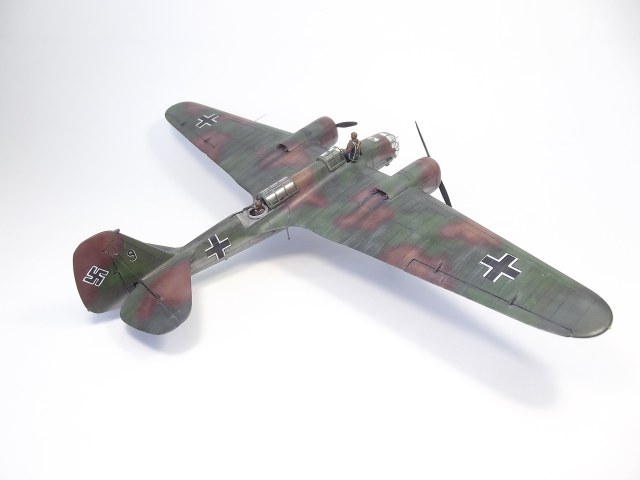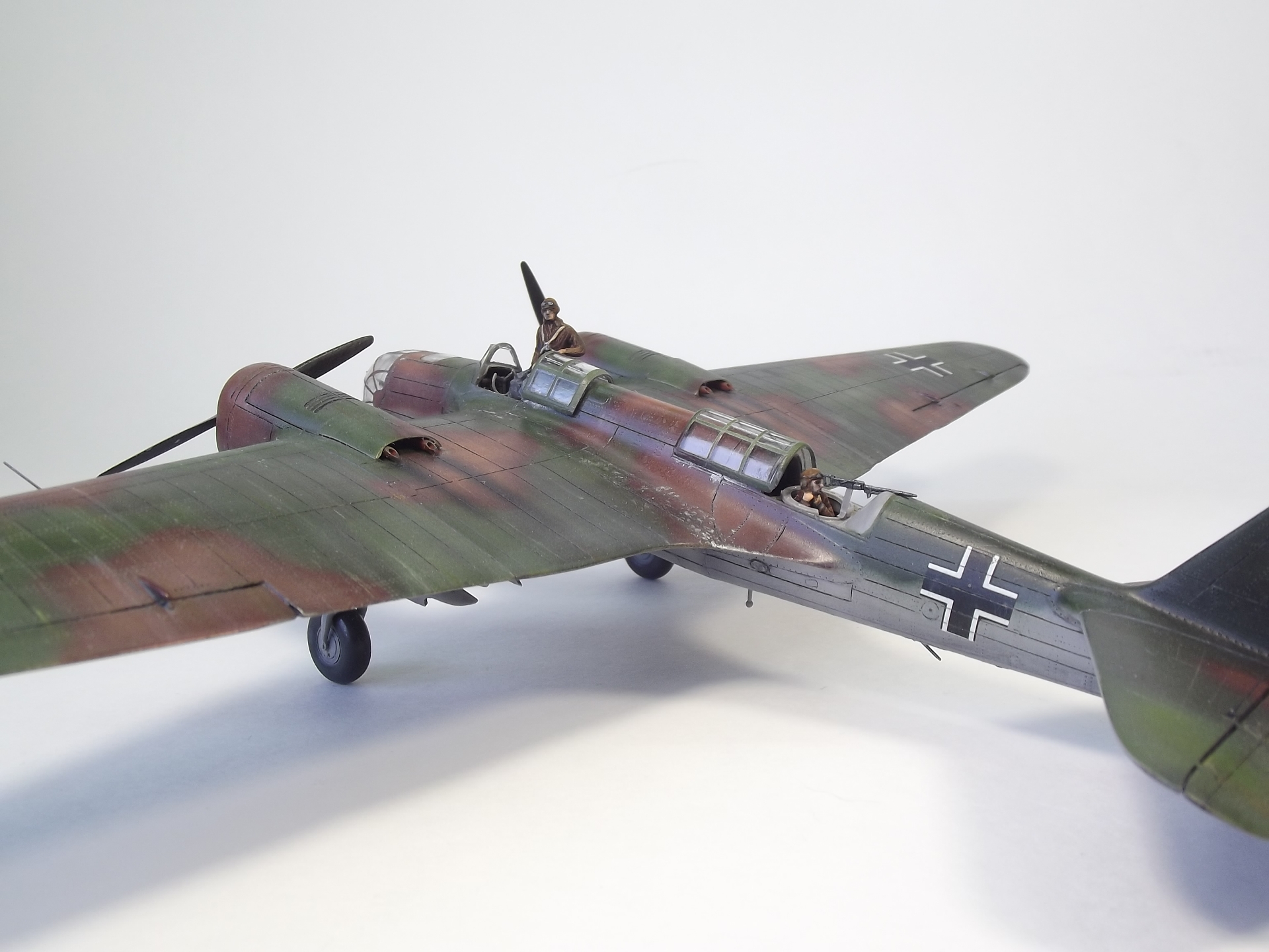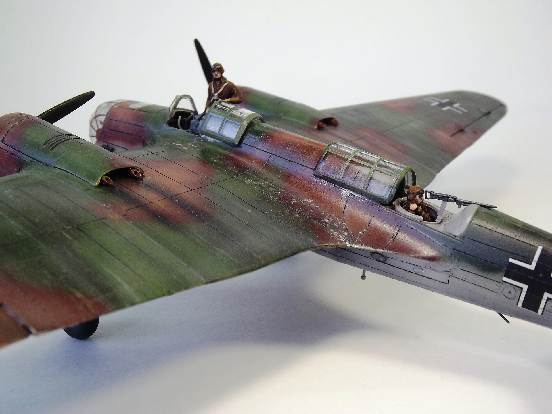 Окрашивал Тамией и Аканом. Расшивку выделял тамиевской смывкой. Низ черной, верх серой. Немного доработал кабину пилота. Сделал приборную доску и ремни на кресло. Чтобы как-то оживить модель решил посадить Гансиков. Гансы из набора Revell– пилоты и техники люфтваффе. Набор совсем не однозначный. Хоть литник и один, но содержит фигурки видимо от разных производителей, так как очень сильно отличается литье и размеры фигурок. Пилот и стрелок оказались на голову выше штурмана. Хотя все они неплохо вписались, благодаря своему росту, в саму модель.)))