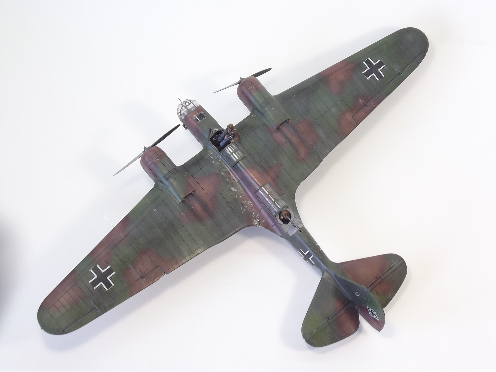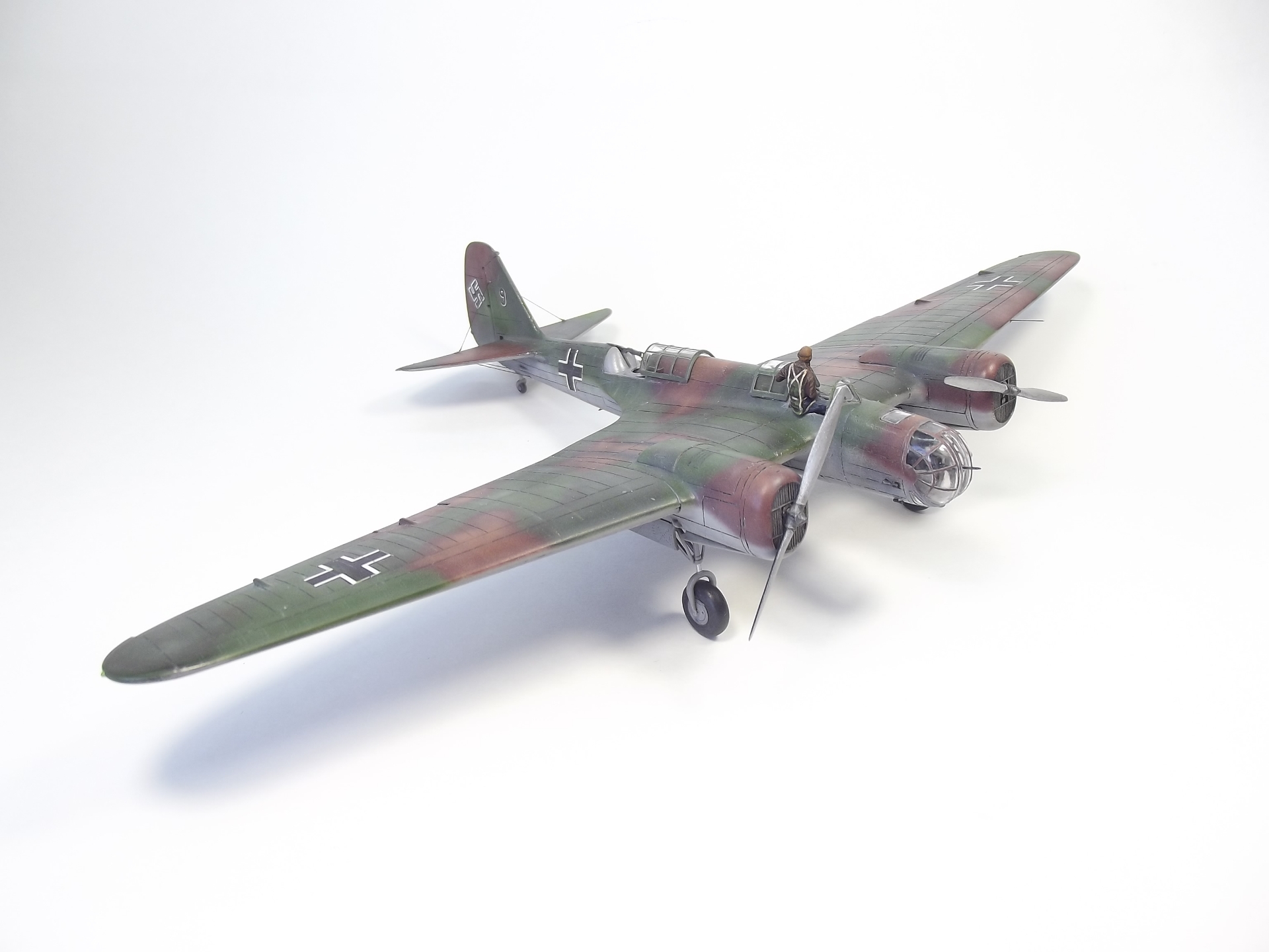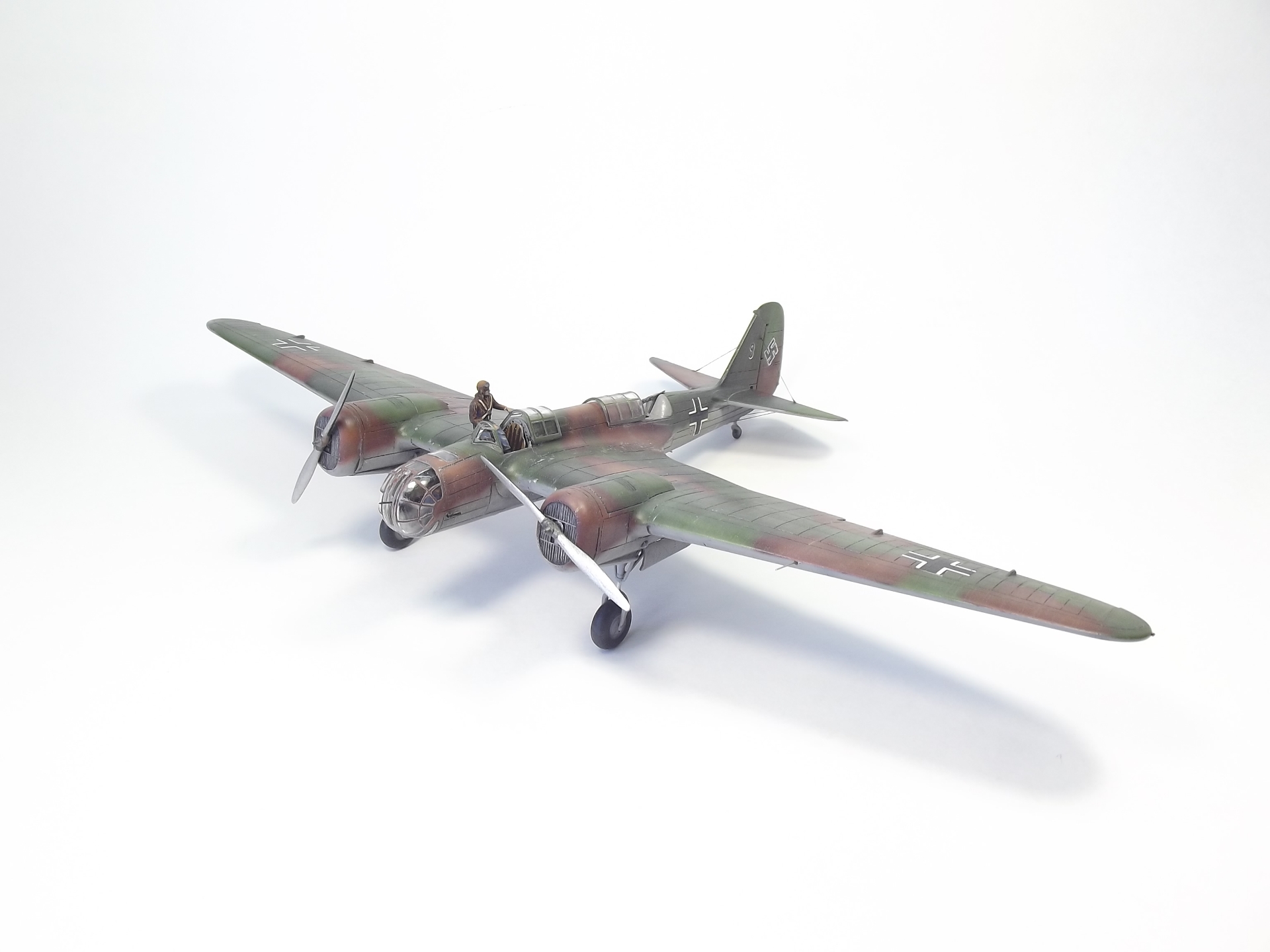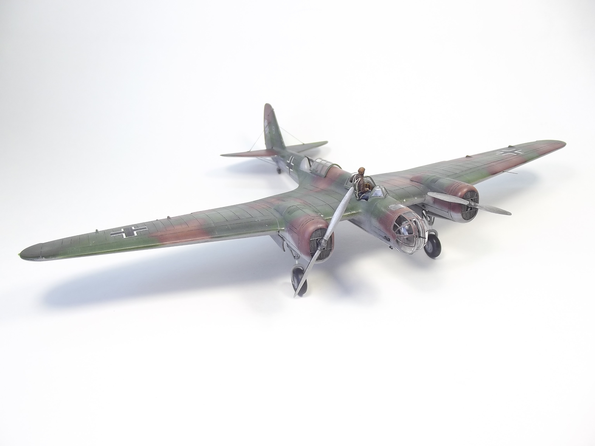 Окрашивал Тамией и Аканом. Расшивку выделял тамиевской смывкой. Низ черной, верх серой. Немного доработал кабину пилота. Сделал приборную доску и ремни на кресло. Чтобы как-то оживить модель решил посадить Гансиков. Гансы из набора Revell– пилоты и техники люфтваффе. Набор совсем не однозначный. Хоть литник и один, но содержит фигурки видимо от разных производителей, так как очень сильно отличается литье и размеры фигурок. Пилот и стрелок оказались на голову выше штурмана. Хотя все они неплохо вписались, благодаря своему росту, в саму модель.)))