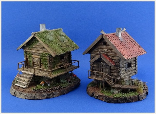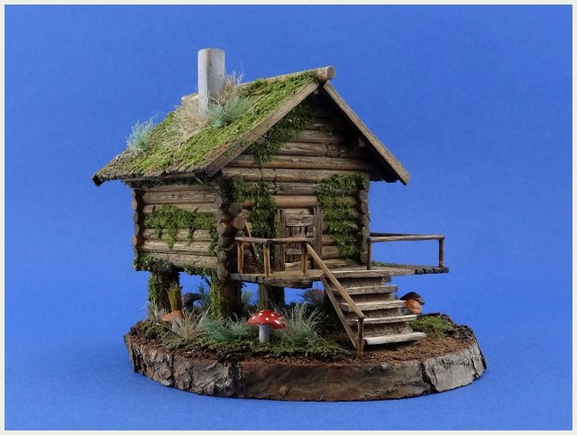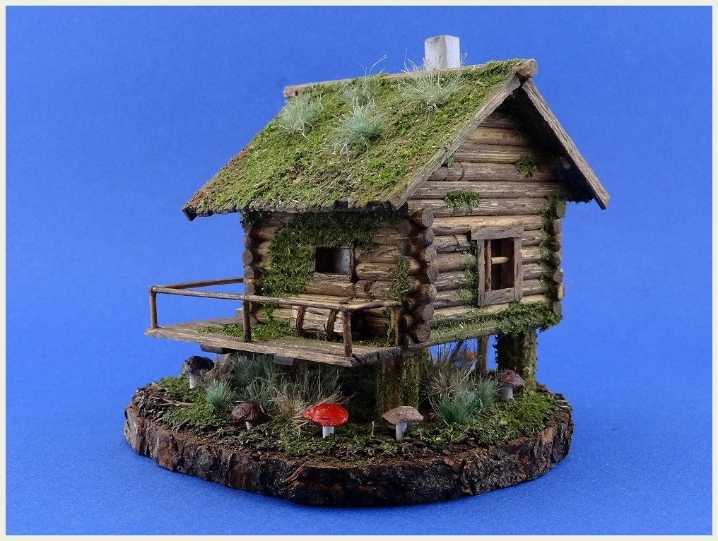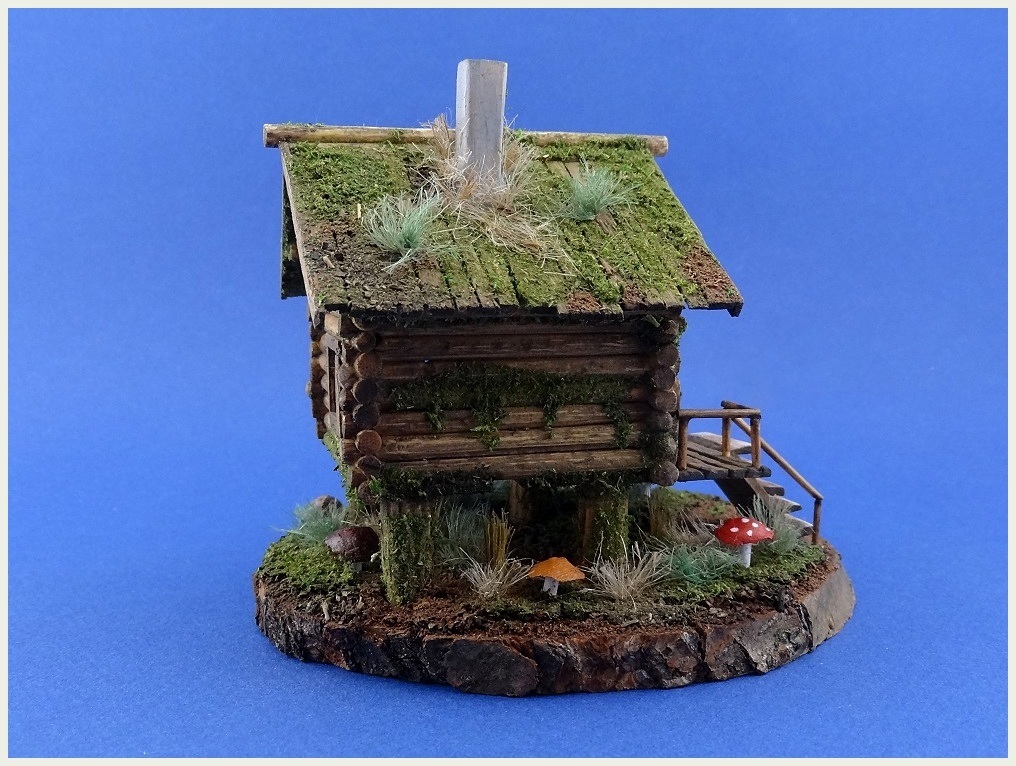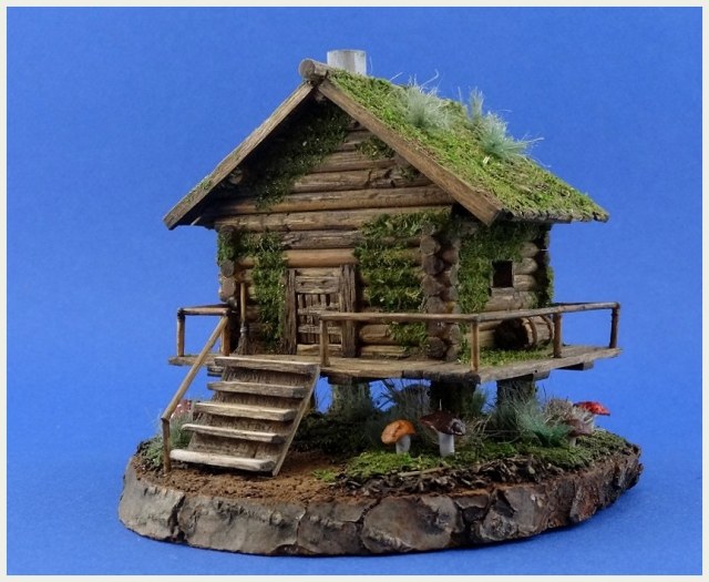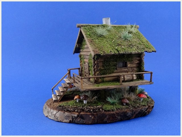 В сборке избы применялся в основном натуральный материал - древесина. Каркас и дымовая труба сделаны из палочек разного диаметра. Крыша, крыльцо, дверь и окно вырезаны из линейки. Подставка - декоративный деревянный круг. Основным наполнением проекта выступили: грибы - вылеплены из холодной сварки, веник и связка дров. Трава имитирована из пакли, сушенного молотого чая. Размеры модели: высота 11,5 см, длина/ширина теремка 8x8 см.
