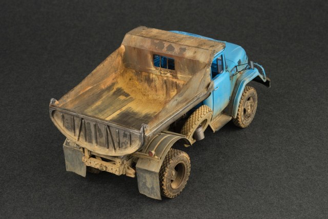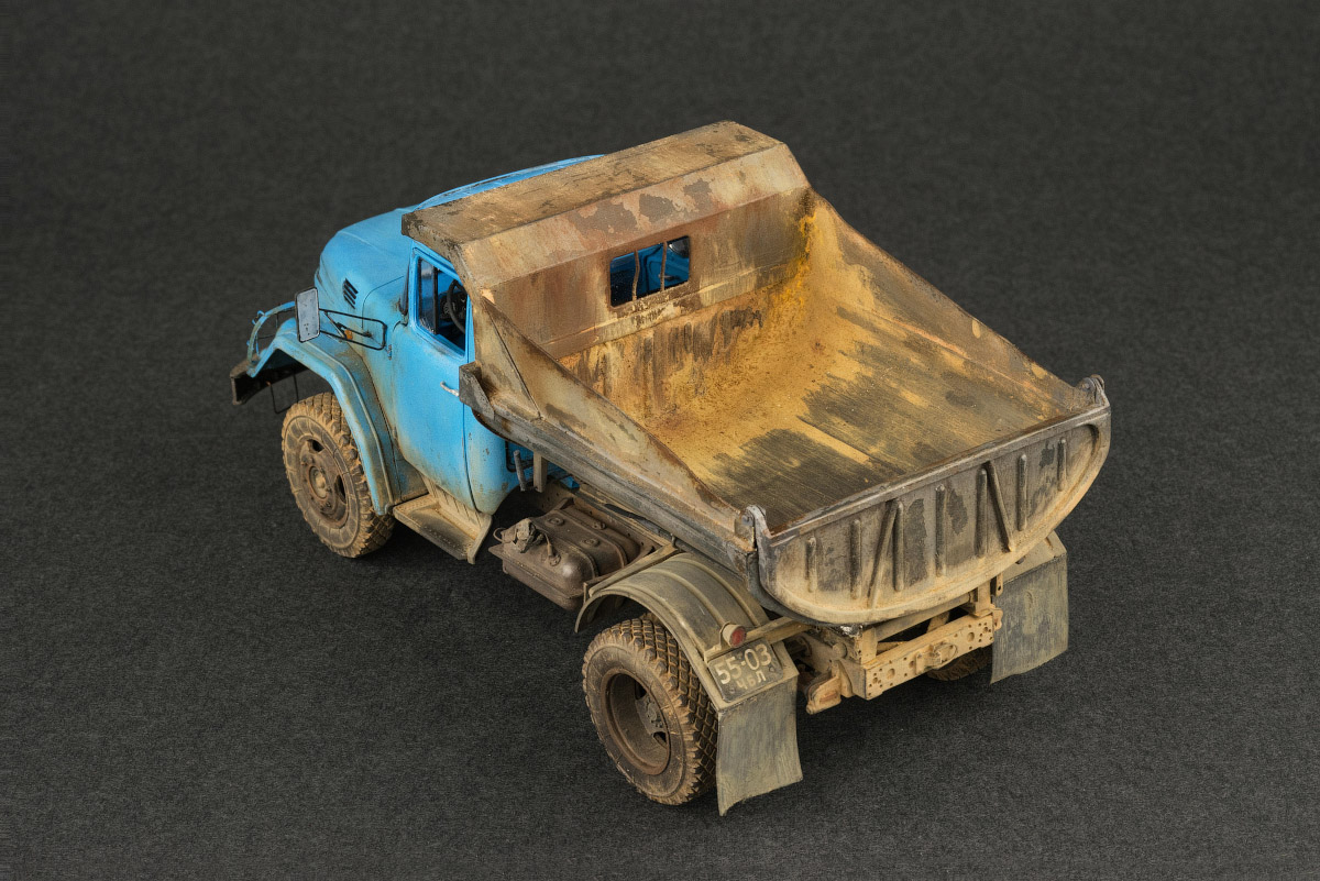 От себя нарастил борта и сделал заново козырек кузова с окошком. По мелочи — лопата, ведро, решетки фар, кронштейны зеркал, номера. Отчасти освоил работу с гипсом, в плане изготовления объемной грязи путем смешивания гипса, масляной краски и уайтспирита, вполне себе управляемая масса и сохнет быстро.