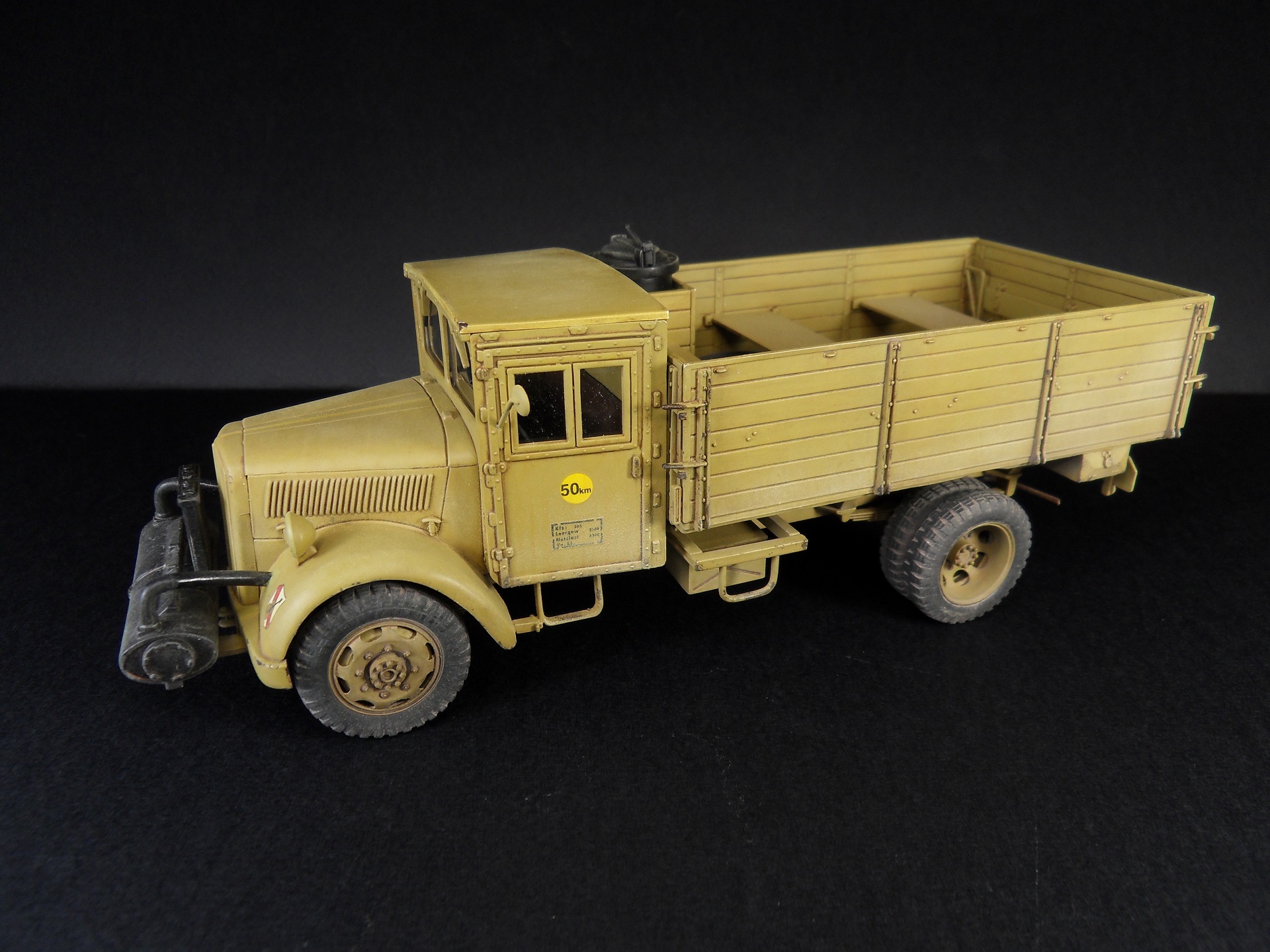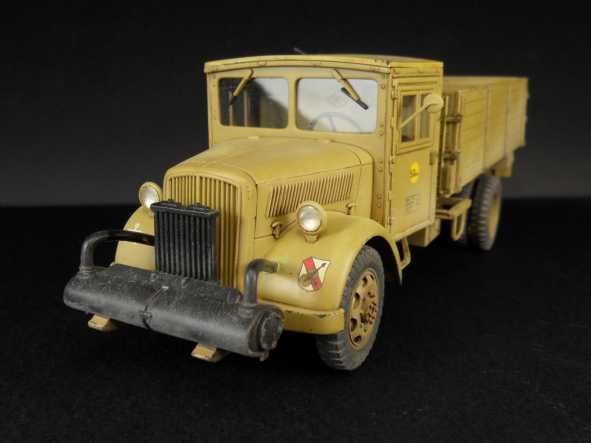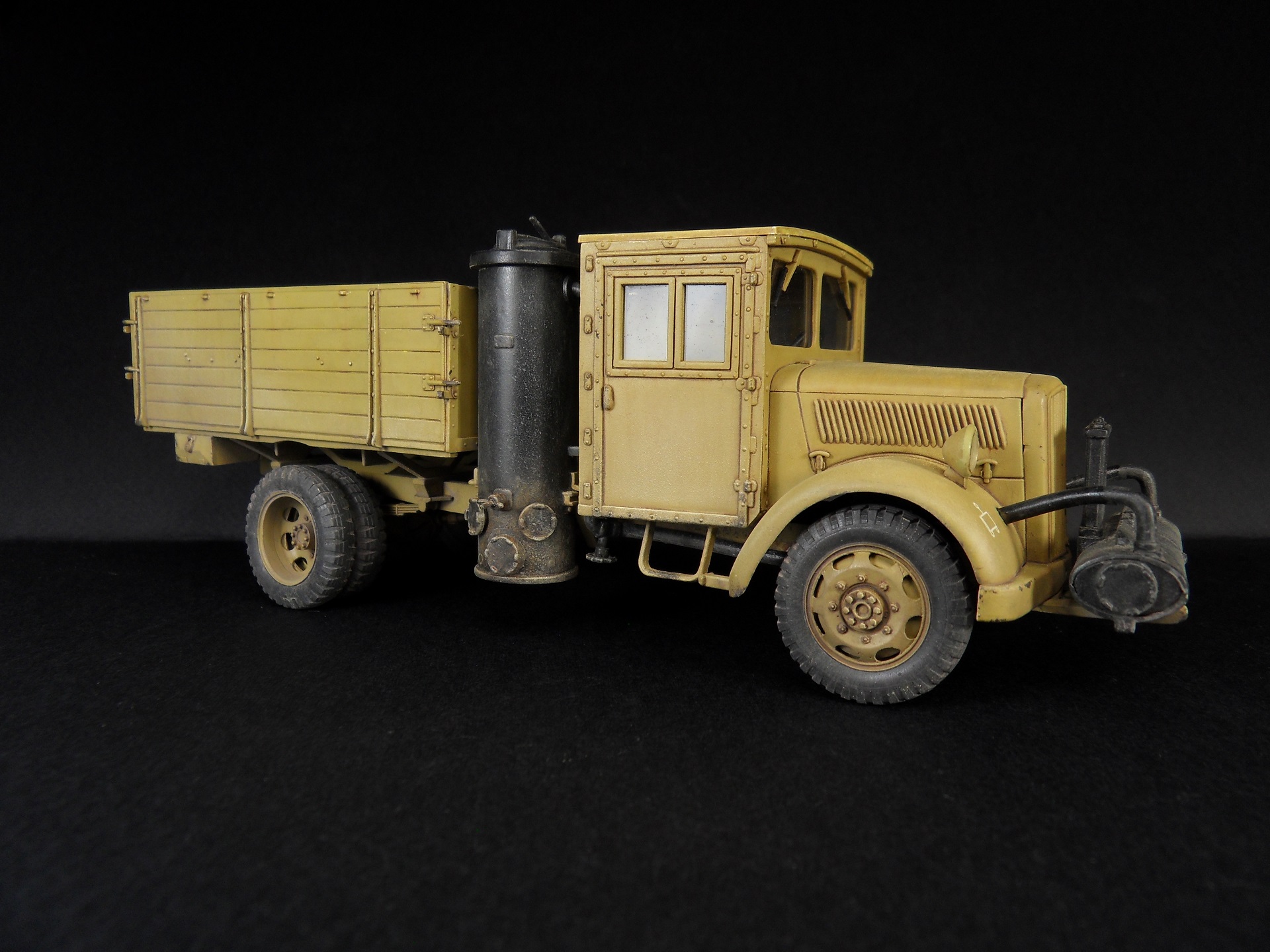 Доброго дня уважаемые коллеги и гости нашего сайта! Хочу представить Вашему взору модель немецкого грузовика Mercedes-Benz L-701, который выпускался в 1944-49 гг. по лицензии Opel. От прототипа они отличались прямоугольной кабиной на деревянном каркасе со стенками и дверями из прессованного картона, двумя плоскими лобовыми и боковыми стеклами, фарами уменьшенного диаметра, отсутствием подножек, задних крыльев, и эмблемы на решетке радиатора. Часть грузовиков, предназначенных для тыловых служб, оснащалась газогенераторными установками, как раз такую я Вам и хочу представить. Всего было выпущено 3,5 тысячи машин.