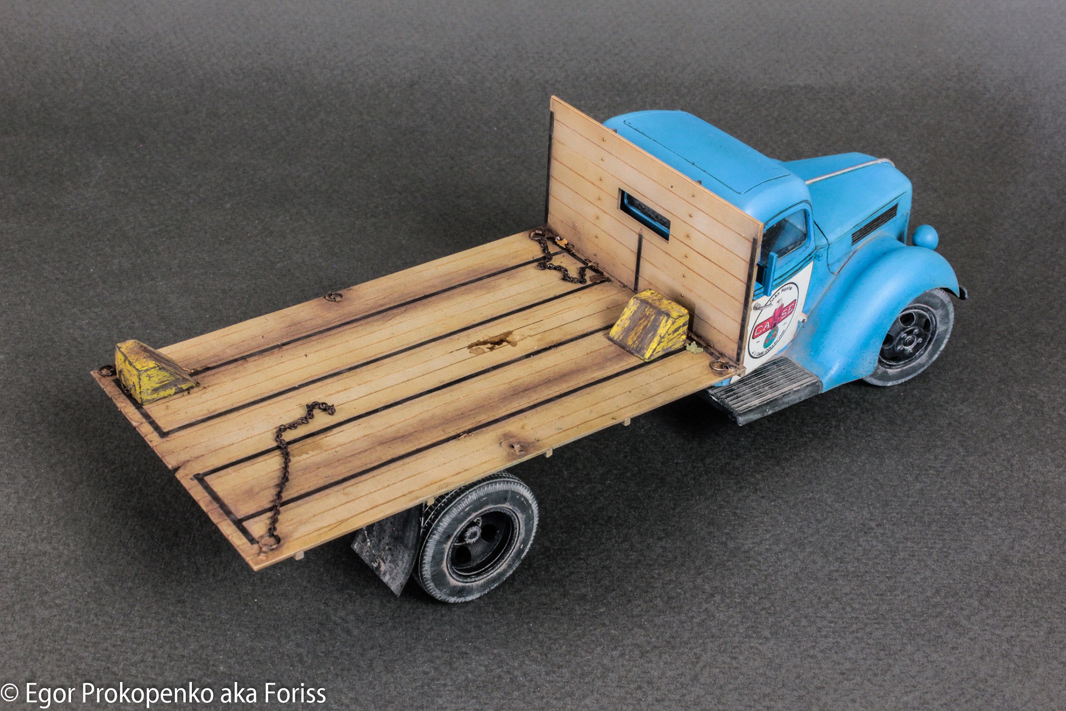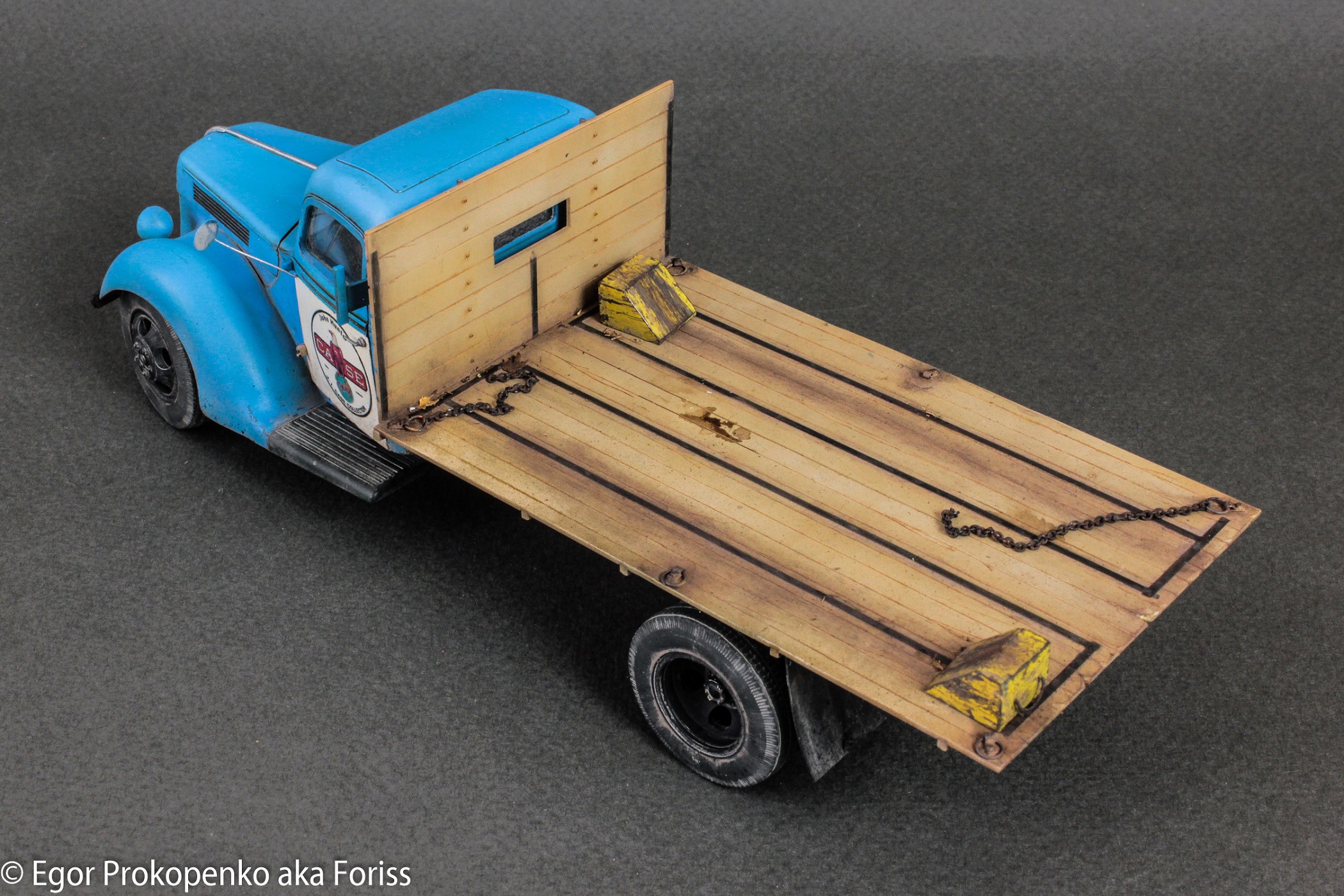 Доработал грузовик до американской версии: исправил форму крыльев, бампера, поправил решетку радиатора, стекло, добавил выштамповки на дверях, убрал задние крылья, сделал брызговики, доработал кузов, сделал крепежные петли, подпорки… Не нашел для него в наличии гражданскую версию колес, поэтому постарался доработать штатные колеса, сделал продольные проточки на покрышках, постарался выделить протектор, стало лучше, но со смолой все равно не сравнить))