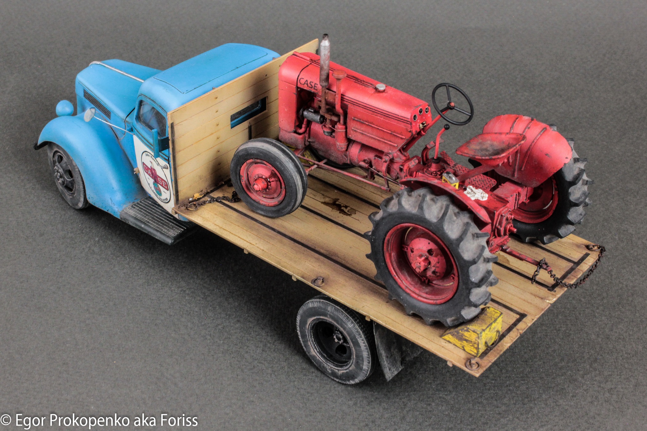 Не успел я выложить свой трактор, как уже доделал для него грузовик. И так, представляю американский Ford v3000 или он же t098, приспособленный фирмой CASE для перевозки своих тракторов. По набору думаю, описывать долго не стоит, все его знают, это ICM первых выпусков со всеми вытекающими (не плохой набор, но новые модели ICM на порядок лучше).