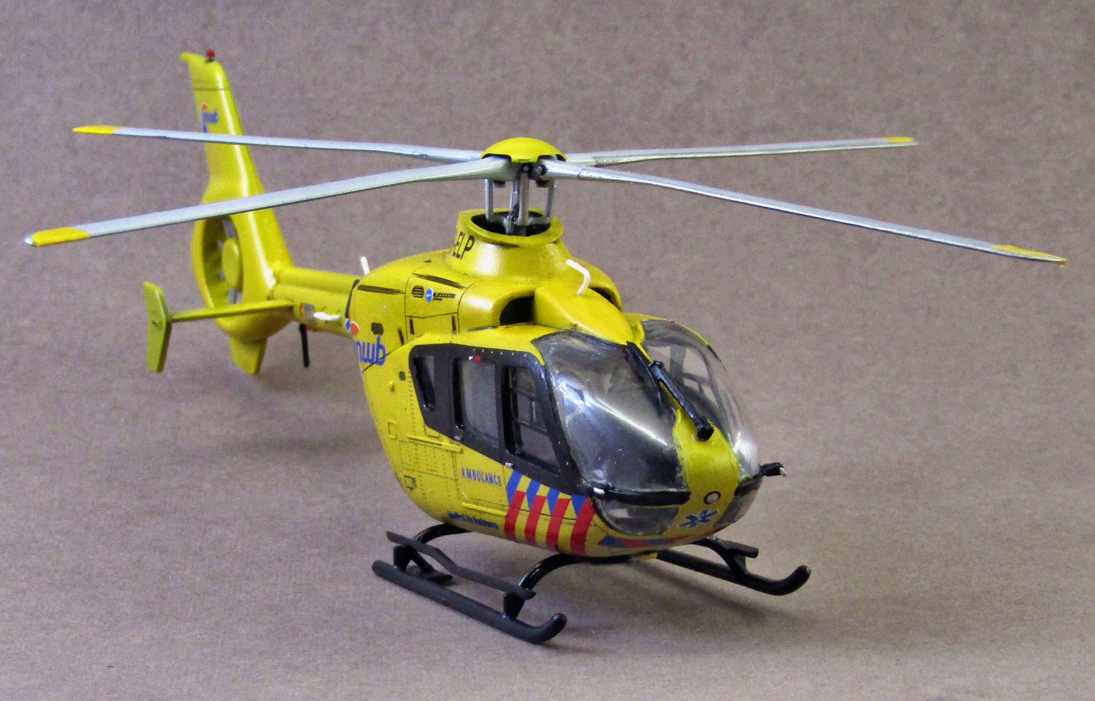 Приветствую коллеги! Представляю маленькую модельку Нидерландского медицинского вертолётика. Данный кит мне подарила супруга. К сборке претензий не возникло, разве что стёклышки слегка кривоватые, но искупавшись в футуре они несколько преобразились. Красил желтым акрилом от тамии, между слоями задувал футурой, смывка - черная тамия, покрытие тоже футура. В дальнейшем планирую выставить на диораму. Приятного просмотра коллеги...
