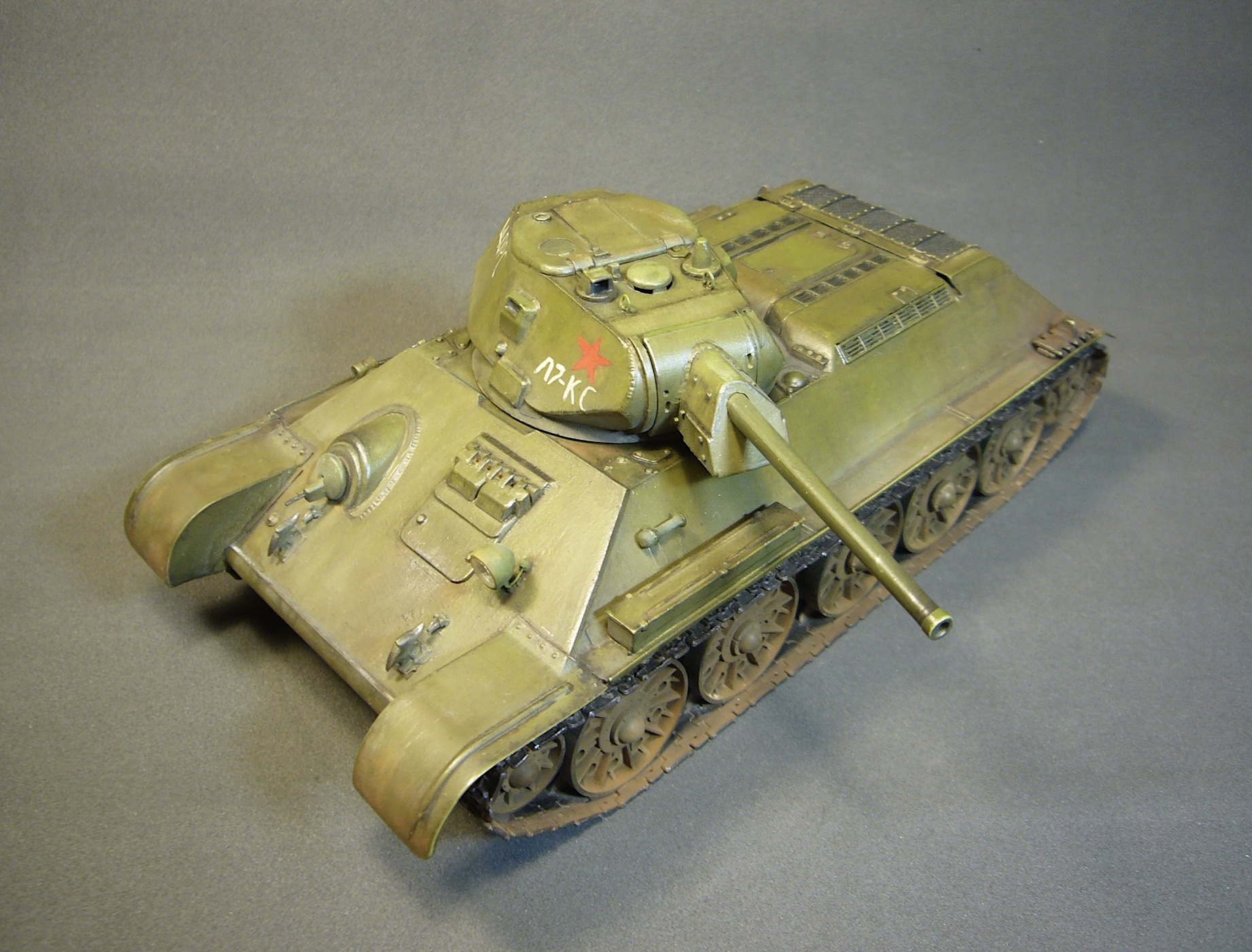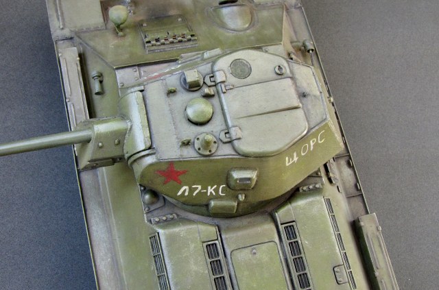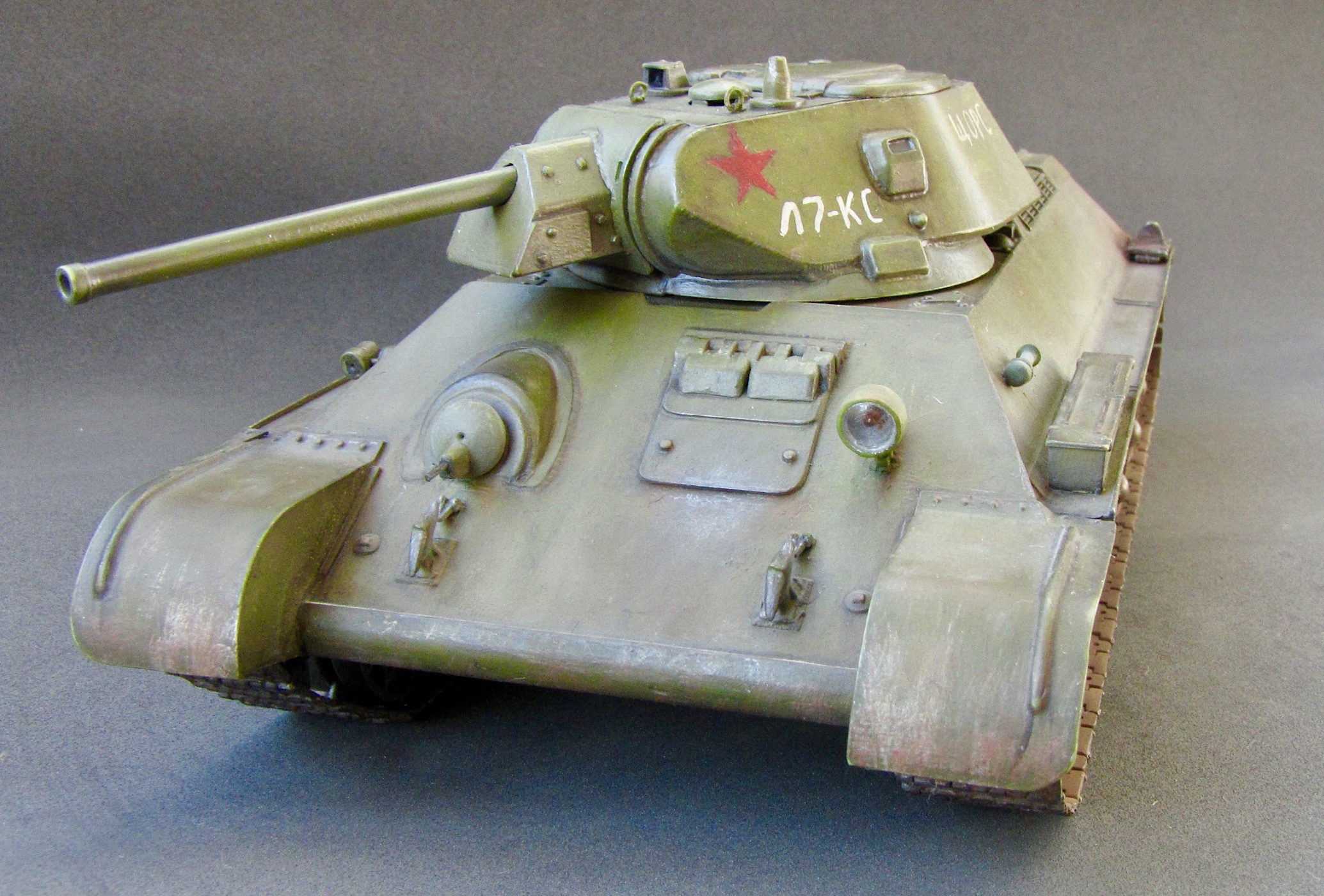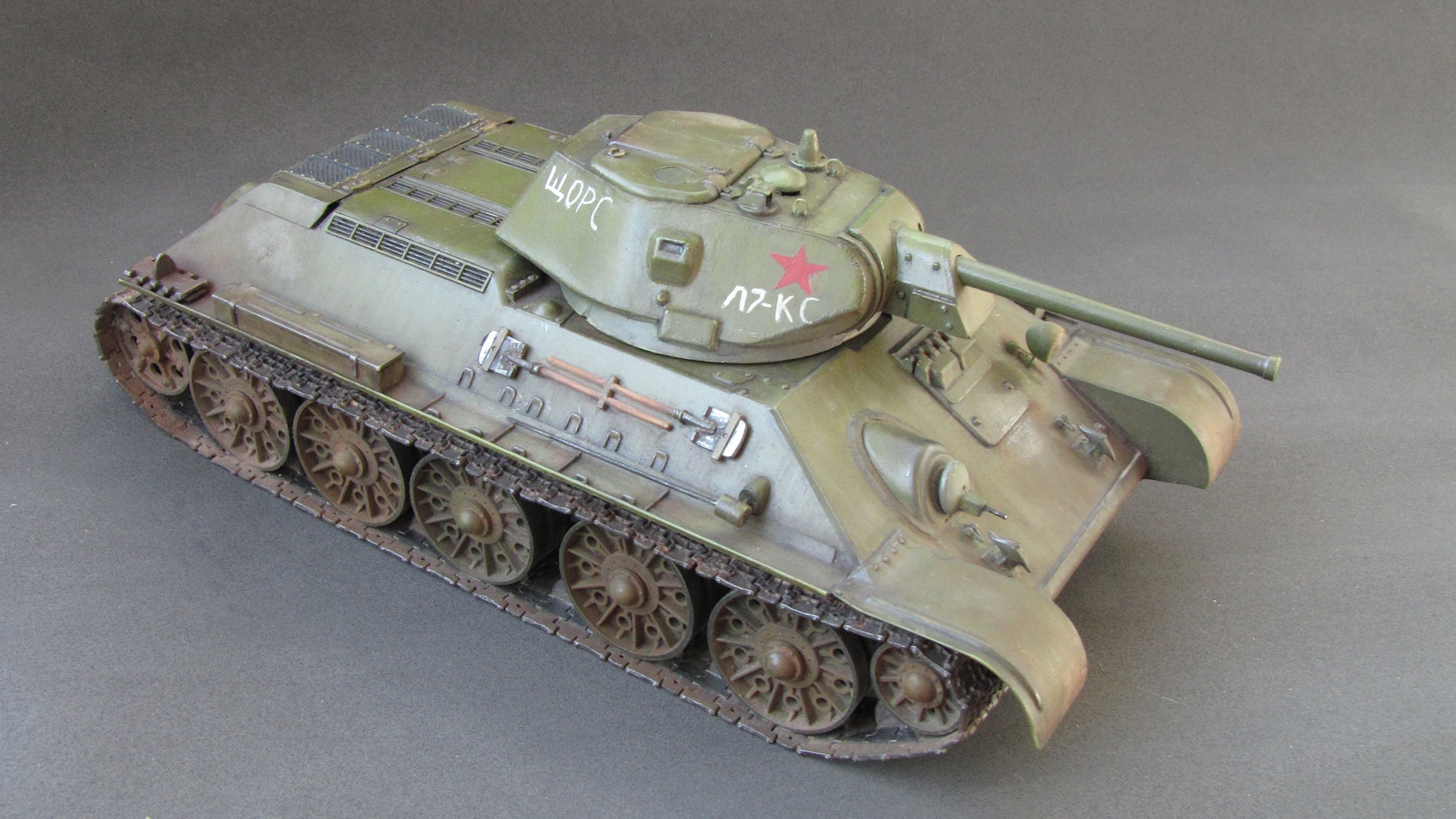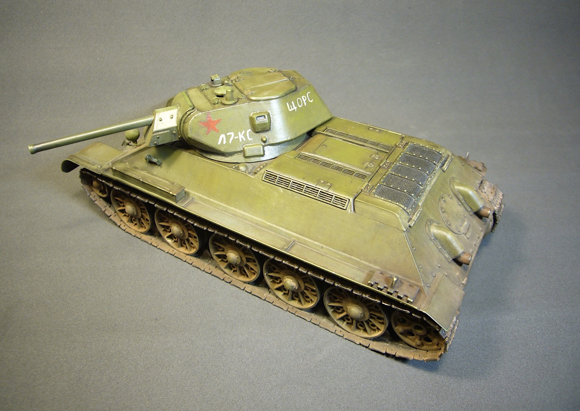 Это модель старая Звездовская, была куплена где то в начале 2000г. примерно, с тех пор лежала в коробке, у самого руки не дошли, вот младший наигравшись в WOT решил собирать. При переездах были потеряны траки, инструкция, фара, ящики зип, поэтому он использовал оставшиеся от макетовского Т-34 с башней гайка, пилил гусли недели две наверное), без привязки, без инструкции, кое что подсмотрел в нете. Единственная помощь с моей стороны - задуть лаком из баллончика, но я тут накосячил оставив отпечаток пальца на правом борту, за что и был отстранен от дальнейшей помощи в постройках, только советы)
