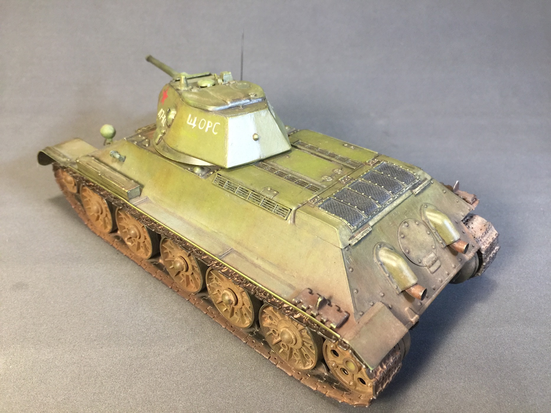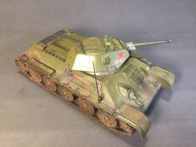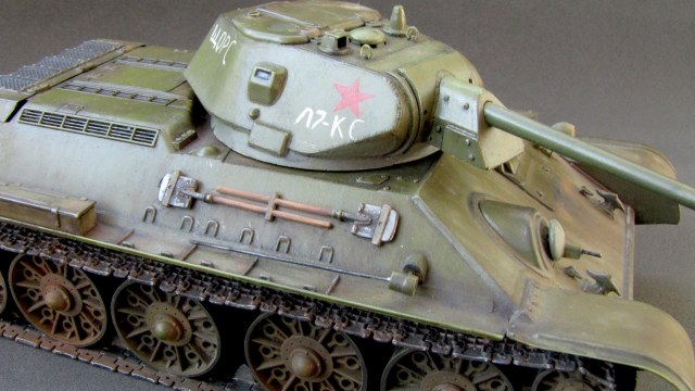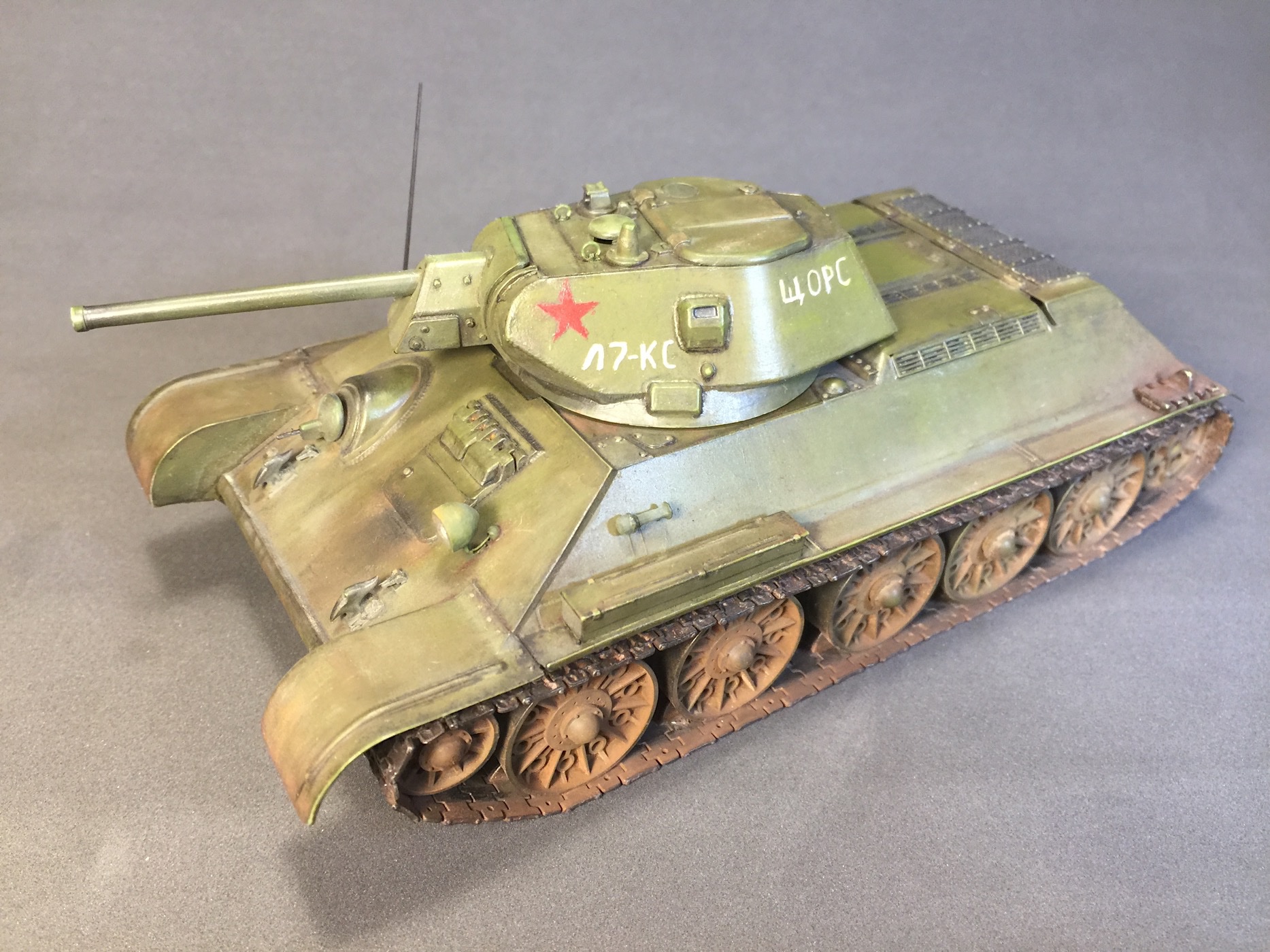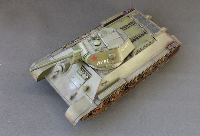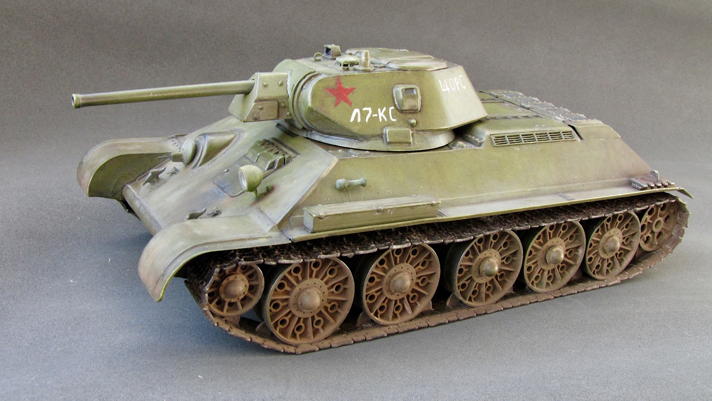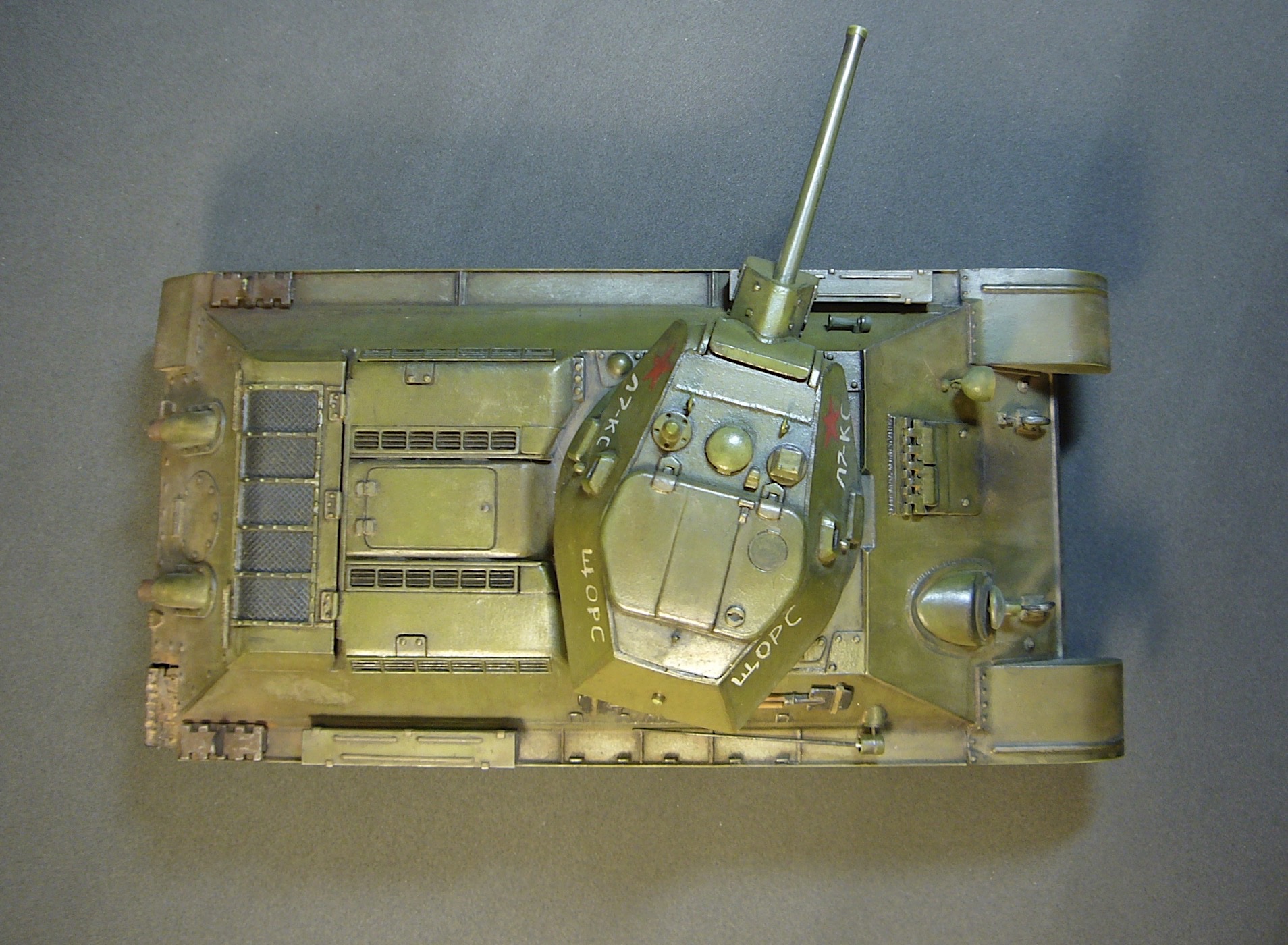 Это модель старая Звездовская, была куплена где то в начале 2000г. примерно, с тех пор лежала в коробке, у самого руки не дошли, вот младший наигравшись в WOT решил собирать. При переездах были потеряны траки, инструкция, фара, ящики зип, поэтому он использовал оставшиеся от макетовского Т-34 с башней гайка, пилил гусли недели две наверное), без привязки, без инструкции, кое что подсмотрел в нете. Единственная помощь с моей стороны - задуть лаком из баллончика, но я тут накосячил оставив отпечаток пальца на правом борту, за что и был отстранен от дальнейшей помощи в постройках, только советы)