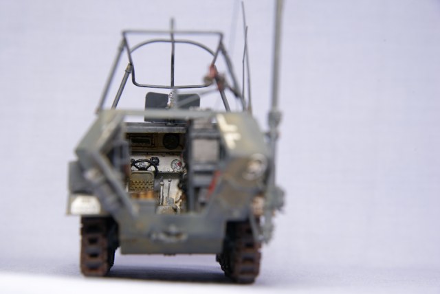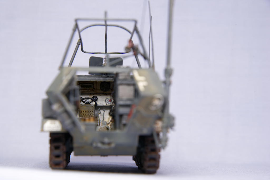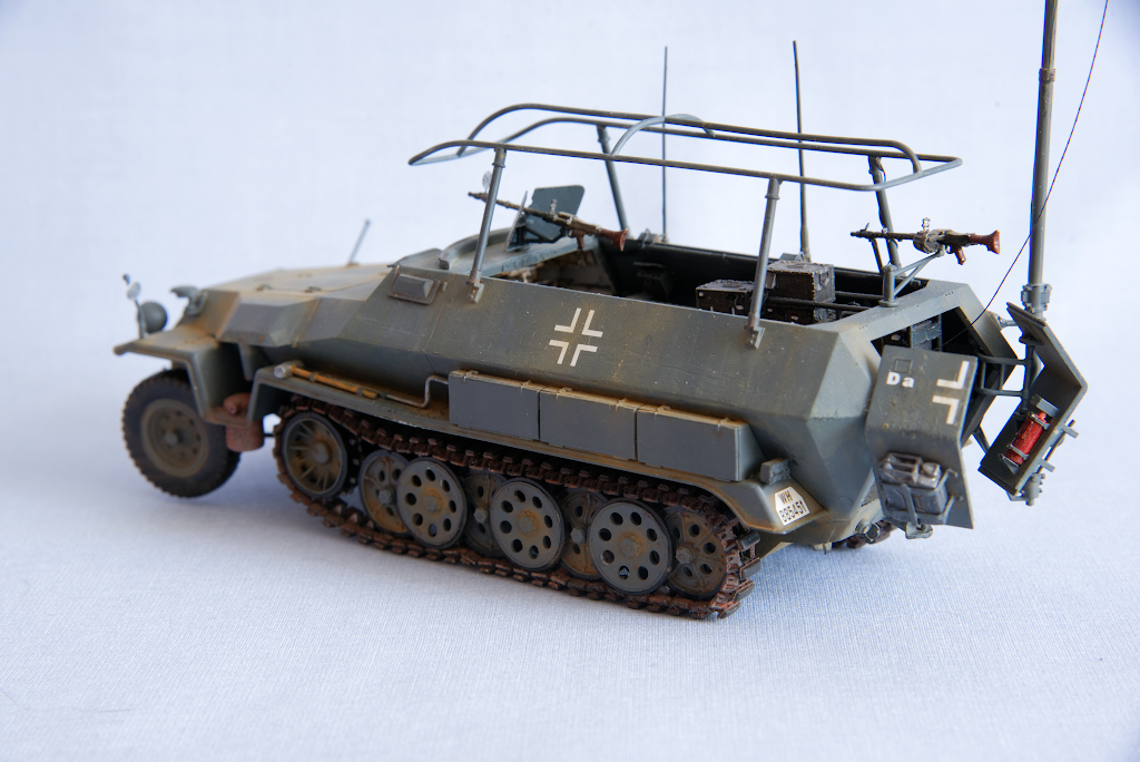 Sd.Kfz.251/6 — передвижной командный пункт для командиров высшего звена управления (дивизия, корпус, армия).По мере своих возможностей доработал: использовал набор травления от Part, проводку к радиостанциям, переделал сиденья экипажа.Окрас акрил Vallejo, масло, пигменты, пастель.