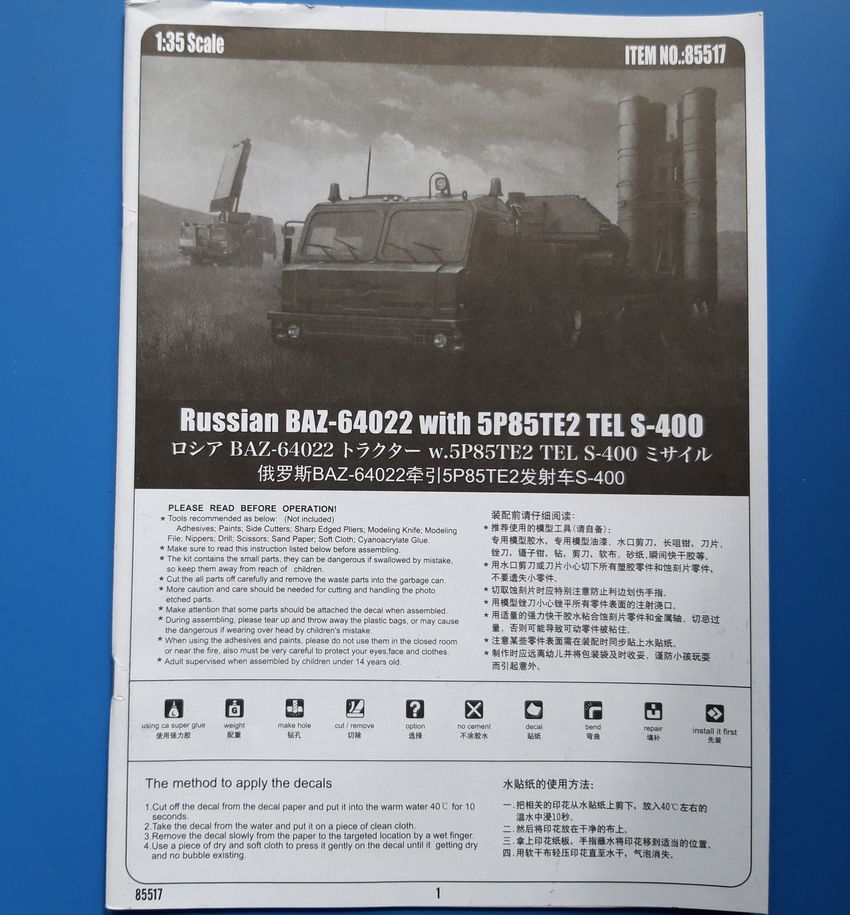 Модель компании Hobby Boss выпуска 2018 года довольно таки огромная коробка с верхним открыванием,более 900 деталей,все детали отлиты очень качественно, отличная детализация как самого тягача так и пусковой установки,ходовой части,один литник с прозрачными деталями и маски к ним,металлический тросик,резиновые шланги,корпуса пусковых установок выполнены готовыми деталями,3 платы фототравления,12 отлично отлитых резиновых колес с неплохо проработанным протектором,стандартная черно-белая инструкция имеет 37 позиций по сборке только тягача и 24 по сборке пусковой установки,цветной вкладыш с двумя вариантами окраски и мини книжка с фотографиями самого комплекса,что очень может помочь при окраске.