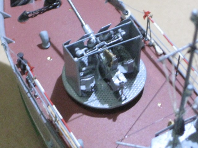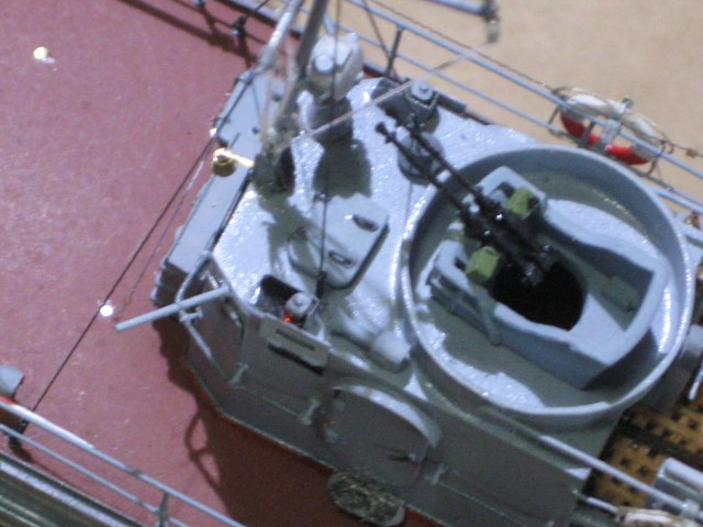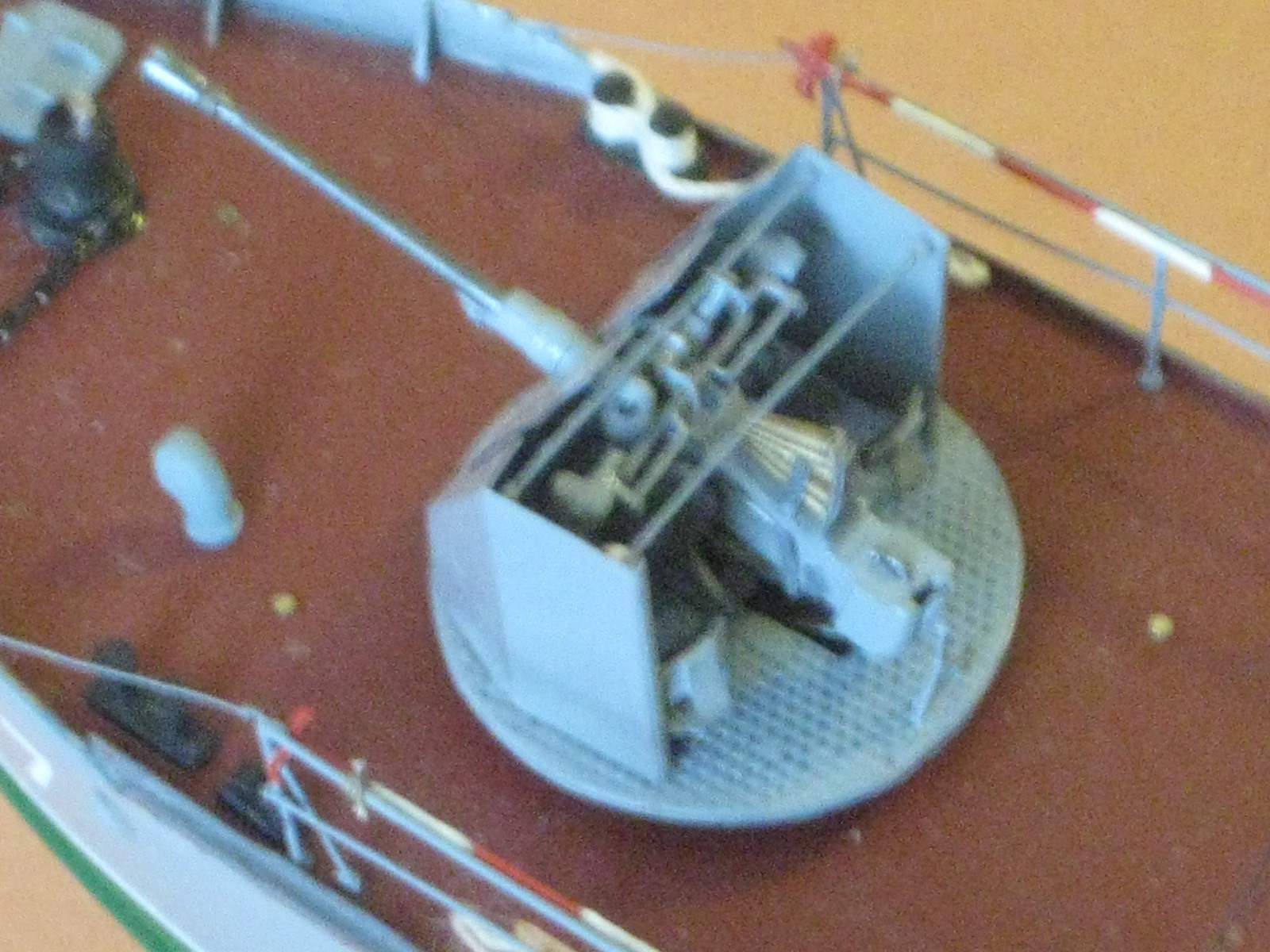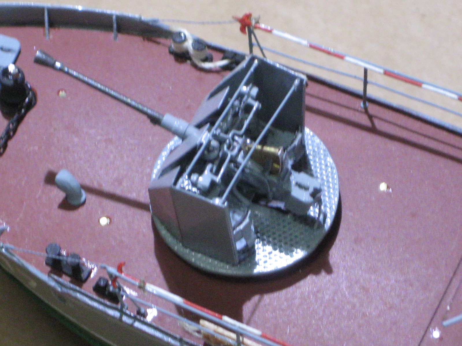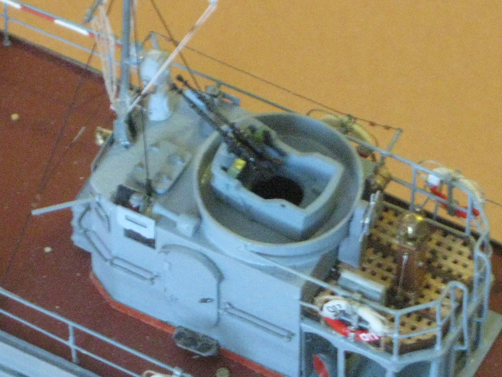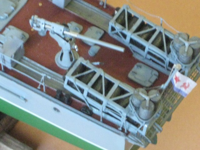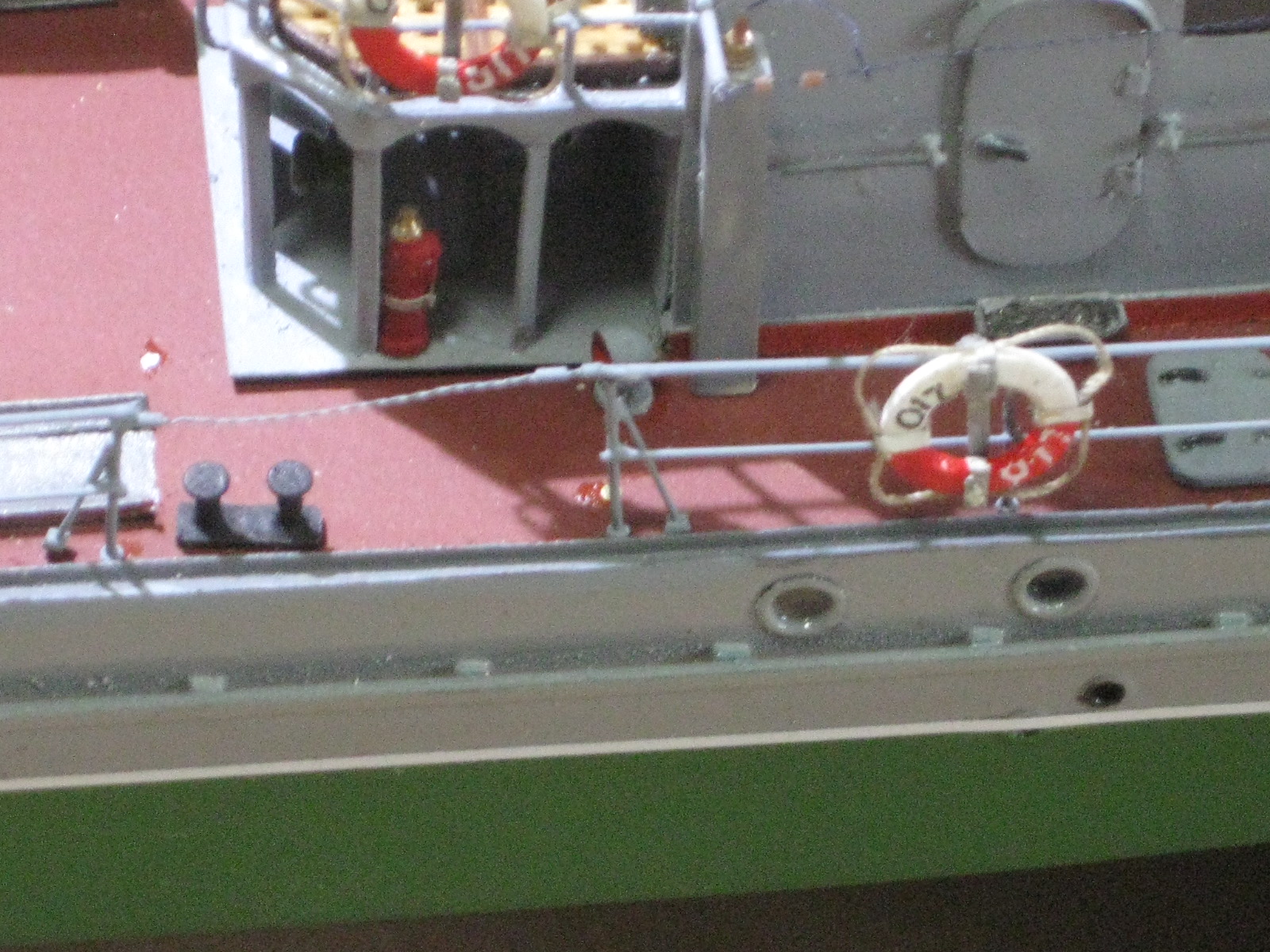 При всем уважении, но модель сделана на уровне чуть выше качества пионерского кружка. Краска блестит и не самым лучшим образом нанесена на всех поверхностях, рыбины не в масштабе и не естественно блестят. Веревки на кругах в растопырку и не обвязаны и ворсятся. Пулеметы "Максим" выполнены очень условно. Петли люков выполнены очень примитивно на детском уровне (просто загнутая проволок? и это в 100-м масштабе?). Очень не понравились кнехты - они выполнены как гвоздики с большими шляпками вбитыми в корпус. Вот такое впечатление производит модель. Увы!