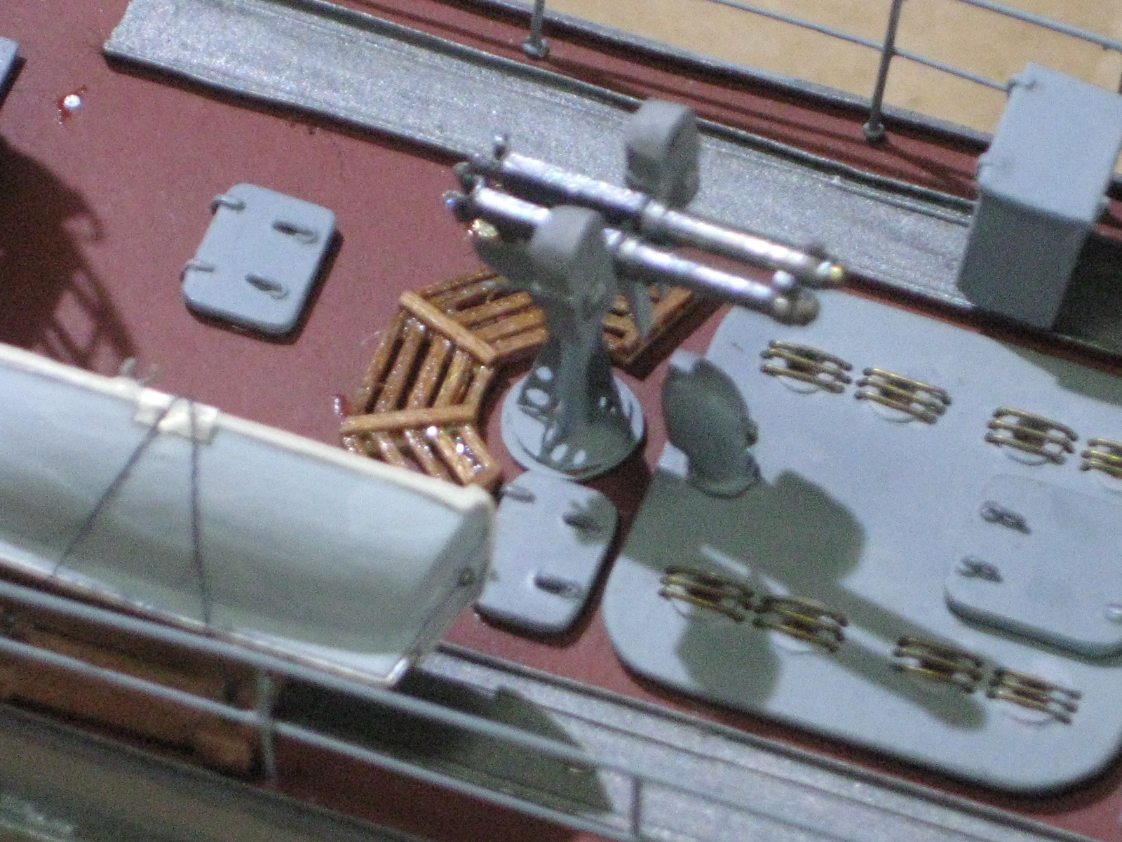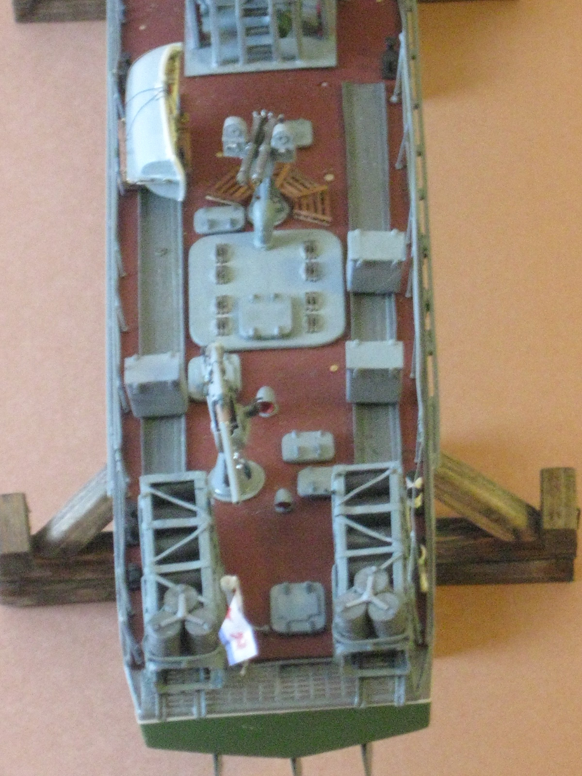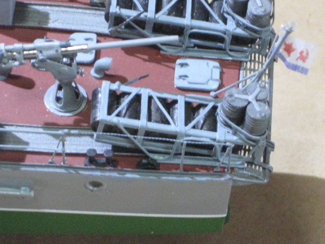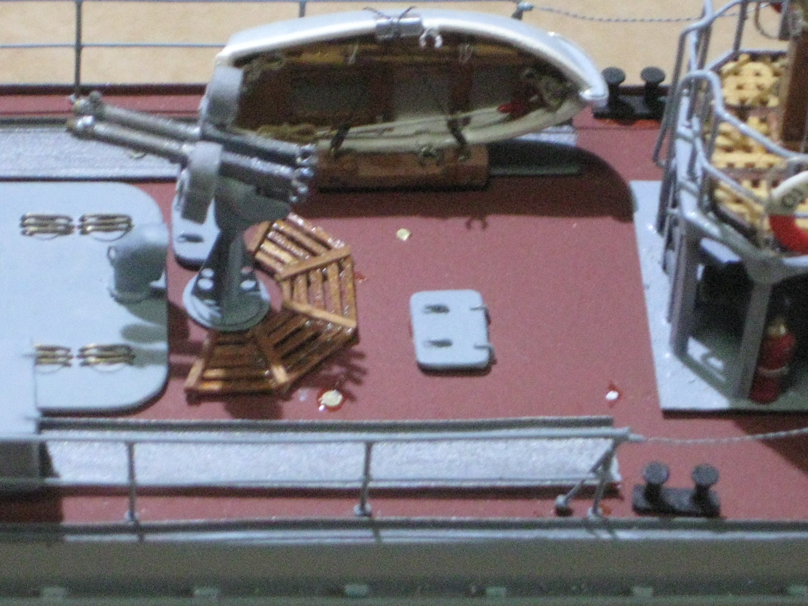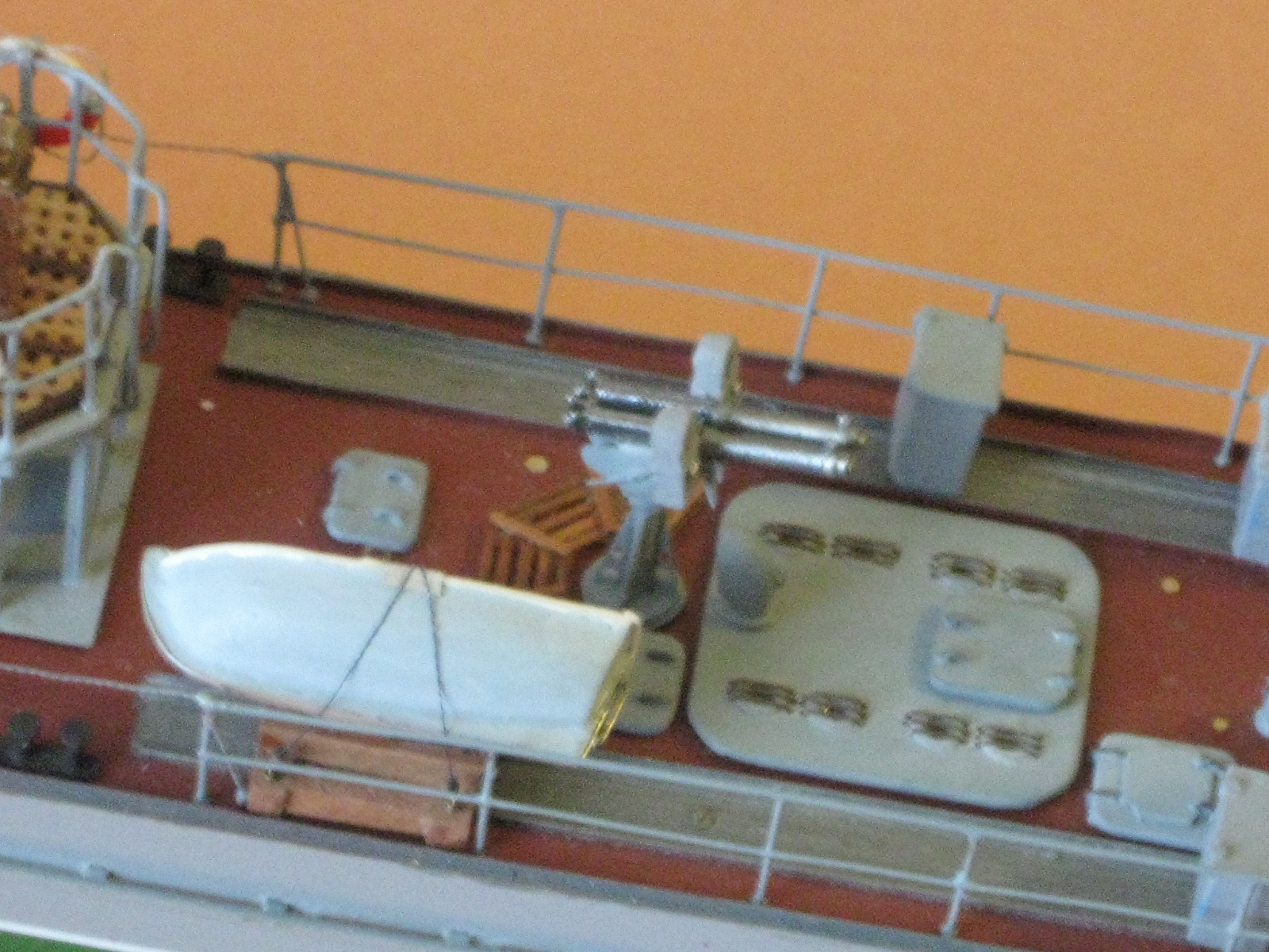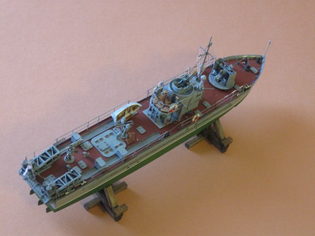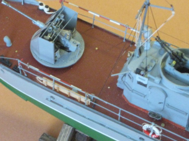 При всем уважении, но модель сделана на уровне чуть выше качества пионерского кружка. Краска блестит и не самым лучшим образом нанесена на всех поверхностях, рыбины не в масштабе и не естественно блестят. Веревки на кругах в растопырку и не обвязаны и ворсятся. Пулеметы "Максим" выполнены очень условно. Петли люков выполнены очень примитивно на детском уровне (просто загнутая проволок? и это в 100-м масштабе?). Очень не понравились кнехты - они выполнены как гвоздики с большими шляпками вбитыми в корпус. Вот такое впечатление производит модель. Увы!