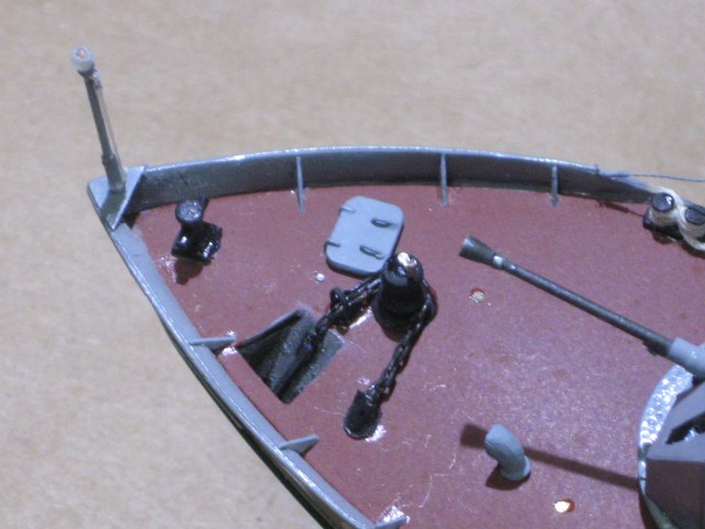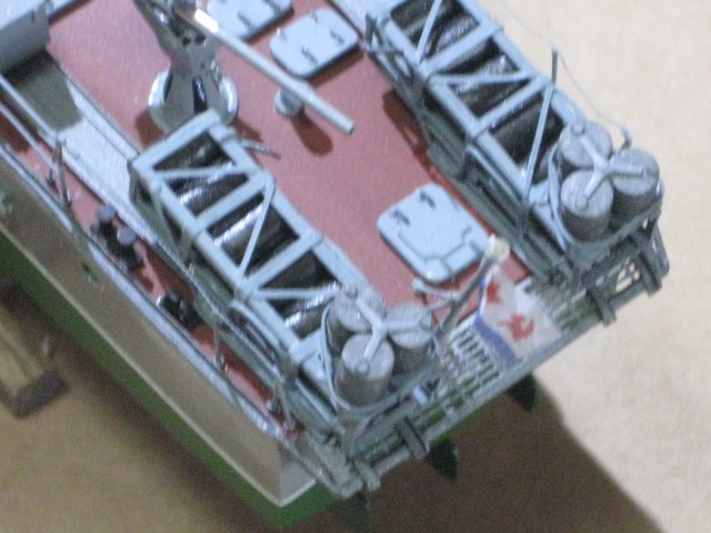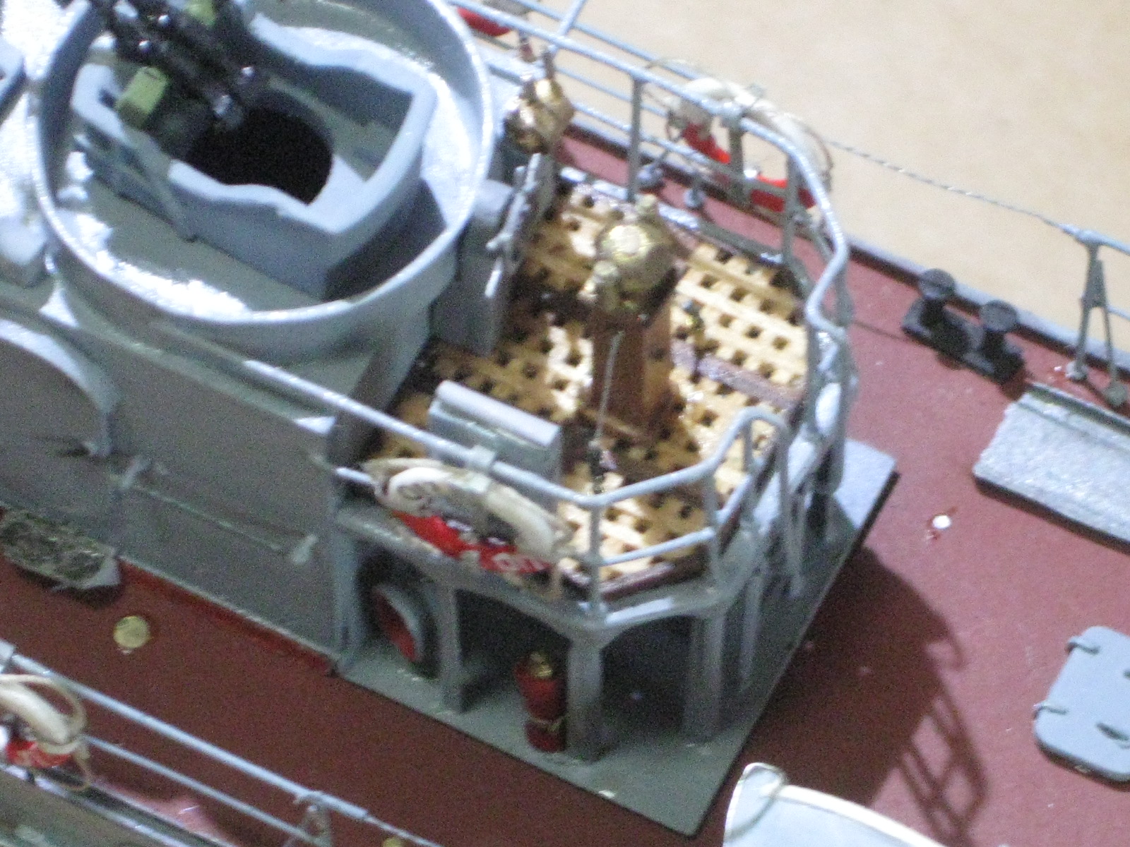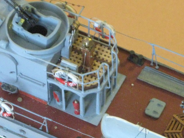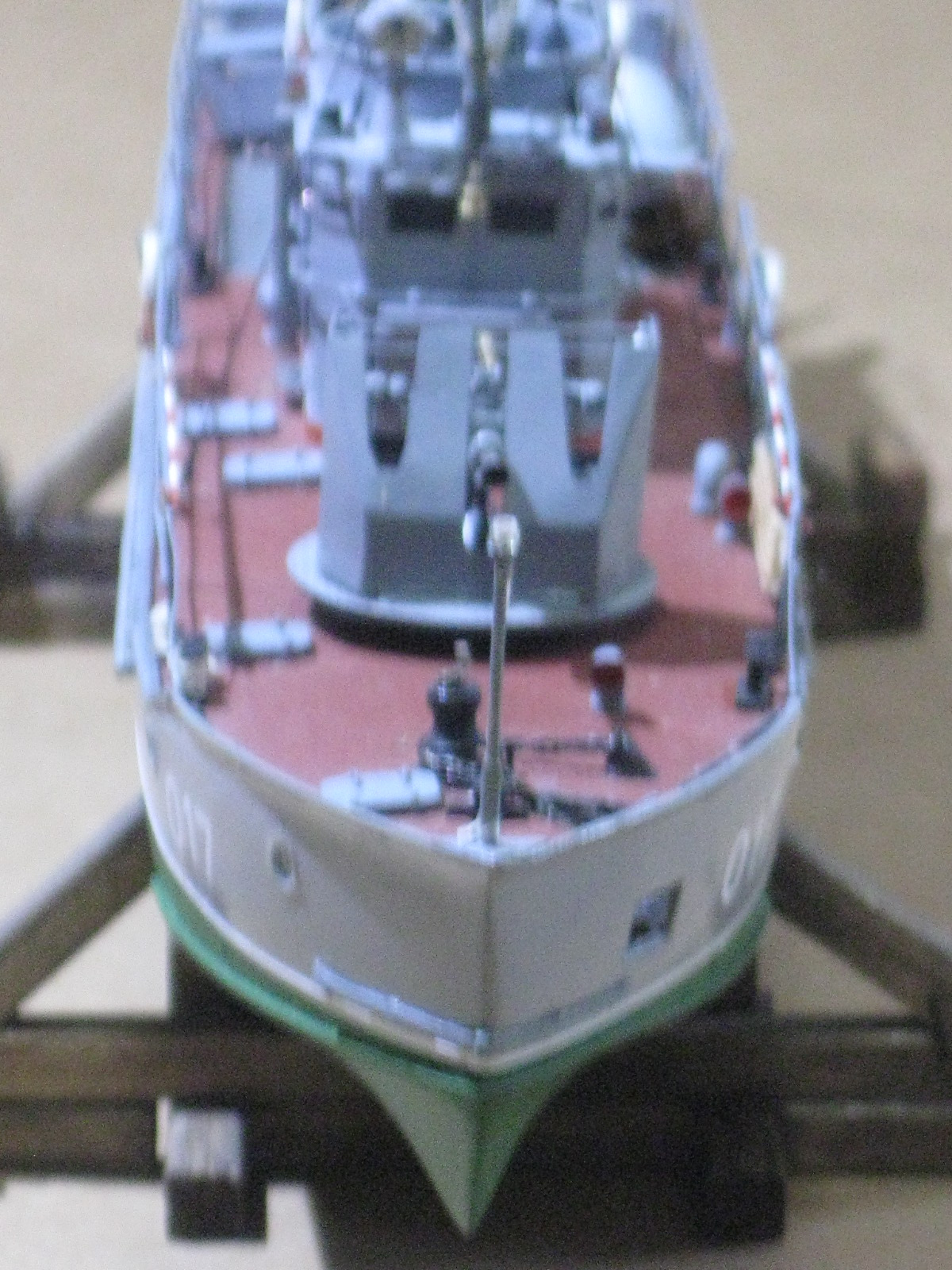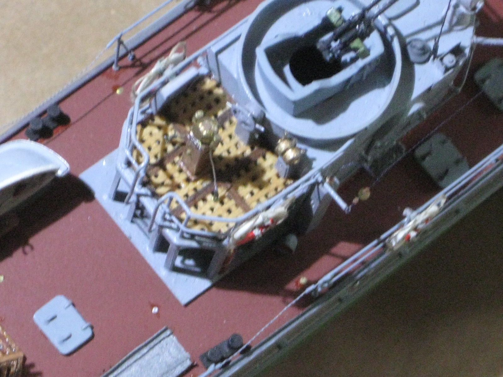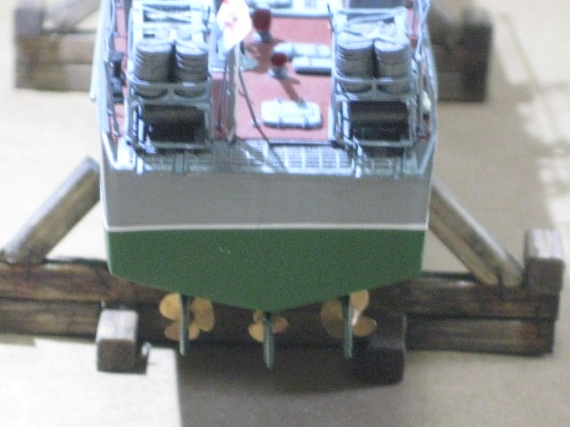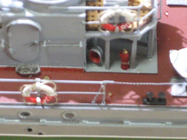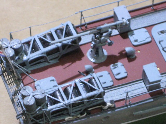 При всем уважении, но модель сделана на уровне чуть выше качества пионерского кружка. Краска блестит и не самым лучшим образом нанесена на всех поверхностях, рыбины не в масштабе и не естественно блестят. Веревки на кругах в растопырку и не обвязаны и ворсятся. Пулеметы "Максим" выполнены очень условно. Петли люков выполнены очень примитивно на детском уровне (просто загнутая проволок? и это в 100-м масштабе?). Очень не понравились кнехты - они выполнены как гвоздики с большими шляпками вбитыми в корпус. Вот такое впечатление производит модель. Увы!