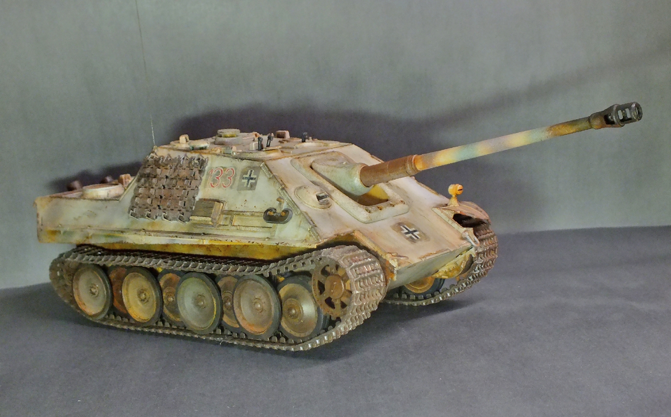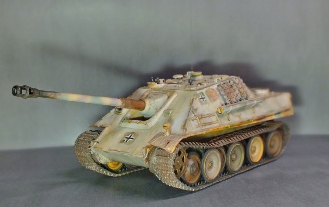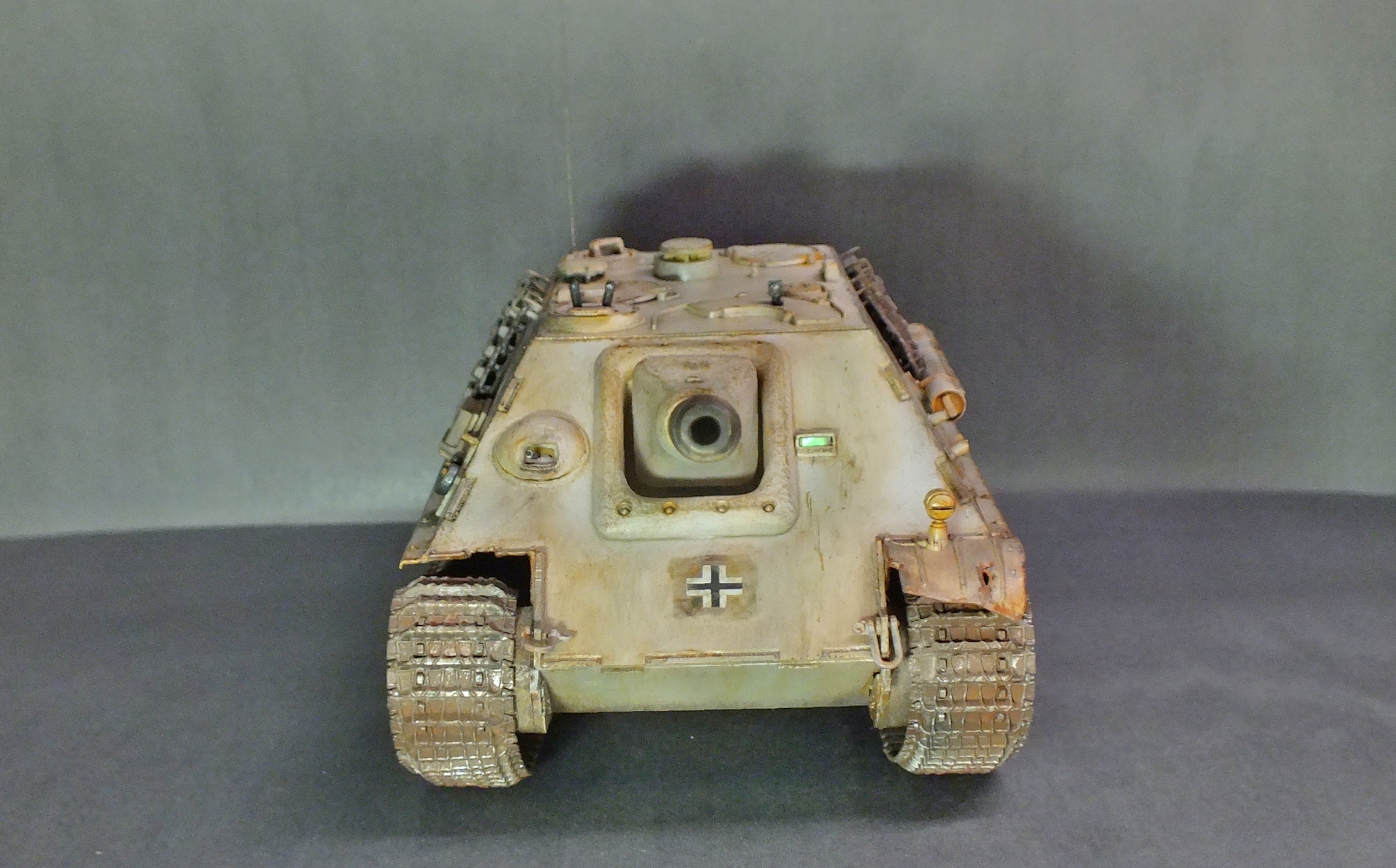 Спасибо разбор модели. По поводу фото "реальной Ягдпантеры" просмотрел большое количество различного фотоматериала. На 90% фото Ягдпантер присутствует сембиоз различных модификаций: от дульного тормоза до выхлопов. Не редко под фото присутствует следующий комментарий: (примерно): Ягдпантера такого то ..., дульный тормоз новый, однако ствол монолит, видим заваренную вторую щель мехвода, или: ствол новый все новое, а катки старые... и так сплошь и рядом.