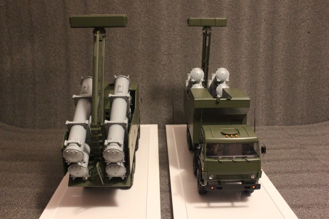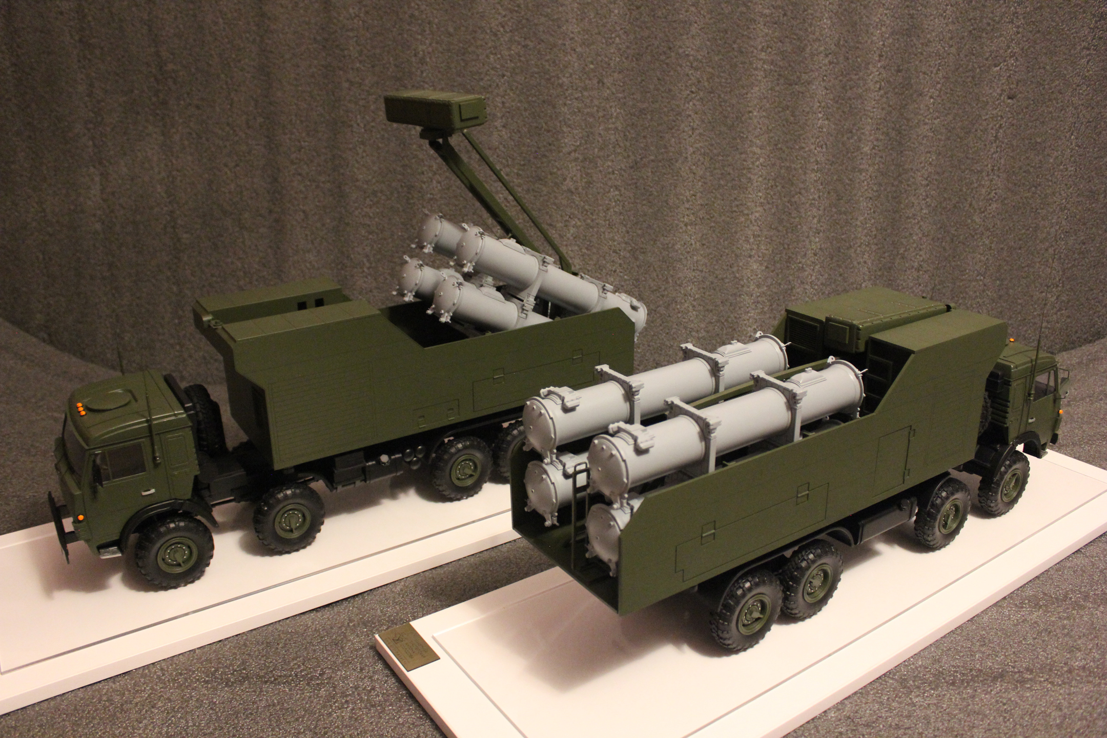 Две модели берегового ракетного комплекса "Рубеж" 1:16 Все детали и элементы выполнены вручную с применением лазерной резки, 3D печати, ручного труда, а также литья из полимерной смолы (колеса). За основу взяты техническое задание и фотографии, чертежи из интернета. Окраска моделей согласно фирменному стилю (без смывок). Для удобства транспортировки модели выполнены разборнми: рама, кунг, кабина. (все части соединяются на микромагнитах) Так же есть подвижно-поворотные элементы рама с ракетными контейнерами и локатор.