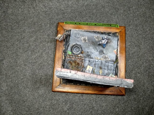 Спасибо большое! Сначала все сделал ровно, потом меня поправили, что для диорамы нужно сюжет делать под небольшим углом, мол с поворотом. Тогда я решил взять рамку шире, повернуть в ней диораму, а пустоту заполнить шпатлевкой. Таблички сделал две, одну больше (она на фото), вторую меньше - её испортил.