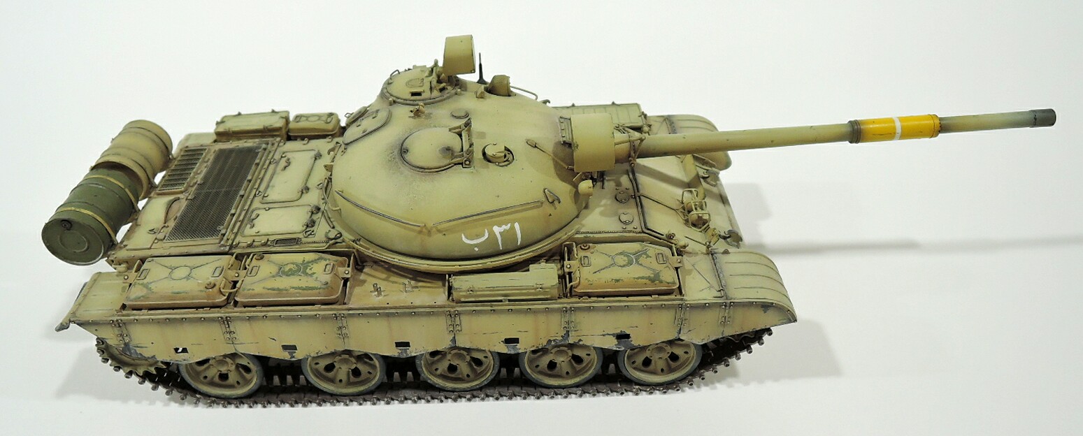 На модели были переделаны и добавлены сварные швы. Крепеж дополнительных баков и крепеж ящиков сделаны с использованием травления от Вояджер , из него же взяты детали улучшающие деталировку.Фары,ИК прожекторы были взяты от модели Т-55 Энигма фирмы Тамия,траки использовал от таком(они уже на 1.2 мм и не цепляются за бортовые экраны), сами бортовые экраны сделаны из листового пластика толщиной 0,5 и 0.2 мм. Окрашивались модель акрилом тамия и валлехо . Тонировка маслом.Вариант окраски армия Ирака конц 80-х годов.