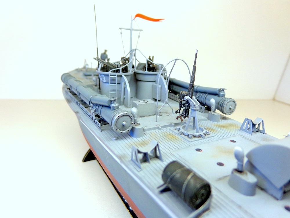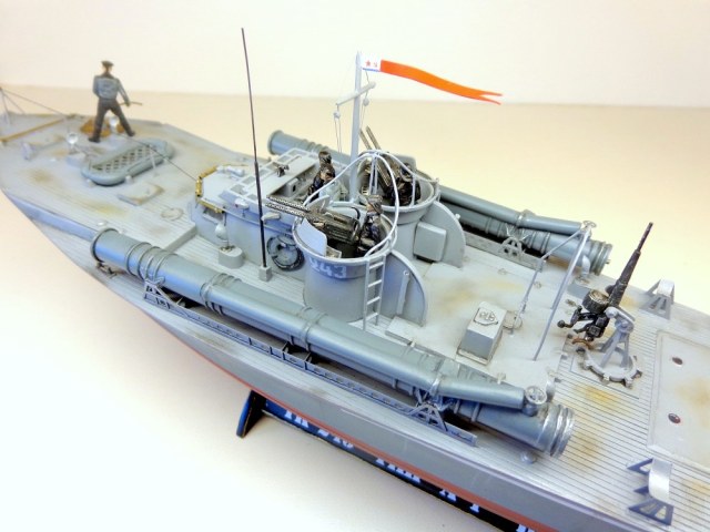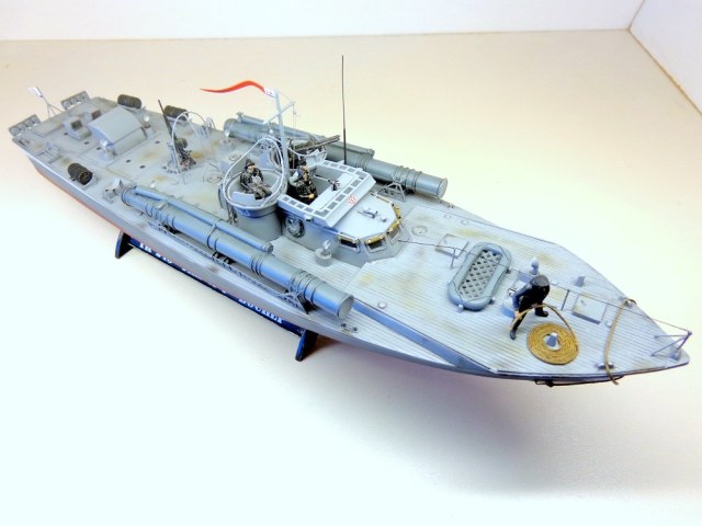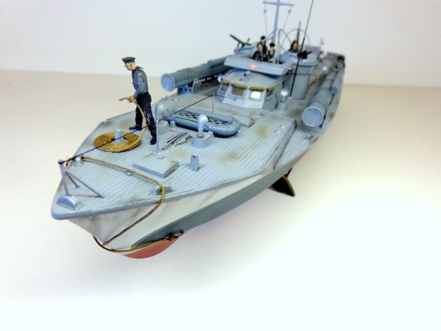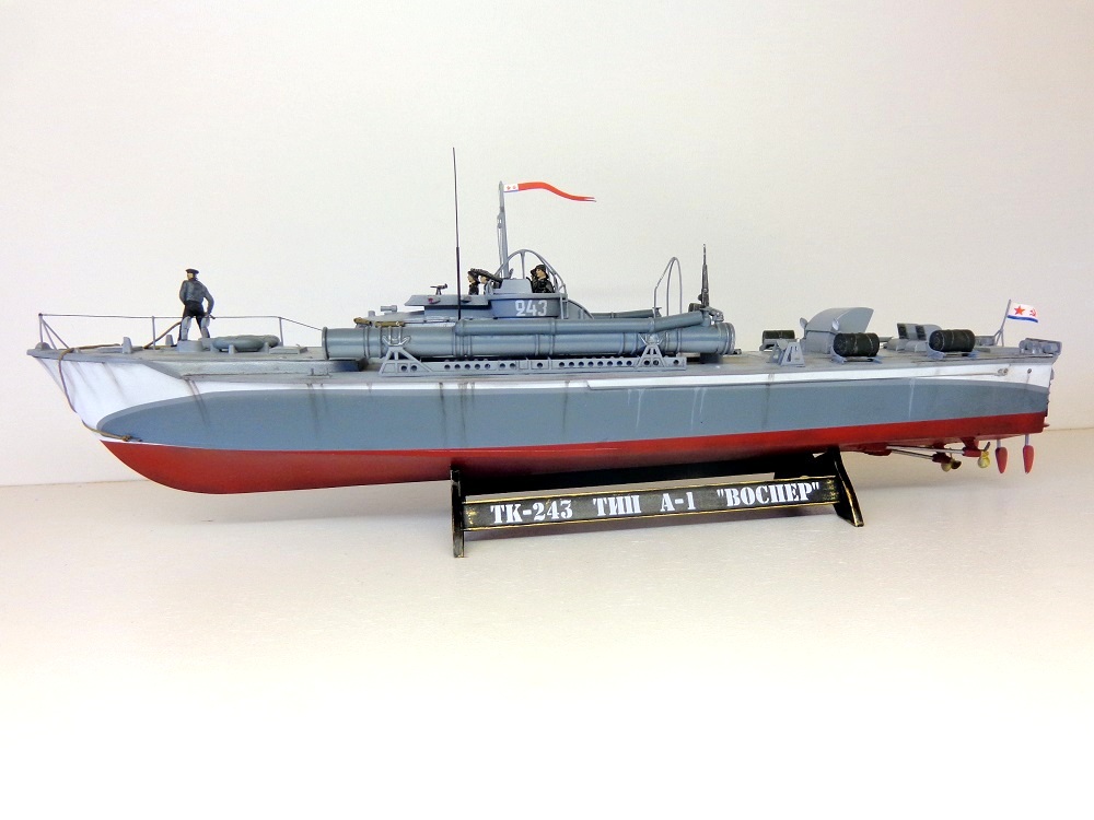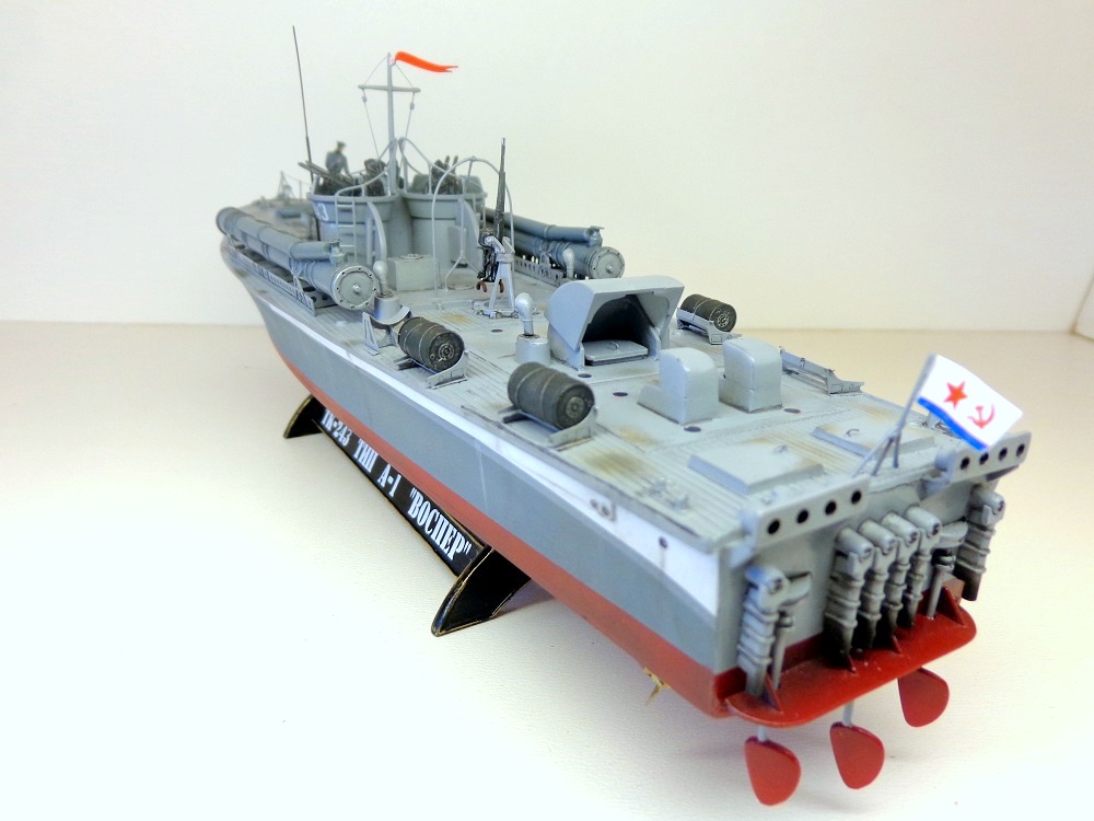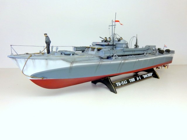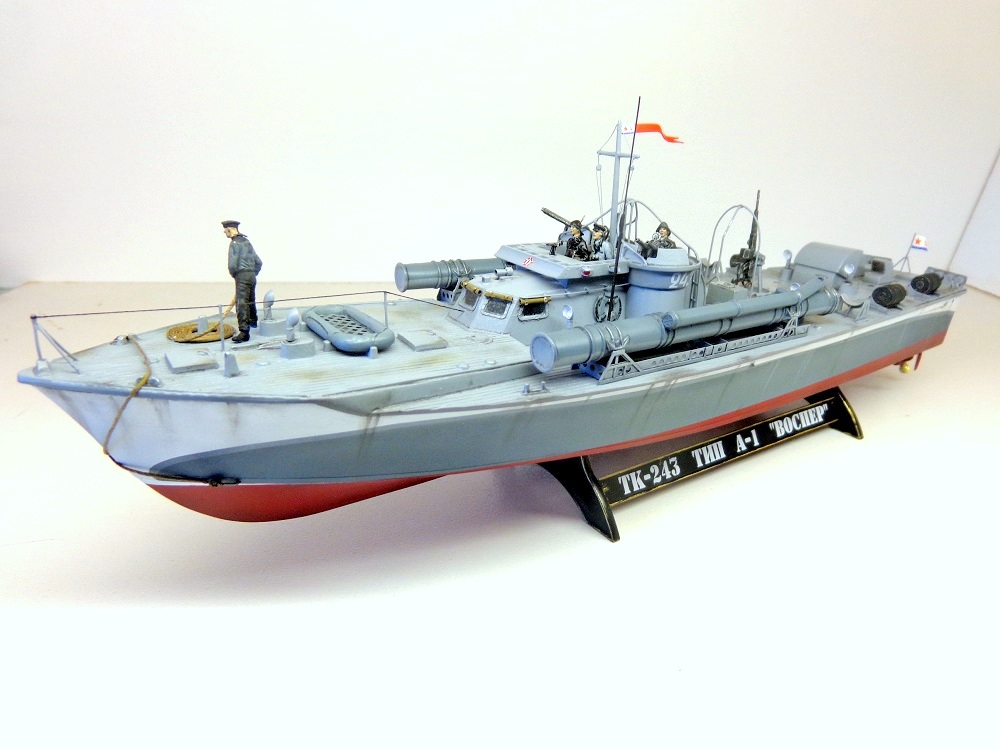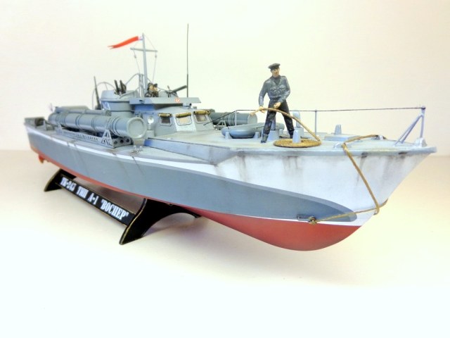 Теперь о самой модели. Давно мне хотелось поставить на полку модель нашего корабля времен войны в любимом самолетном масштабе. Да, только выбирать тут не из чего, единственный вариант - это сделать ленд-лизовский "Воспер" фирмы "Revell". Но только модель была выпущена очень давно, она практически моя ровестница (а я то уже почти достиг пенсионного рубежа). Отсюда явная примитивность модели по сегодняшним меркам. Самое неудачное, что производитель неверно воспроизвел форму корпуса катера и переусердствовал, выделяя дощатое покрытие палубы. Большим подспорьем оказалось то, что в комплект модели мне удалось приобрести ФТД. Я никогда ранее не работал с травлением, а здесь же надо было не просто приклеить какую-то пластиночку на нужное место, а делать объёмные детали или, например, трубочки кожухов пулеметных стволов и шторок свернутых в рулончики. Были очень большие сомнения в успехе. Тем более склеивал всё это гелем "Супер-Момент", а это практически, что клеить железо соплями. Так же для некоторых деталей использовалась проволока 0,5мм. Более мастеровитые коллеги эти детали спаяли бы оловом, я же по-лентяйски клеил проволоку всё теми же "соплями". Наверно, профессиональных судомоделистов-самодельщиков моя модель разочарует. Я не следовал тем вековым канонам этого ремесла, а делал обычную сборную модель из готовых деталей, местами подправляя "матчасть", в меру своих способностей. А вот с "матчастью" то как раз были большие проблемы и неясности. И тут должен выразить большую признательность и благодарность "каропчанину" Сергею Макарову (он же "Малой"), без его участия многие вопросы не решились бы. Окрашено Тимией и Мр.Хобби, цвета выбраны на свой вкус. Декали заказные, от Алексея Бацких. Фигурки от "Revell", не совсем соответствуют форме одежды наших моряков, но других вариантов пока нет, а "оживить" модель очень хотелось. Не скажу, что всё получилось хорошо, но по большому счету доволен результатом. Я бы с огромным удовольствием добавил в коллекцию что-нибудь ещё из моделей нашего "маломерного флота" времен войны в 72-м масштабе, например, туполевский Г-5, Д-3, какой-нибудь речной бронекатер или МО-4. Вот только как бы надоумить разработчиков китайского "Трумпитера" или нашей "Звезды" на такой подвиг.