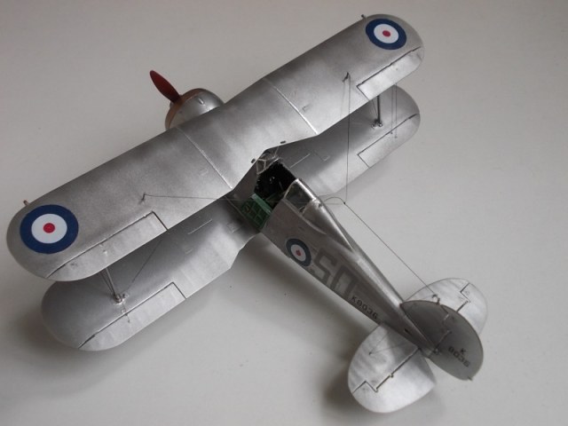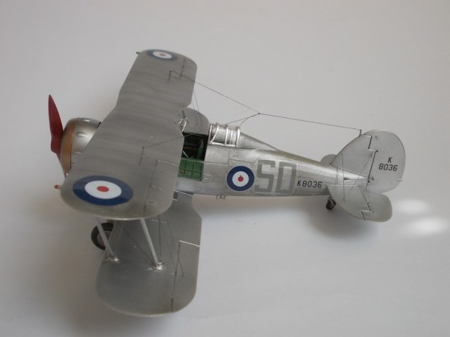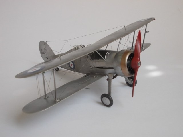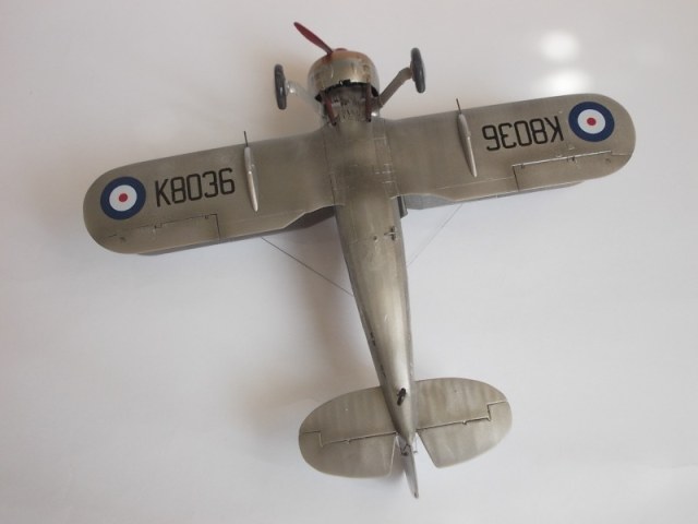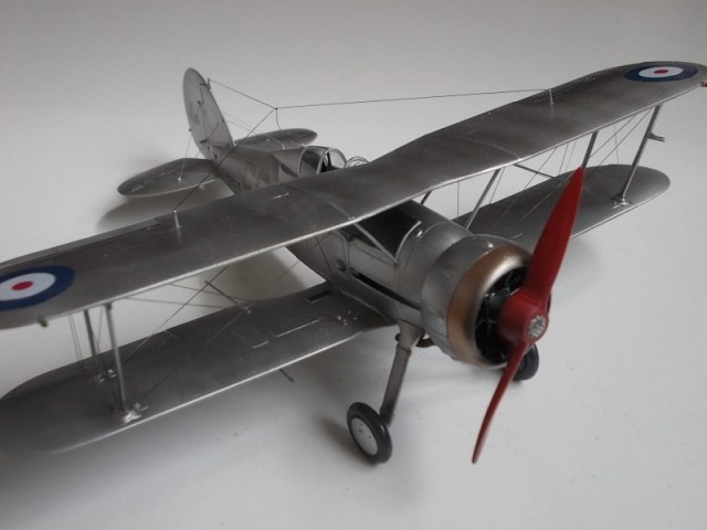 Приветствую,коллеги.Закончилась сборка модели Гладиатор.Модель не из лёгких,но работа получилась.Небольшие проблемы возникли при позиционировании двигателя и его окраске(очень трудно подобраться внутрь) и при установке растяжек.Стволы крыльевых пулемётов заменил на медиглы,на фюзеляже подные,но покрашены чёрным и натёрты графитом.Растяжки из лески 0,10мм.Фонарь обтянут плёнкой-самоклейкой.Красилось автосеребрянкой,краска простояла разбавленной растворителем 647 около 3-х месяцев,но легла нормально.Декали закреплены Сеттером,но не сверху,а ложились на него.Кабина покрашена акрилом,кистью.Представлена модель самолёта 33 Дивизиона Королевских ВВС,Палестина,начало 1939г.Пилот сержант Билл Уэйл,база Рамлех.