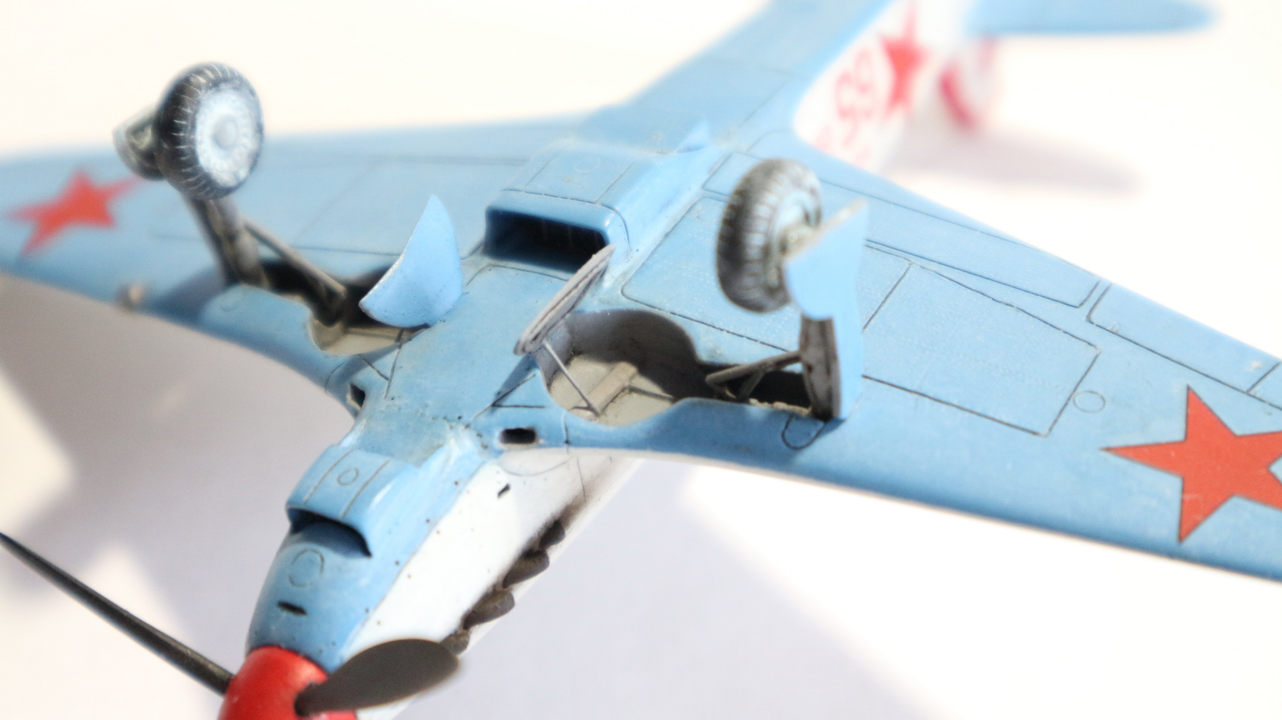 Колеса очень толстые, лучше было бы брать от донора. Щитки стоек шасси толстые и то ли опущены, то ли не соответствуют колесам.