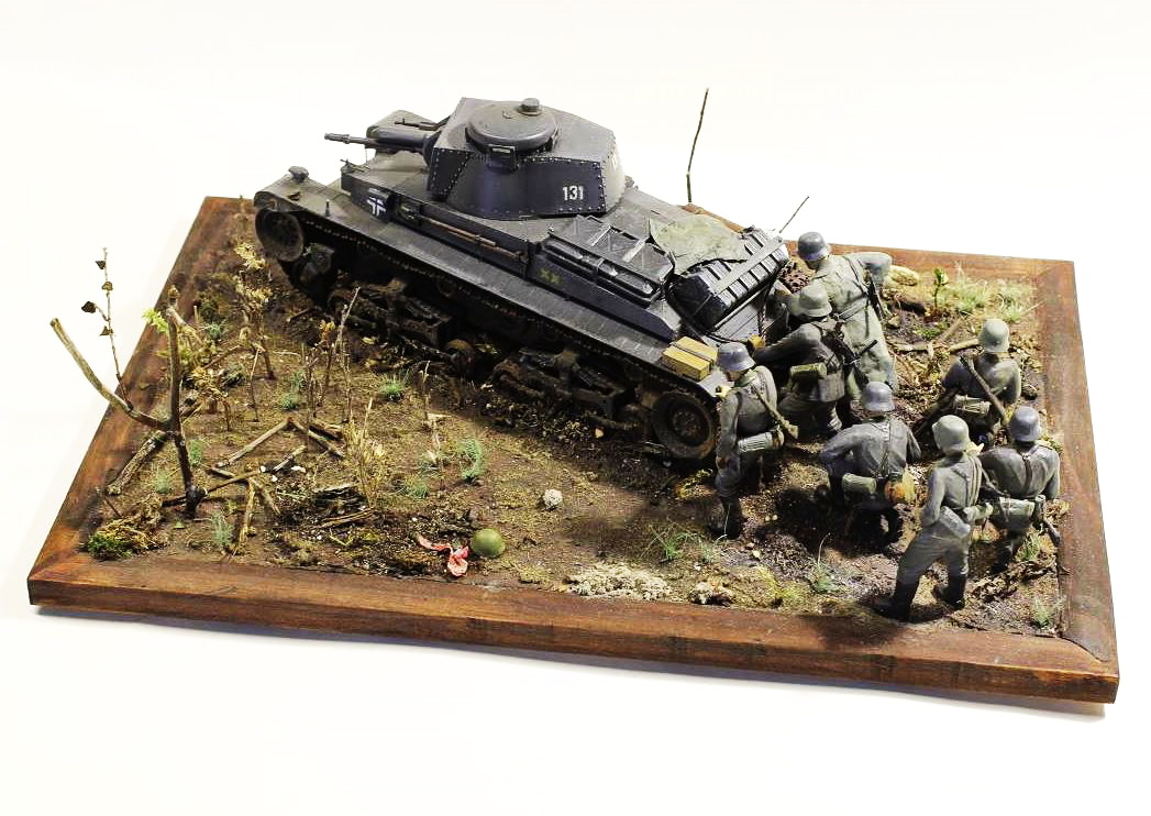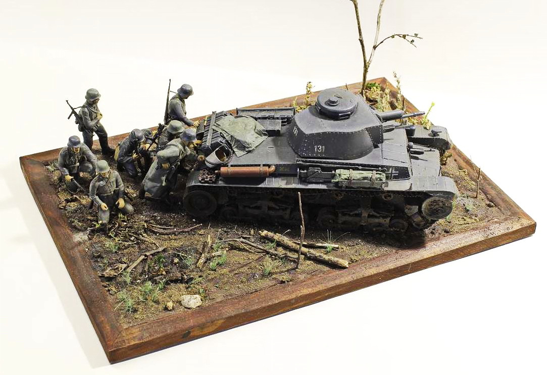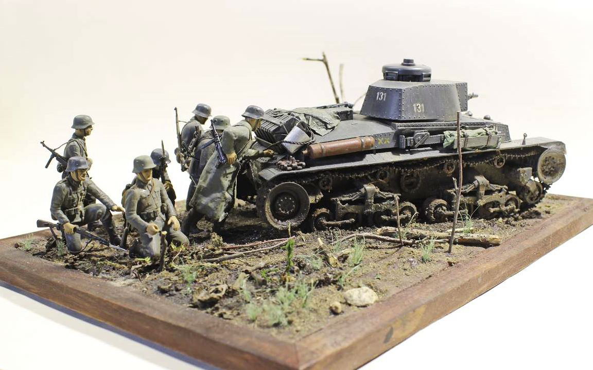 Танк понравился. Местность тоже неплохо воспроизведена. Хорошее сходство композиции с фото реального эпизода. Но фигурки лично мне не понравились. Про блеск, неверно выбранный телесный сказали. Если я правильно разглядел то глаза сымитированы черными точками? Складки на шинелях не выделены.