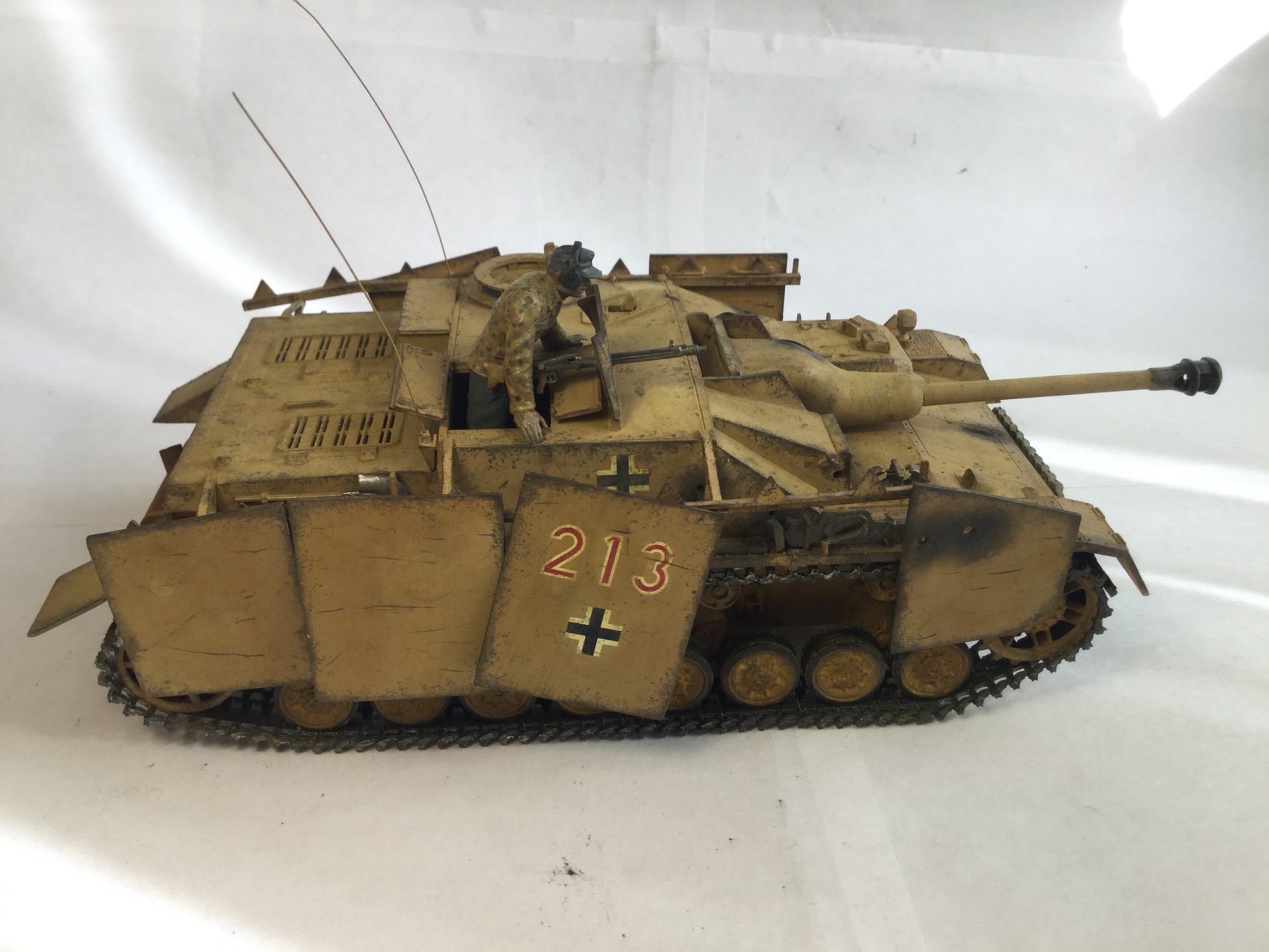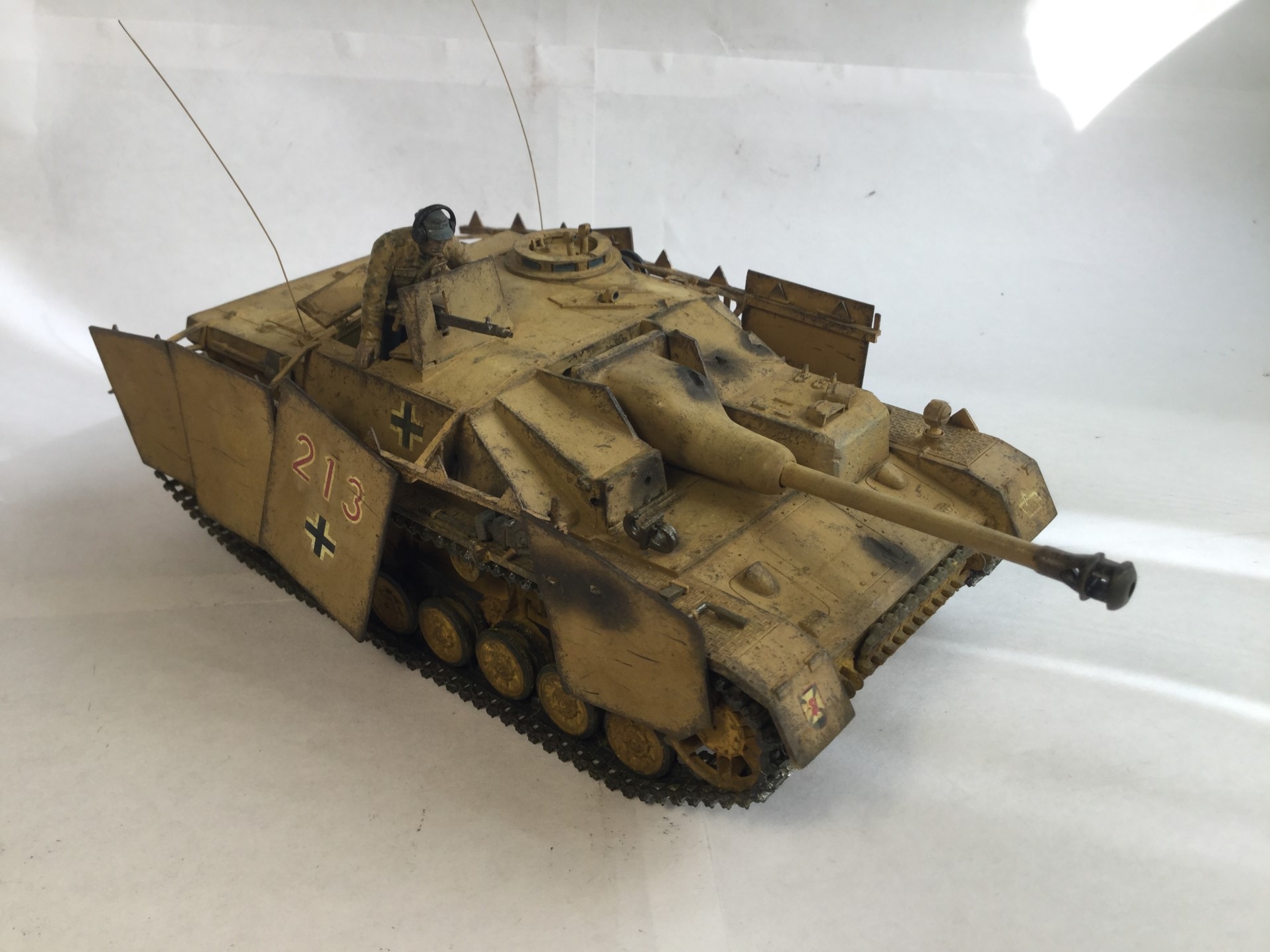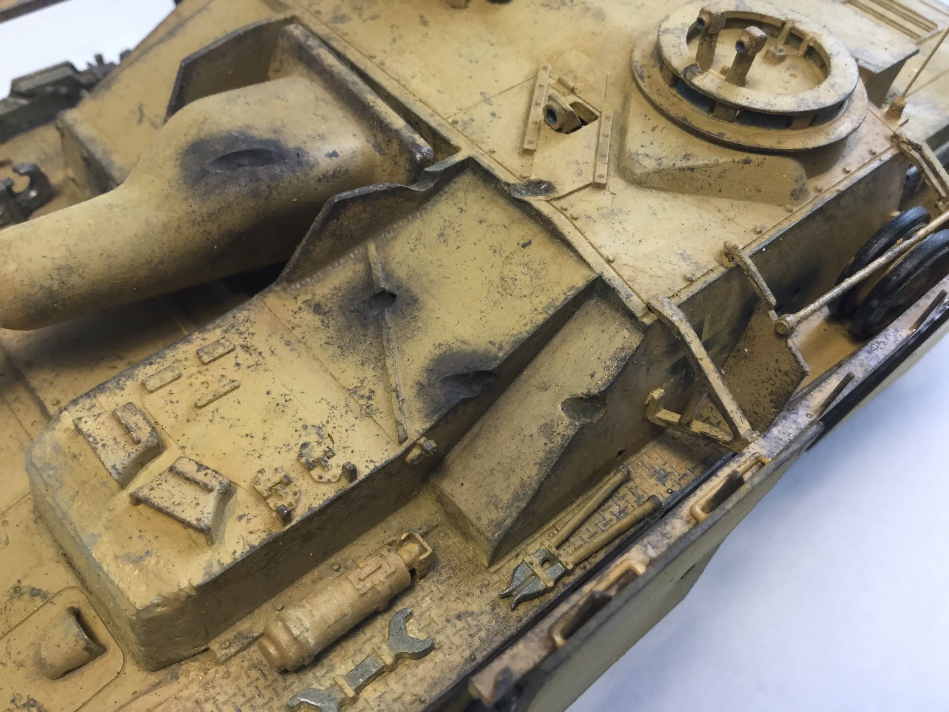 Всем доброго дня. Моя новая модель - Stug IV от Тамии. Качество не самое лучшее, но если считать что на литниках 75 год, то хорошее. Видны даже сварные швы. Шпаклевал мало, сходилось хорошо, только облоя много. Делал из коробки, добавил только антенну. Сделал следы от попаданий снарядов разных калибров. Делал без исторической привязки. Окраска по инструкции, африканский вариант. Красил мастером акрилом от звезды, но он оказался каким-то поддельным, не прокрашивал с первого раза и следы оставлял. Смывка и тонировка самодельные, пигменты Zip и Wilder, сколы Pacific. Старался сделать почище, ведь в пустыне нет грязи. Жду Ваших оценок и комментариев.