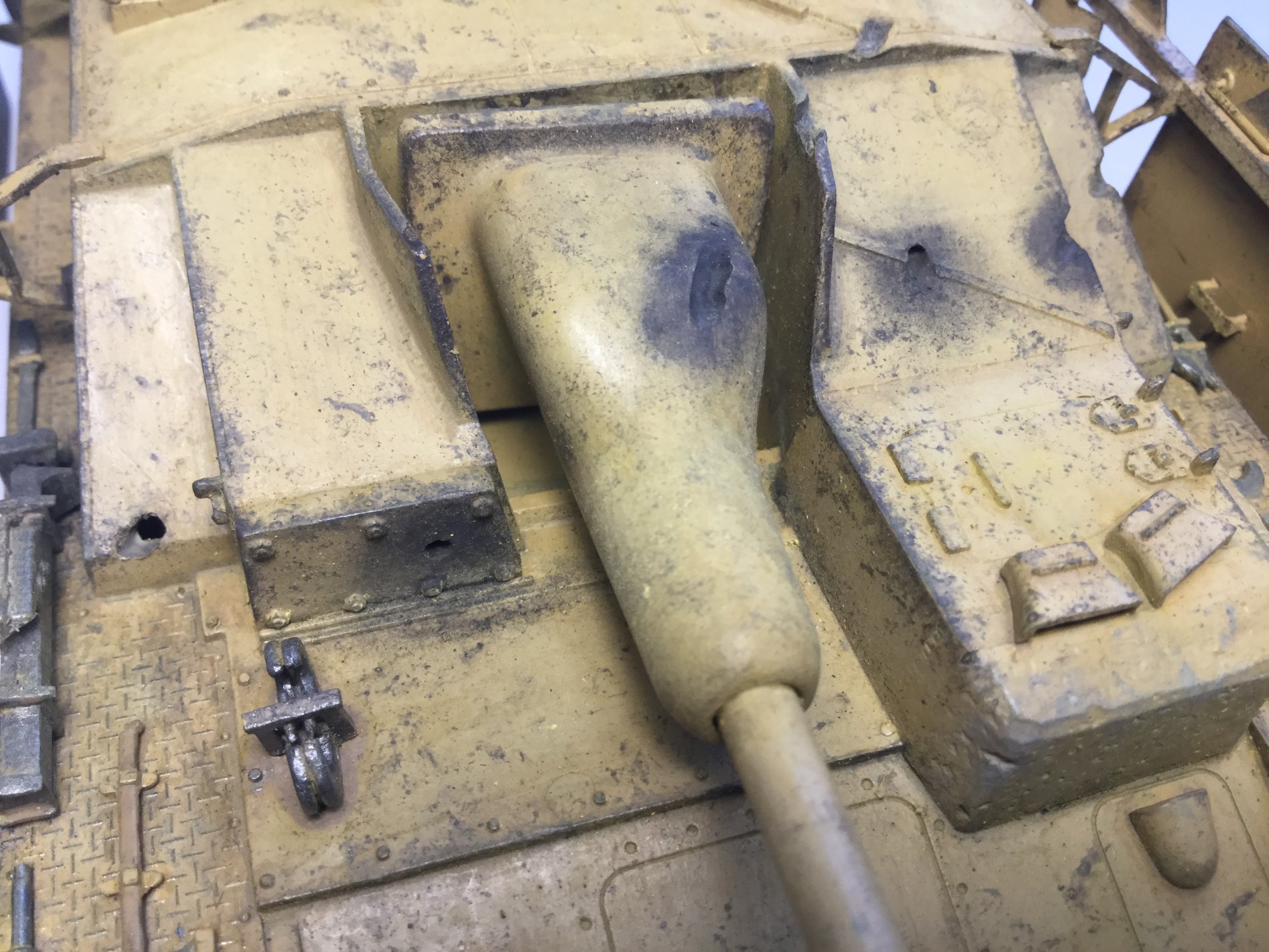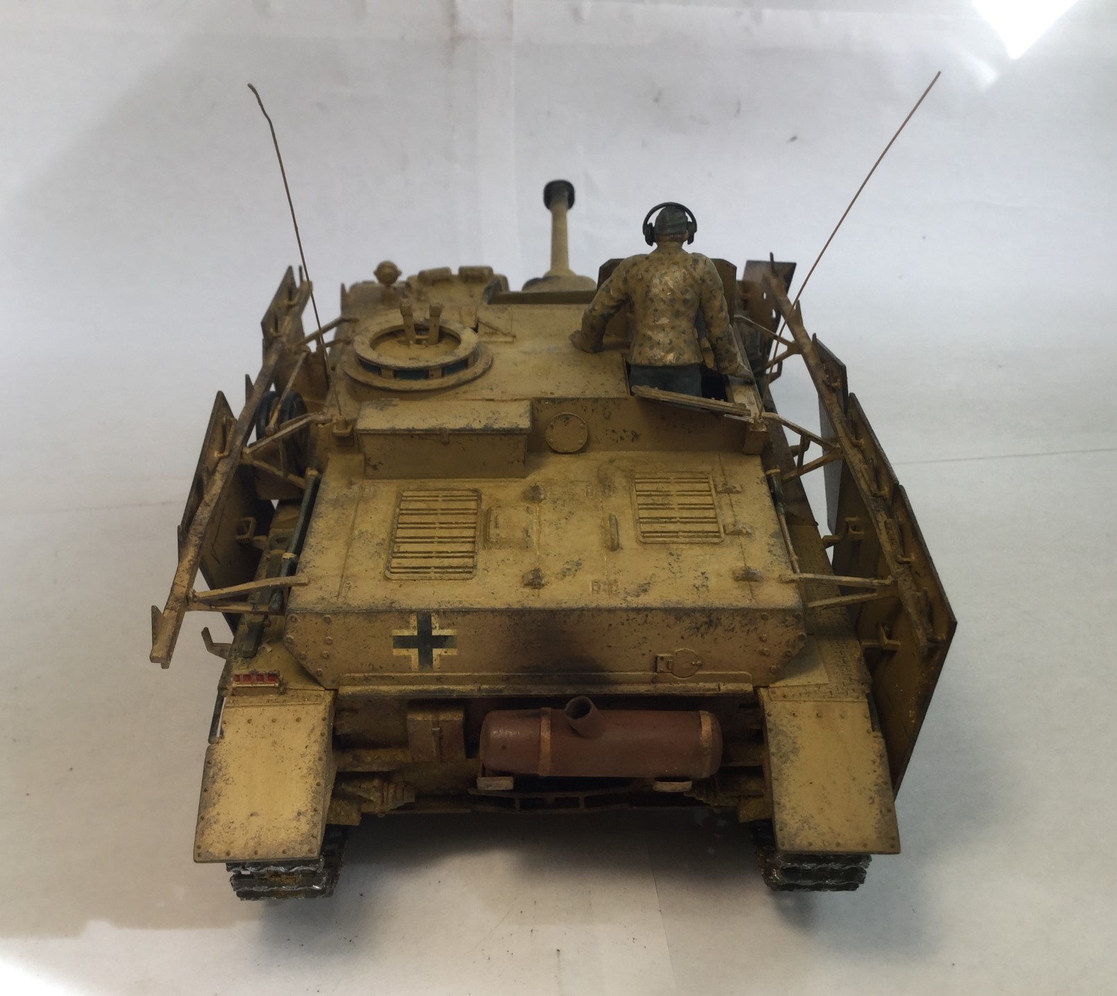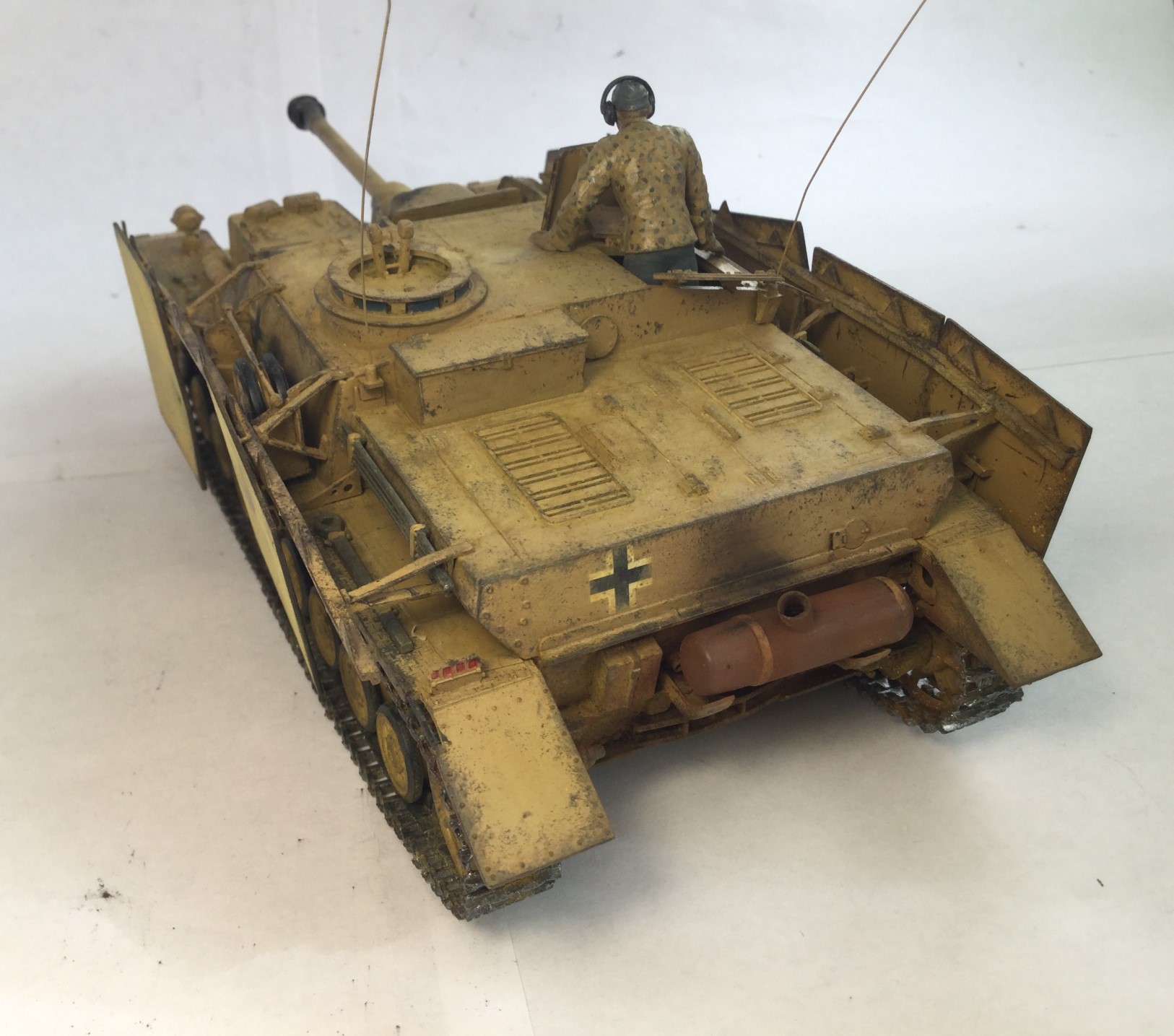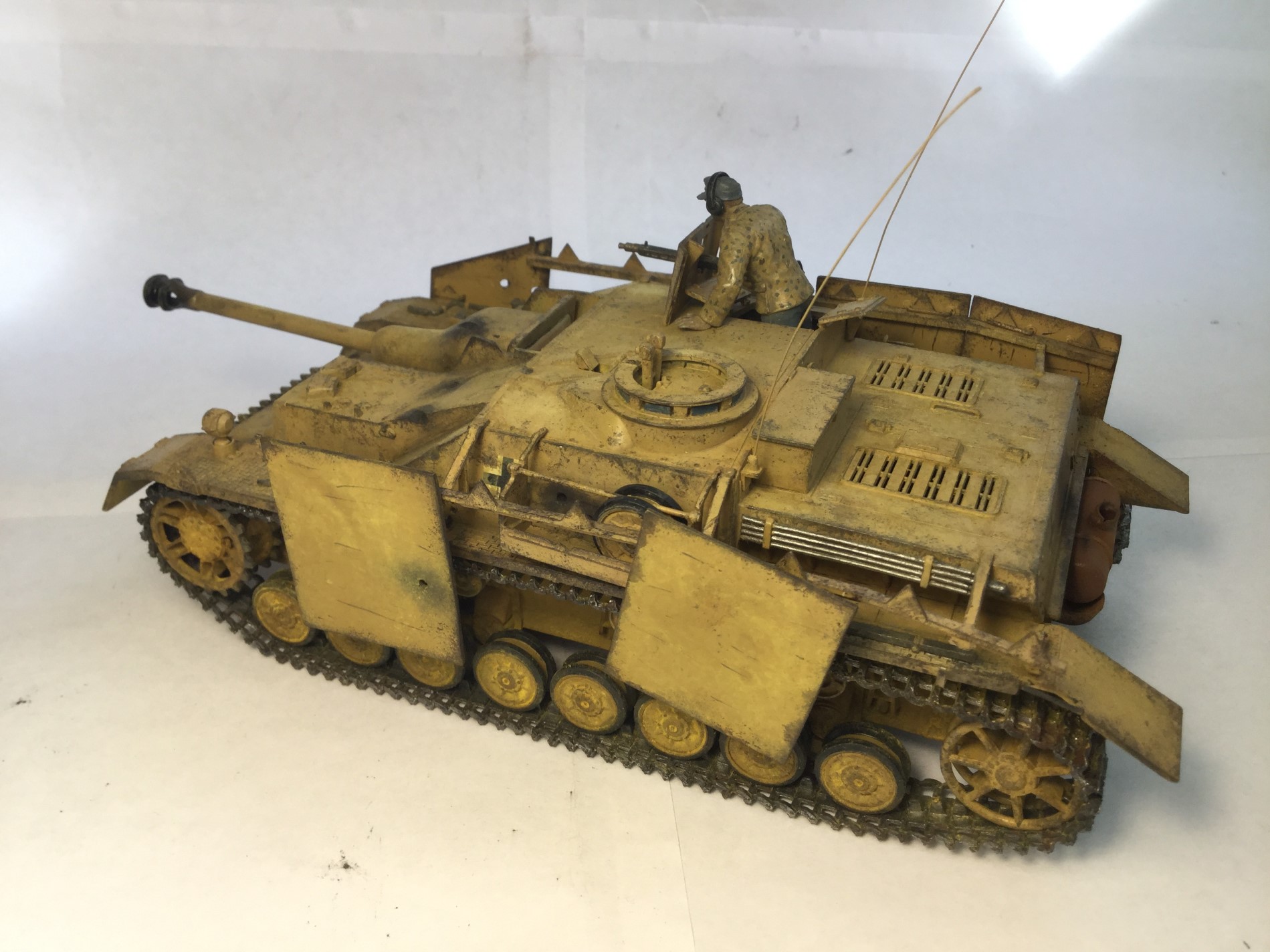 Всем доброго дня. Моя новая модель - Stug IV от Тамии. Качество не самое лучшее, но если считать что на литниках 75 год, то хорошее. Видны даже сварные швы. Шпаклевал мало, сходилось хорошо, только облоя много. Делал из коробки, добавил только антенну. Сделал следы от попаданий снарядов разных калибров. Делал без исторической привязки. Окраска по инструкции, африканский вариант. Красил мастером акрилом от звезды, но он оказался каким-то поддельным, не прокрашивал с первого раза и следы оставлял. Смывка и тонировка самодельные, пигменты Zip и Wilder, сколы Pacific. Старался сделать почище, ведь в пустыне нет грязи. Жду Ваших оценок и комментариев.