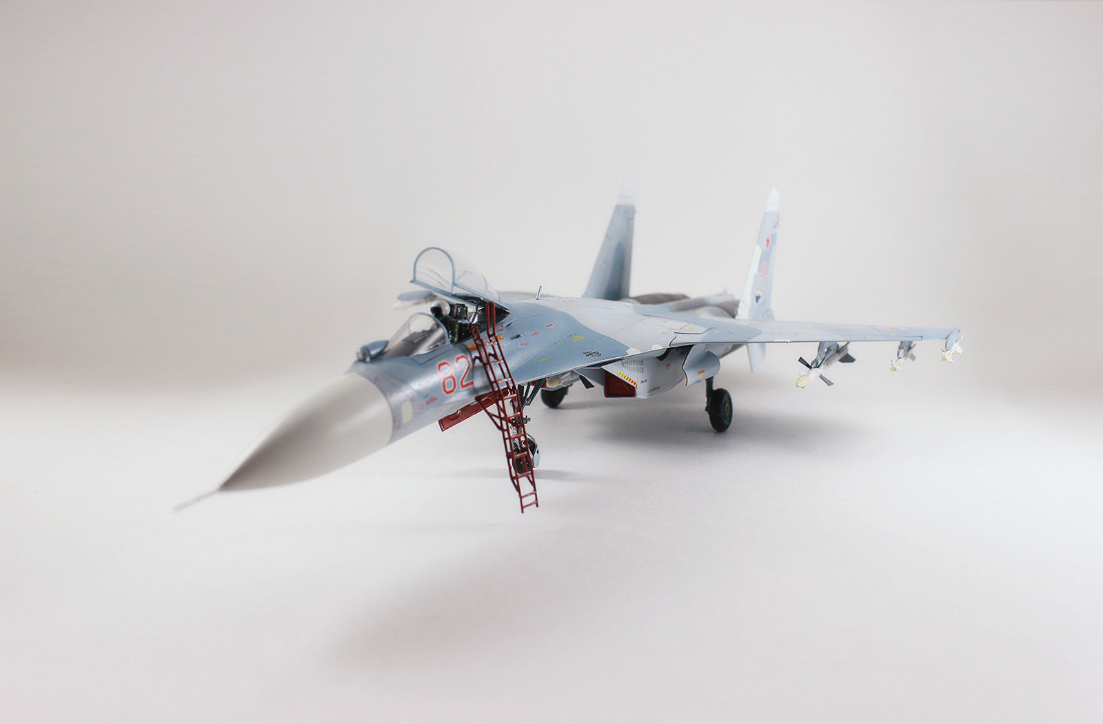 Представляю Вам свою первую "взрослую" модель- российский истребитель Су-27СМ от фирмы "Звезда", масштаб 1:72. Это моя первая работа такого уровня и конечно не обошлось без косяков. В частности, щели между элементами фюзеляжа, но тут виноваты не только мои кривые руки, но и откровенный заводской брак Звезды (один из литников был сильно искривлен, что помешало качественной стыковке деталей). Конечно вопрос можно было решить с помощью шпаклевки, но её я пока не освоил. Больше проблем при сборке не возникло. Не совсем удалась смывка, получилась слишком тусклой, так как сильно залил линии расшивки при грунтовке и покраске. Впервые для покраски модели использовал аэрограф, самый простой и самый дешевый, купленный на известном китайском сайте. Есть,как Вы уже заметили, неточности в матчасти, но откровенно говоря, за ней я не гнался и особо не изучал прототипы. Была цель просто довести модель до конца, так как строилась она больше года, и сил и терпения оставалось всё меньше. Обещаю все косяки и недоделки исправить на следующих работах.