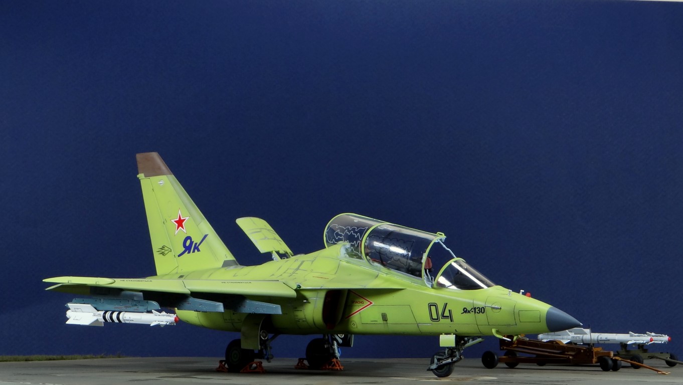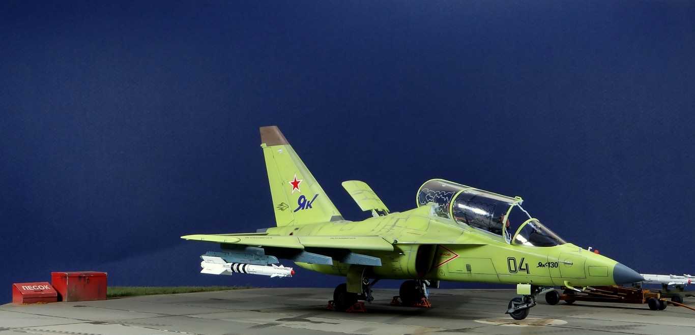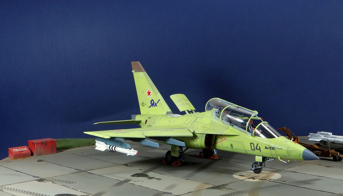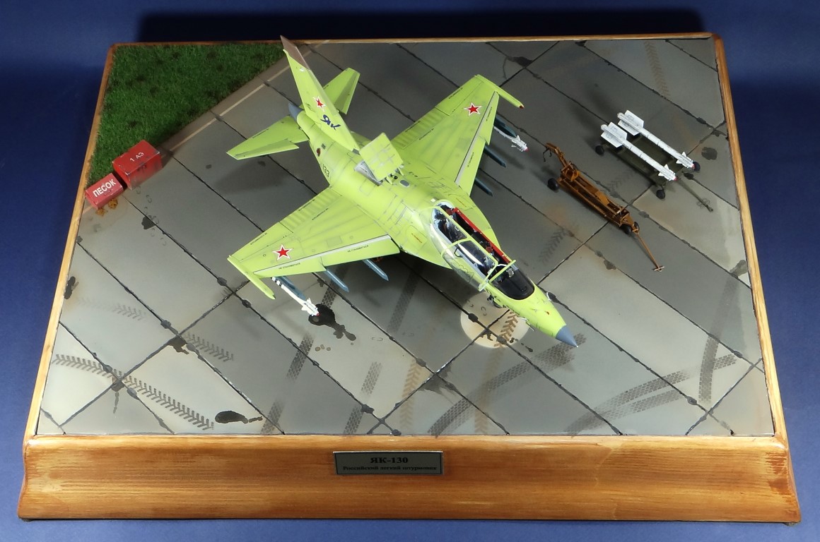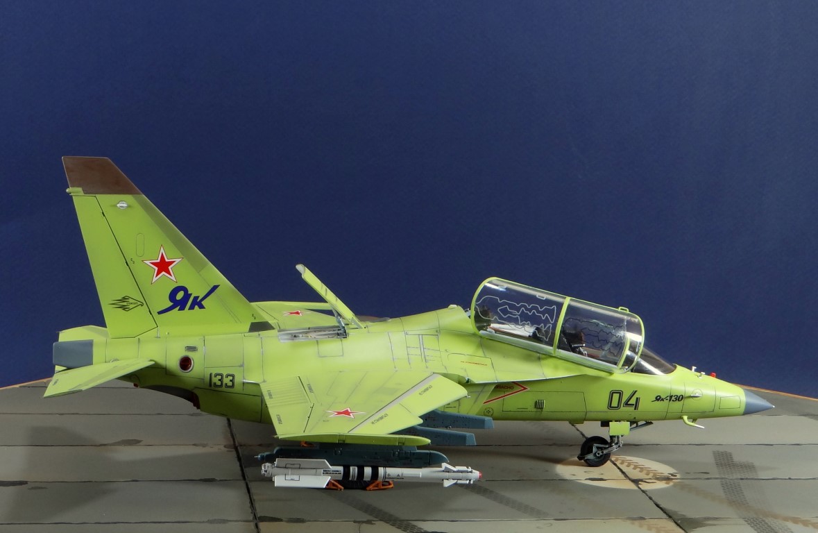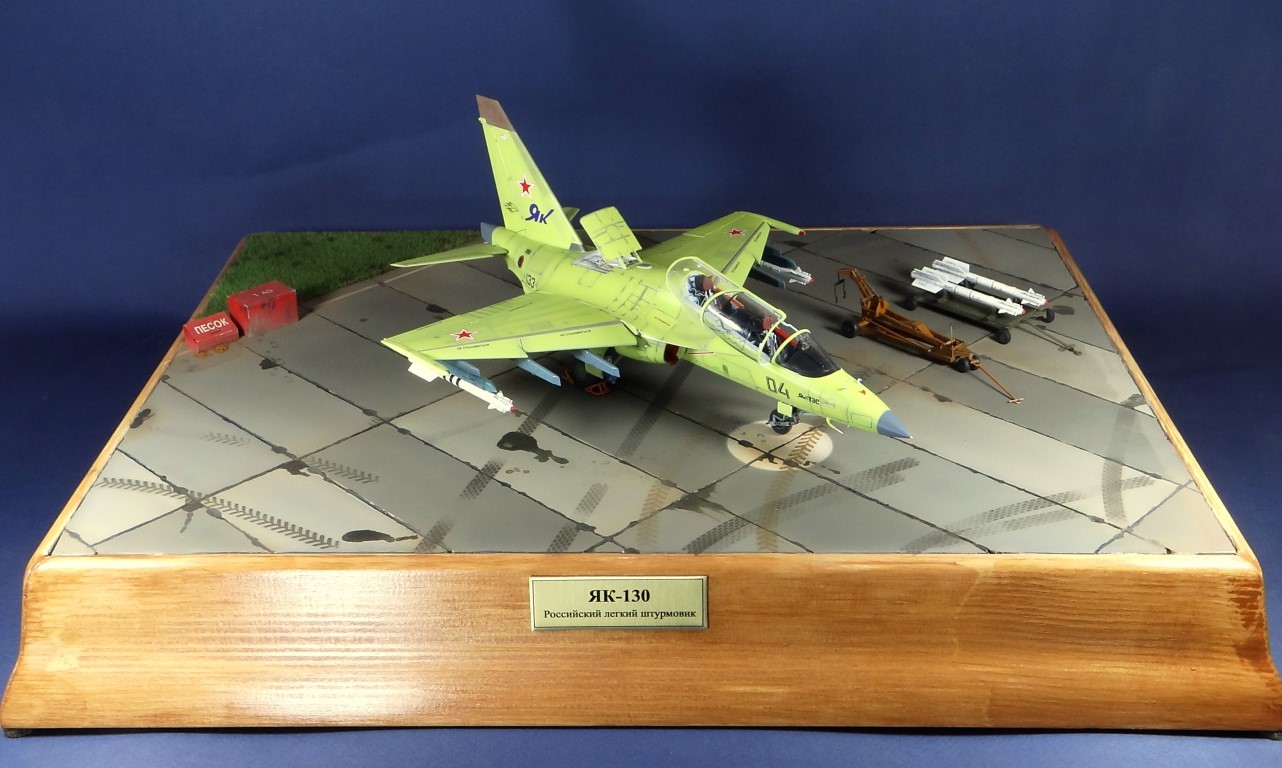 Всех рад приветствовать, уважаемые авиамоделисты и все кто неравнодушен к этому многогранному хобби! Хочу представить вам результат моей трехмесячной работы над моделью и подставкой к ней. Набор пластика от "Звезды" Як-130 в масштабе 1/48, по ходу стройки пришлось приобрести набор того же самолета от "Kitty Hawk", именно в их коробке даются декали на полюбившийся мне борт (04 синий). Так как я стал обладателем сразу двух коробок от разных производителей, сравнив, могу смело сказать, что Звезда превзошла по всем параметрам набор от китайцев. Браво Российской компании! В явные преимущества российского набора можно записать наиболее логичное членение деталей, прекрасно детализированная кабина пилотов, прекрасный по качеству фонарь, который что немаловажно дается двумя вариантами, наличие заглушек сопел и воздухозаборников. В общем от набора Звезды исключительно приятные впечатления, очень достойно! Теперь о моей стройке. В самом начале пути пришлось конечно повозиться с вышкуриванием и окраской внутренней части воздухозаборников, теперь понимаю, что этого можно было и не делать, ведь как можно увидеть, я решил установить заглушки. В остальном сборка была традиционной, можно было бы и вовсе обойтись без шпатлевки, но я ее кое где применил и нарезал расшивку заново. Для тех кто только планирует собирать данную модель-дам совет, приклеивайте жаропрочные панели за соплами до окраски, не доверяйте инструкции, которая предлагает установить их уже окрашенными "на щелчок". После сборки модель была загрунтована Mr. Surfacer 1000 от "Gunze Sangyo", по мне так лучший грунт. Окрашивал красками от "АКАН" 8-й серии, разбавляя до нужной мне консистенции разбавителем от тех же японцев "Gunze" с желтой этикеткой, краска ложится гораздо лучше, попробуйте. Под декали и смывку использовал лак от "Tamiya" X-22, что декали от Звезды, что от "Kitty Hawk" проблем не доставили, разве только что последние более толстые, но зато четче отпечатаны. Смывку изготавливал самостоятельно из масляных красок, по низу черную, а сверху серую. После всех манипуляций задул модель полуматовым эмалевым лаком от "Alclad", после высыхания он дает очень твердый слой и отлично защищает уже окрашенную модель. Как можно увидеть на фото прототипа, по многим местам соединения обшивки присутствуют следы шлифовки до металла, их на своей модели я изобразил очень быстро и удобно карандашом, цветным карандашом! из набора "Сонет Металлики", пробовал и акварельными более именитых марок, но они с более крупным пигментом и не дадут такого результата. Тонировку в виде потеков, царапин и потертостей имитировал при помощи акварельных карандашей различных оттенков, от светло-коричневого, до битумно-черного. Очень удобно, чуть макнул карандаш в воду, нанес точечно где требуется и растушевал или смазал в нужном направлении ватной палочкой. После полной окраски и тонировки пришлось изрядно попотеть с установкой уже готовых стоек шасси в фюзеляж, встают очень туго и внутренняя их детализация крайне тонка и требует быстроты позиционирования и нетрясущихся рук. Стойки и внутреннюю "паутину" ниш шасси дорабатывал самостоятельно из тянутого литника, жаль что этого всего на собранной модели не видно, но есть фото в истории сборки. Родные фары я залил прозрачной эпоксидкой, которая в этот раз немного огорчила, мало того что "запузырилась", 