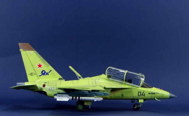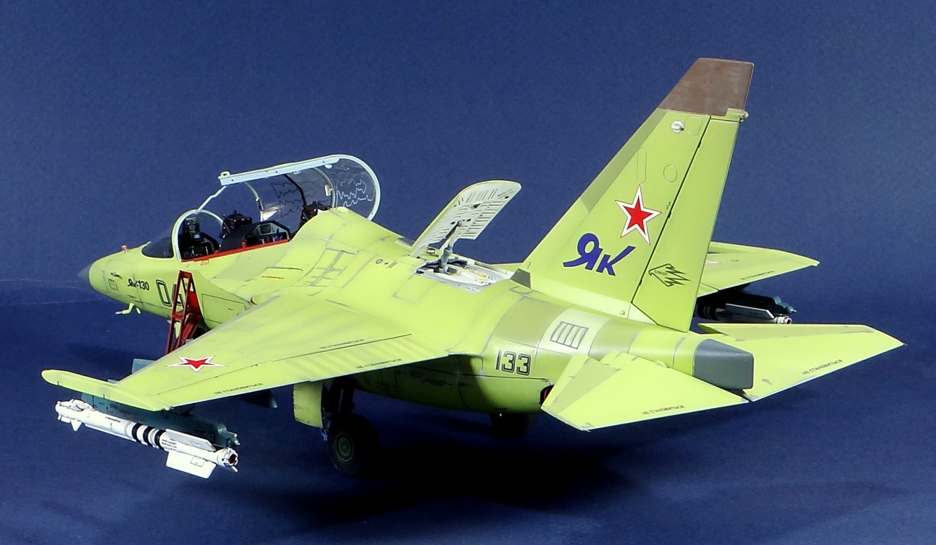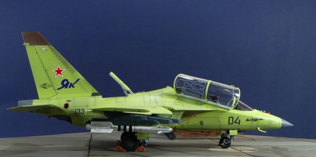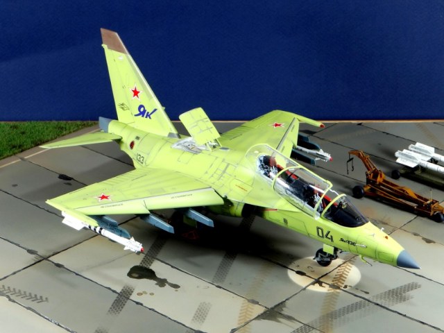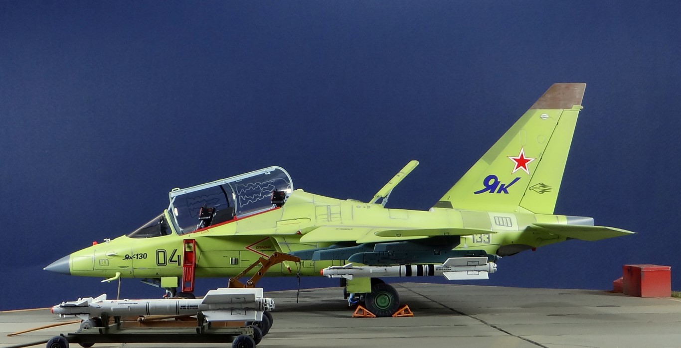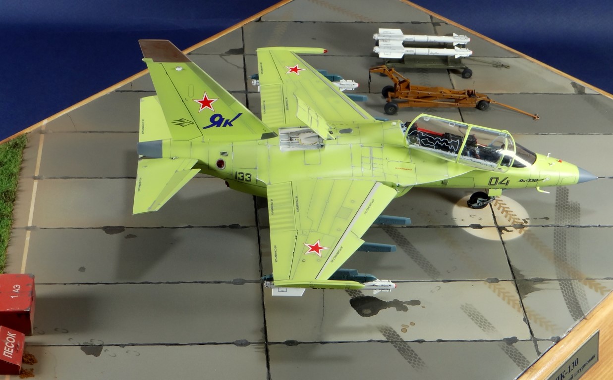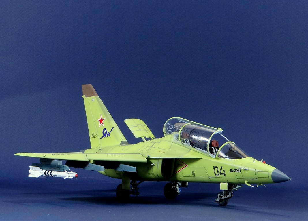 Всех рад приветствовать, уважаемые авиамоделисты и все кто неравнодушен к этому многогранному хобби! Хочу представить вам результат моей трехмесячной работы над моделью и подставкой к ней. Набор пластика от "Звезды" Як-130 в масштабе 1/48, по ходу стройки пришлось приобрести набор того же самолета от "Kitty Hawk", именно в их коробке даются декали на полюбившийся мне борт (04 синий). Так как я стал обладателем сразу двух коробок от разных производителей, сравнив, могу смело сказать, что Звезда превзошла по всем параметрам набор от китайцев. Браво Российской компании! В явные преимущества российского набора можно записать наиболее логичное членение деталей, прекрасно детализированная кабина пилотов, прекрасный по качеству фонарь, который что немаловажно дается двумя вариантами, наличие заглушек сопел и воздухозаборников. В общем от набора Звезды исключительно приятные впечатления, очень достойно! Теперь о моей стройке. В самом начале пути пришлось конечно повозиться с вышкуриванием и окраской внутренней части воздухозаборников, теперь понимаю, что этого можно было и не делать, ведь как можно увидеть, я решил установить заглушки. В остальном сборка была традиционной, можно было бы и вовсе обойтись без шпатлевки, но я ее кое где применил и нарезал расшивку заново. Для тех кто только планирует собирать данную модель-дам совет, приклеивайте жаропрочные панели за соплами до окраски, не доверяйте инструкции, которая предлагает установить их уже окрашенными "на щелчок". После сборки модель была загрунтована Mr. Surfacer 1000 от "Gunze Sangyo", по мне так лучший грунт. Окрашивал красками от "АКАН" 8-й серии, разбавляя до нужной мне консистенции разбавителем от тех же японцев "Gunze" с желтой этикеткой, краска ложится гораздо лучше, попробуйте. Под декали и смывку использовал лак от "Tamiya" X-22, что декали от Звезды, что от "Kitty Hawk" проблем не доставили, разве только что последние более толстые, но зато четче отпечатаны. Смывку изготавливал самостоятельно из масляных красок, по низу черную, а сверху серую. После всех манипуляций задул модель полуматовым эмалевым лаком от "Alclad", после высыхания он дает очень твердый слой и отлично защищает уже окрашенную модель. Как можно увидеть на фото прототипа, по многим местам соединения обшивки присутствуют следы шлифовки до металла, их на своей модели я изобразил очень быстро и удобно карандашом, цветным карандашом! из набора "Сонет Металлики", пробовал и акварельными более именитых марок, но они с более крупным пигментом и не дадут такого результата. Тонировку в виде потеков, царапин и потертостей имитировал при помощи акварельных карандашей различных оттенков, от светло-коричневого, до битумно-черного. Очень удобно, чуть макнул карандаш в воду, нанес точечно где требуется и растушевал или смазал в нужном направлении ватной палочкой. После полной окраски и тонировки пришлось изрядно попотеть с установкой уже готовых стоек шасси в фюзеляж, встают очень туго и внутренняя их детализация крайне тонка и требует быстроты позиционирования и нетрясущихся рук. Стойки и внутреннюю "паутину" ниш шасси дорабатывал самостоятельно из тянутого литника, жаль что этого всего на собранной модели не видно, но есть фото в истории сборки. Родные фары я залил прозрачной эпоксидкой, которая в этот раз немного огорчила, мало того что "запузырилась", 