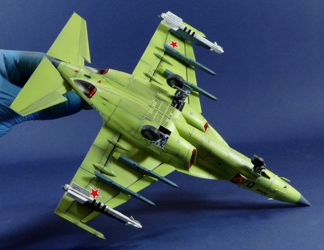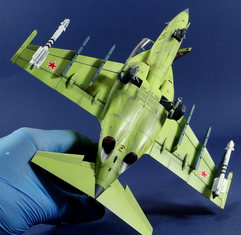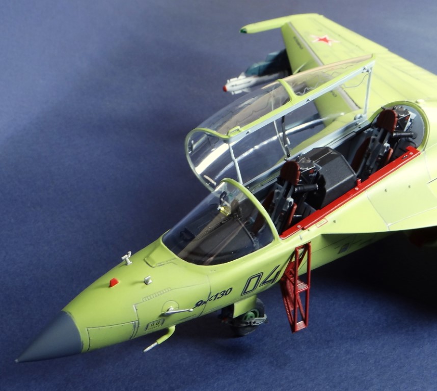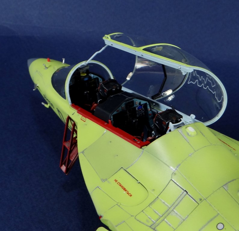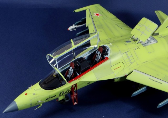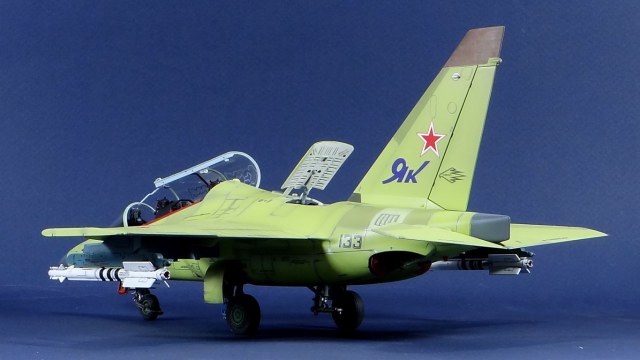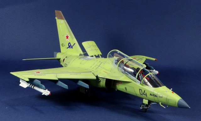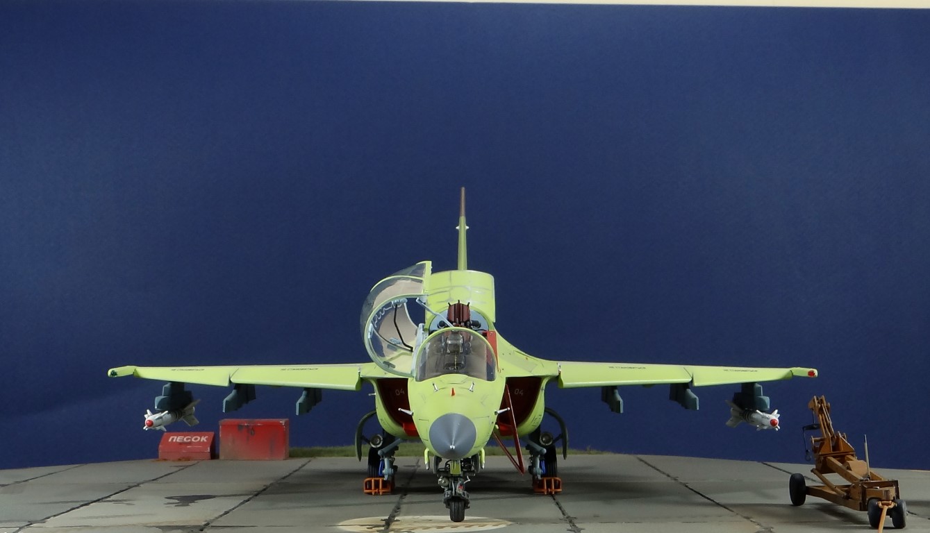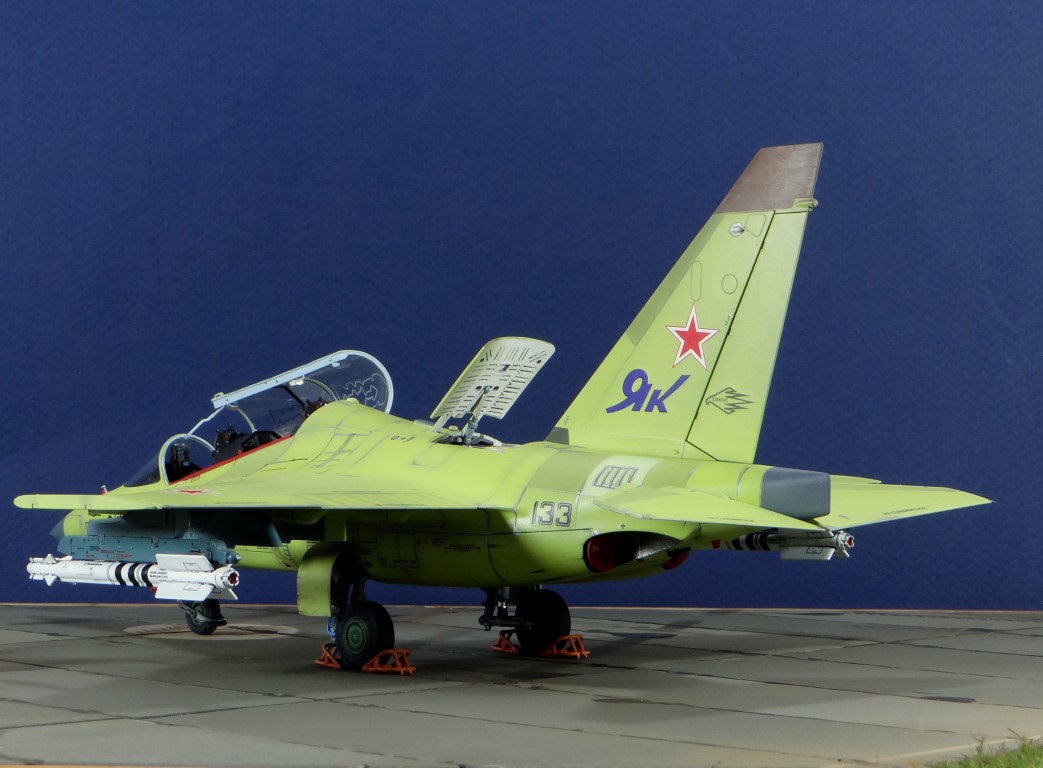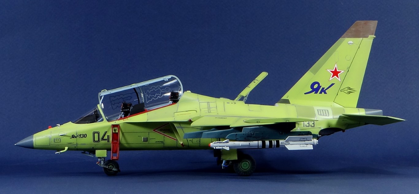 Всех рад приветствовать, уважаемые авиамоделисты и все кто неравнодушен к этому многогранному хобби! Хочу представить вам результат моей трехмесячной работы над моделью и подставкой к ней. Набор пластика от "Звезды" Як-130 в масштабе 1/48, по ходу стройки пришлось приобрести набор того же самолета от "Kitty Hawk", именно в их коробке даются декали на полюбившийся мне борт (04 синий). Так как я стал обладателем сразу двух коробок от разных производителей, сравнив, могу смело сказать, что Звезда превзошла по всем параметрам набор от китайцев. Браво Российской компании! В явные преимущества российского набора можно записать наиболее логичное членение деталей, прекрасно детализированная кабина пилотов, прекрасный по качеству фонарь, который что немаловажно дается двумя вариантами, наличие заглушек сопел и воздухозаборников. В общем от набора Звезды исключительно приятные впечатления, очень достойно! Теперь о моей стройке. В самом начале пути пришлось конечно повозиться с вышкуриванием и окраской внутренней части воздухозаборников, теперь понимаю, что этого можно было и не делать, ведь как можно увидеть, я решил установить заглушки. В остальном сборка была традиционной, можно было бы и вовсе обойтись без шпатлевки, но я ее кое где применил и нарезал расшивку заново. Для тех кто только планирует собирать данную модель-дам совет, приклеивайте жаропрочные панели за соплами до окраски, не доверяйте инструкции, которая предлагает установить их уже окрашенными "на щелчок". После сборки модель была загрунтована Mr. Surfacer 1000 от "Gunze Sangyo", по мне так лучший грунт. Окрашивал красками от "АКАН" 8-й серии, разбавляя до нужной мне консистенции разбавителем от тех же японцев "Gunze" с желтой этикеткой, краска ложится гораздо лучше, попробуйте. Под декали и смывку использовал лак от "Tamiya" X-22, что декали от Звезды, что от "Kitty Hawk" проблем не доставили, разве только что последние более толстые, но зато четче отпечатаны. Смывку изготавливал самостоятельно из масляных красок, по низу черную, а сверху серую. После всех манипуляций задул модель полуматовым эмалевым лаком от "Alclad", после высыхания он дает очень твердый слой и отлично защищает уже окрашенную модель. Как можно увидеть на фото прототипа, по многим местам соединения обшивки присутствуют следы шлифовки до металла, их на своей модели я изобразил очень быстро и удобно карандашом, цветным карандашом! из набора "Сонет Металлики", пробовал и акварельными более именитых марок, но они с более крупным пигментом и не дадут такого результата. Тонировку в виде потеков, царапин и потертостей имитировал при помощи акварельных карандашей различных оттенков, от светло-коричневого, до битумно-черного. Очень удобно, чуть макнул карандаш в воду, нанес точечно где требуется и растушевал или смазал в нужном направлении ватной палочкой. После полной окраски и тонировки пришлось изрядно попотеть с установкой уже готовых стоек шасси в фюзеляж, встают очень туго и внутренняя их детализация крайне тонка и требует быстроты позиционирования и нетрясущихся рук. Стойки и внутреннюю "паутину" ниш шасси дорабатывал самостоятельно из тянутого литника, жаль что этого всего на собранной модели не видно, но есть фото в истории сборки. Родные фары я залил прозрачной эпоксидкой, которая в этот раз немного огорчила, мало того что "запузырилась", 