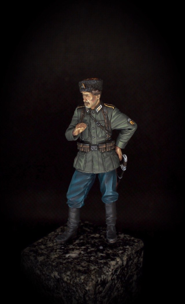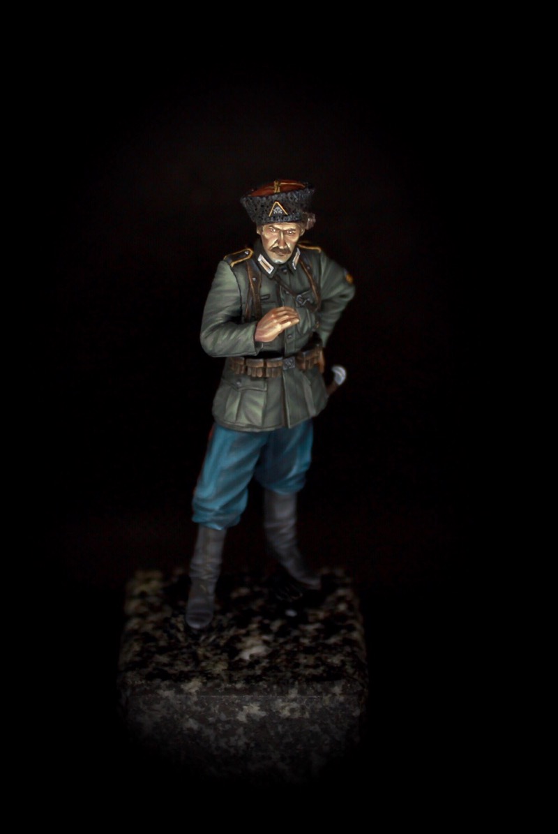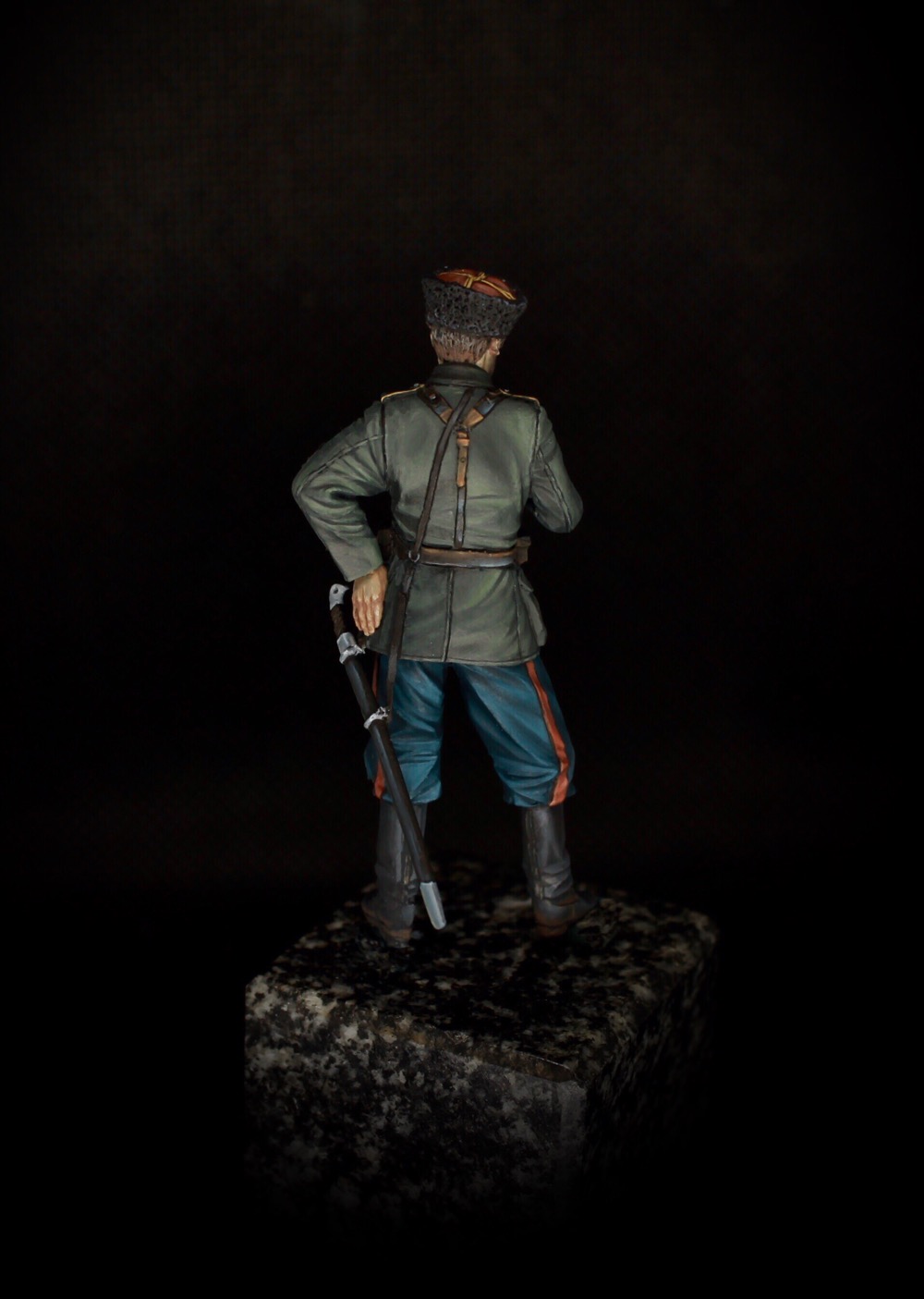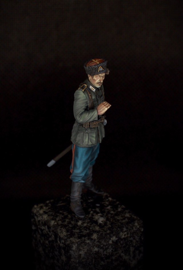 Роспись очень понравилась! Особенно лицо и китель. Живо смотрится. Выразительные эмоции! Только почему приборный цвет желтый? Вроде у казачьих частей приборный цвет был выбран красный при темнозеленом поле погон. И почему прибор шашки серебряный? Возможно не до конца знаком с матчастью...