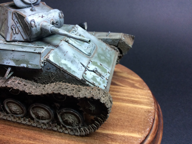 но... глушаки не живые, один тон ржавчины не предает реализма, вакуумная упаковка запасного катка смотрится чужеродно, сколы по всей машине очень странно выглядят да еще в таком количестве, полка оторвана а загрязнение будто полка есть.. Ну и главное, зачем вообще деревянная подставка???